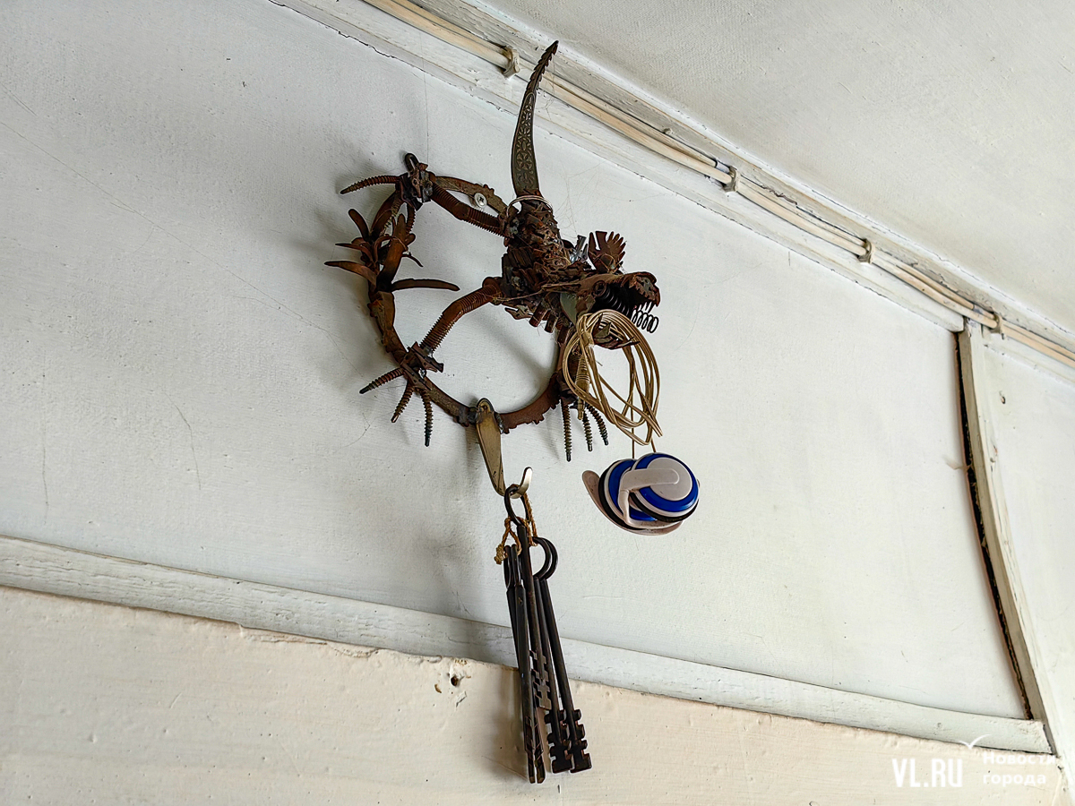 – Однажды я увидел, что болт – это коленный сустав какого-то динозавра. И с тех пор любая вещь может превратиться в игрушку. Чайнику, очень-очень старому, я сказал: мы тебя подлечим, и ты ещё поработаешь. И получился мудрец с посохом. Из зимнего вариатора и колючей проволоки получилась «Вариаторная душа». А вот фуражка молодого военного, моего знакомого. Привезли, чтобы не выбрасывать. Надо? – говорит. Я говорю – Давай, у меня есть куда её повесить, – рассказывает Андрей о своих творениях.