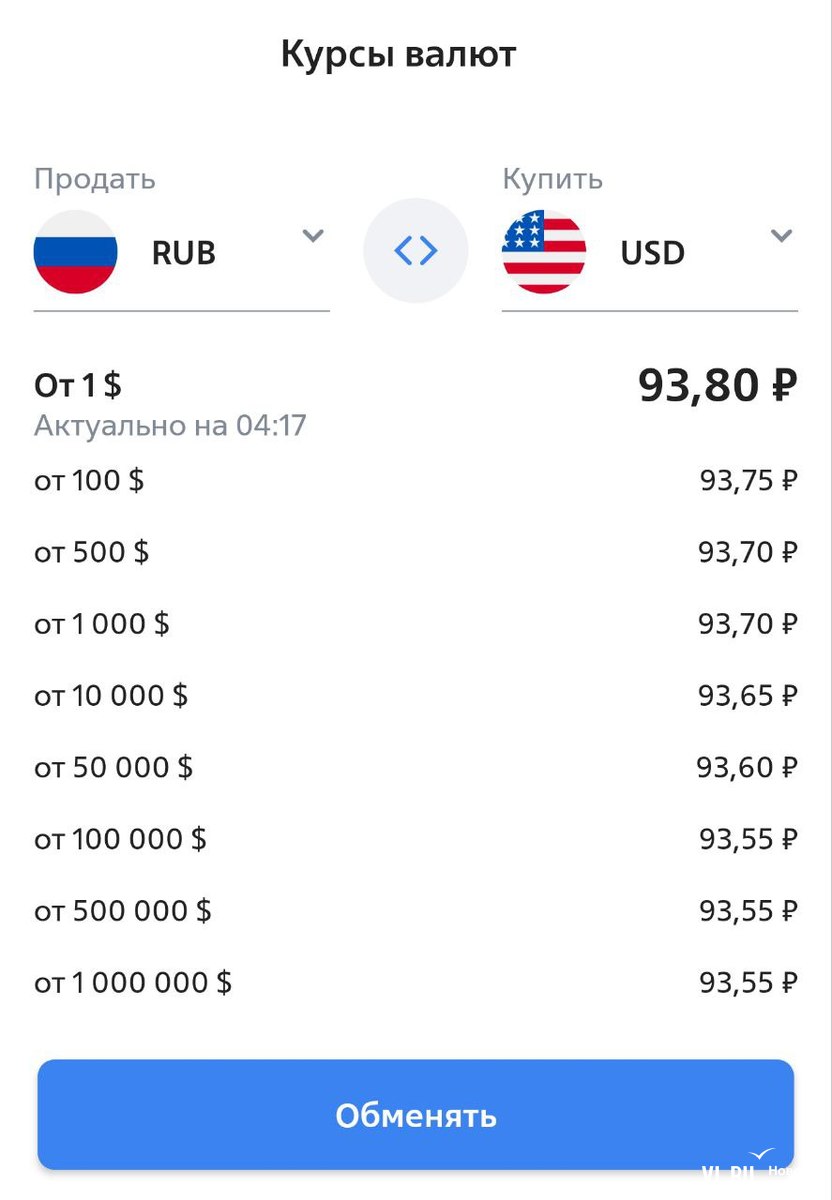 Купить доллар возможно и в мобильных приложениях банков. У Сбера доллар стоит 92,40 рубля, а продать его можно за 85,80. В офисах эта валюта стоит 94,5, а при обмене на рубли вам дадут за него от 85,40 до 88 рублей (в зависимости от отделения). В приложении Альфа-Банка кредитное учреждение покупает доллары за 85,99, а продаёт — за 93,69 рубля. Курс валют в ВТБ – 93,80 рубля, если покупать доллар, и 88,20 — если вам нужно его продать.