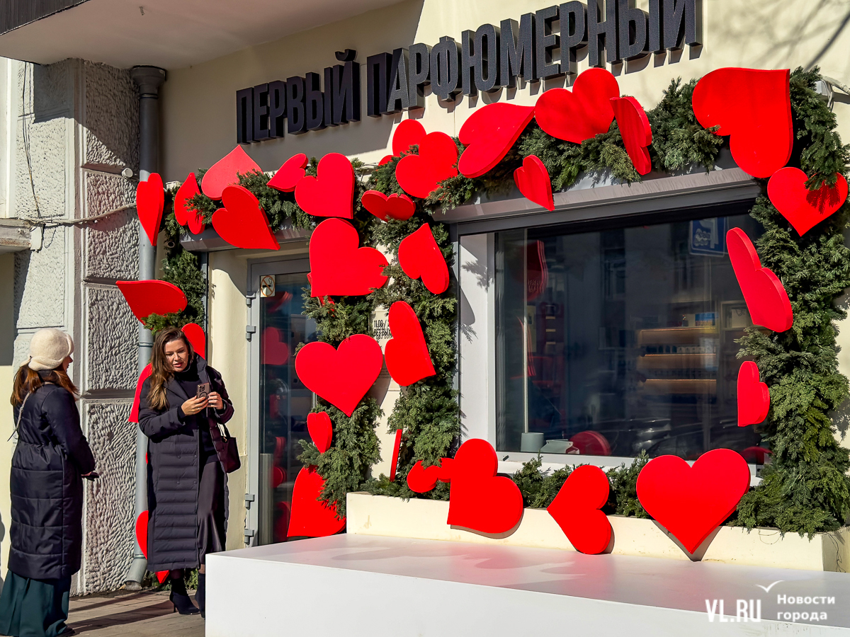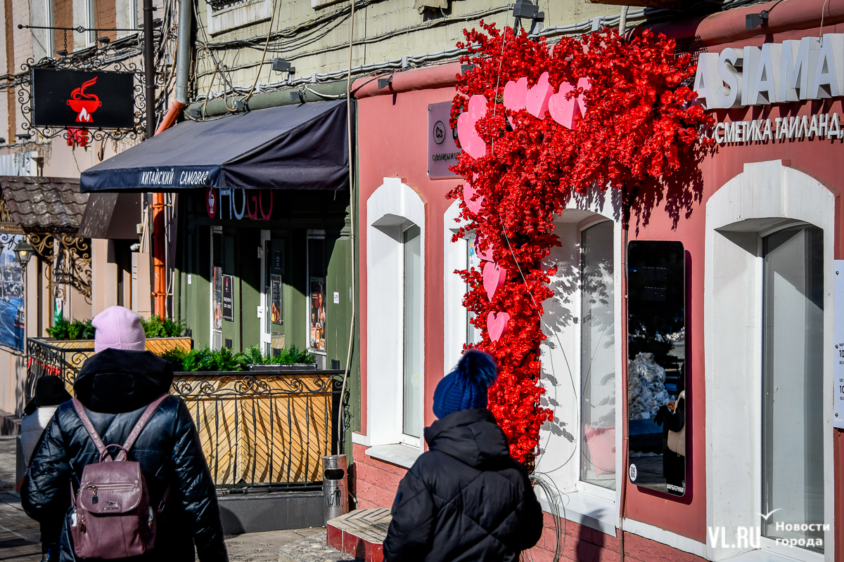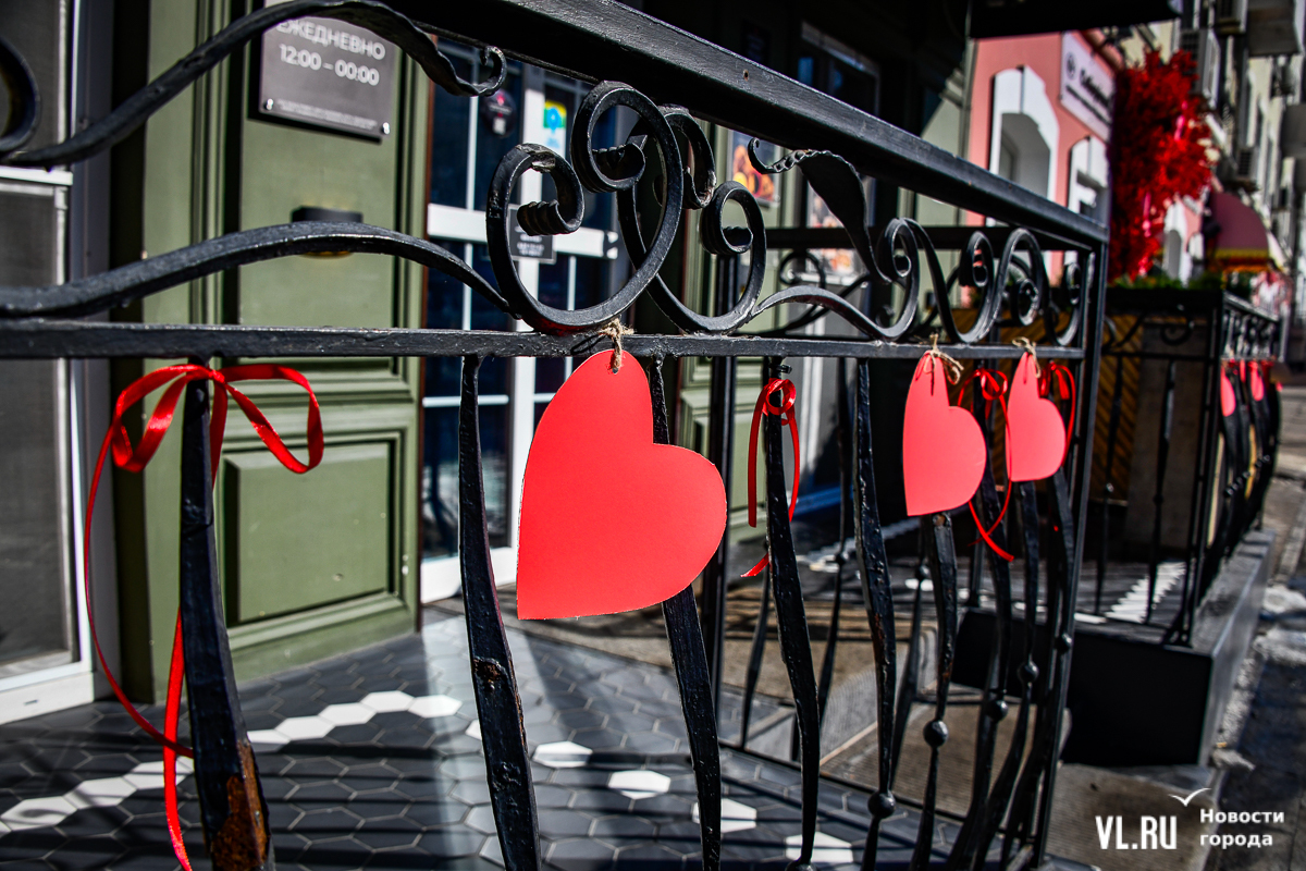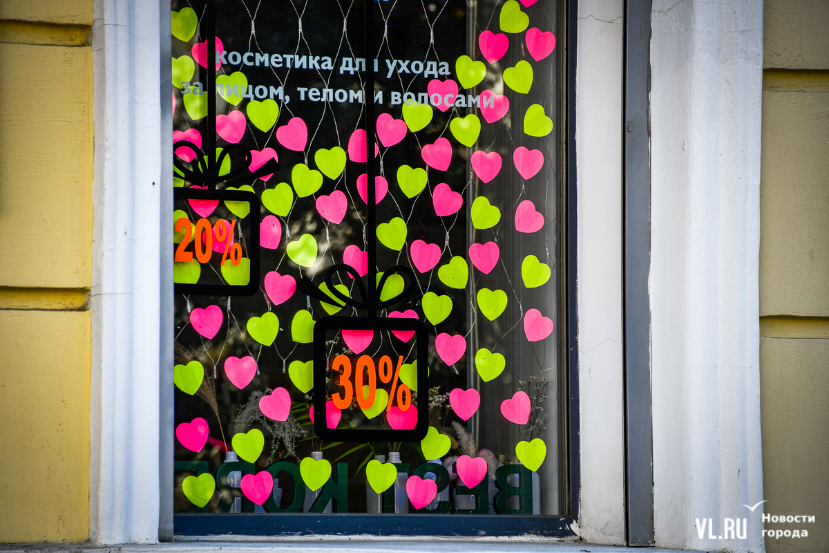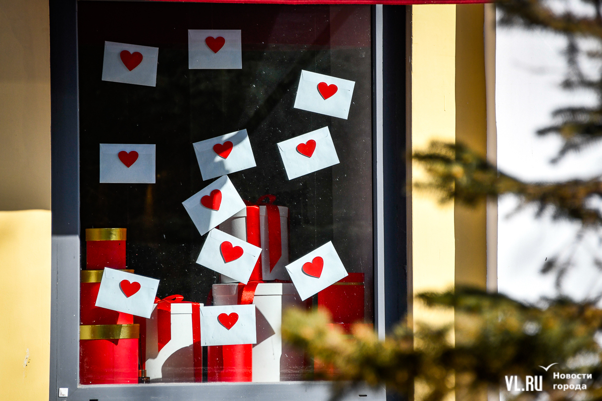 По сравнению с прошлым годом сегодня город практически не украшен. На главной пешеходной улице Владивостока лишь только три магазина развесили на витринах сердечки и атрибутику праздника. А на окнах одного ресторана из шариков написали слово «Love», правда, изнутри, поэтому прохожим с улицы нужно читать его зеркально.