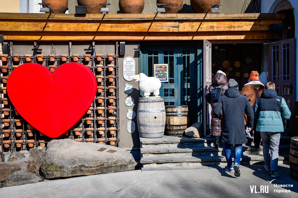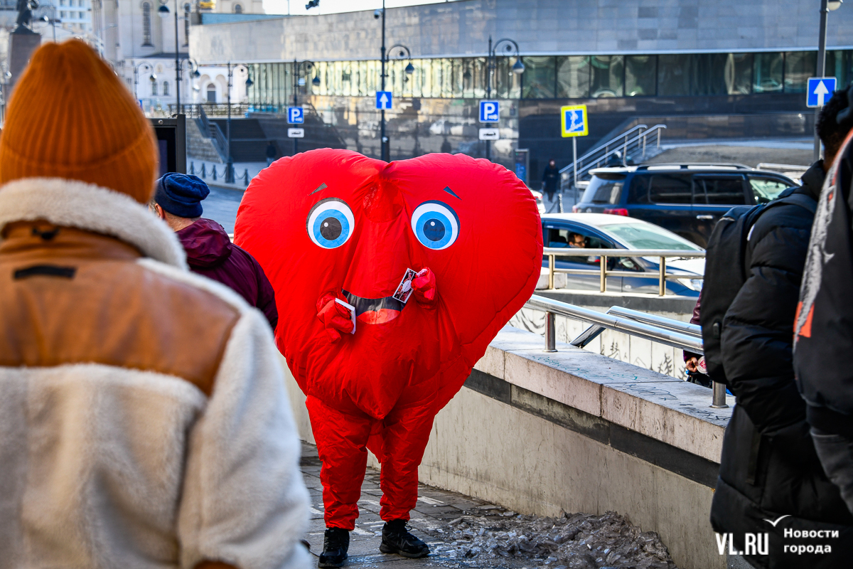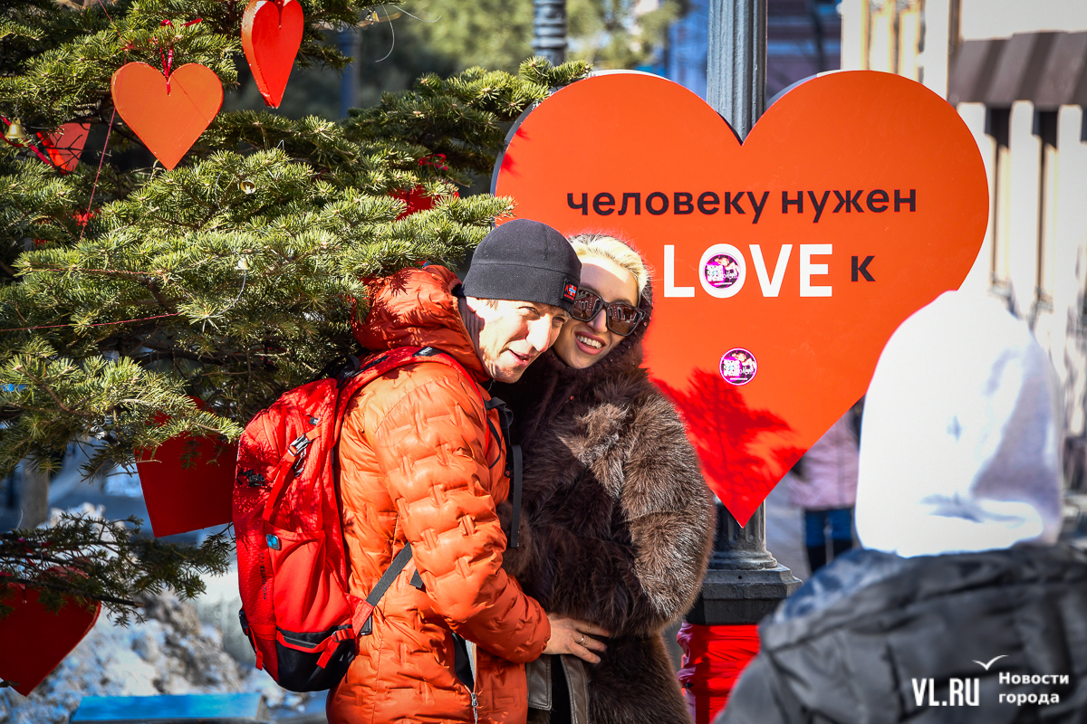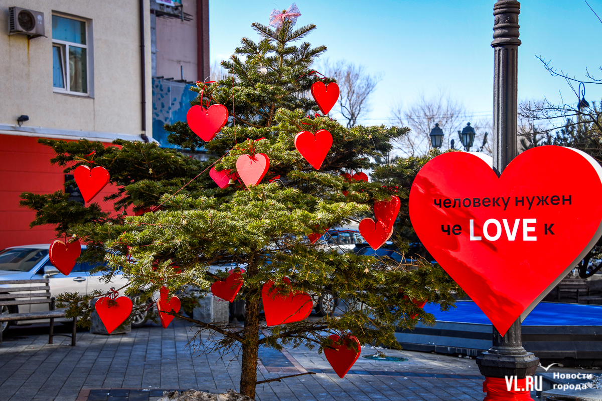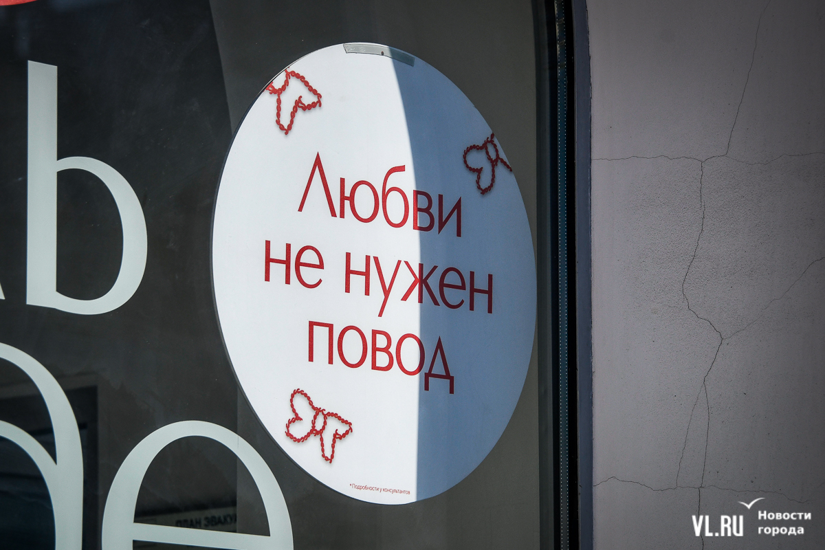 По сравнению с прошлым годом сегодня город практически не украшен. На главной пешеходной улице Владивостока лишь только три магазина развесили на витринах сердечки и атрибутику праздника. А на окнах одного ресторана из шариков написали слово «Love», правда, изнутри, поэтому прохожим с улицы нужно читать его зеркально.