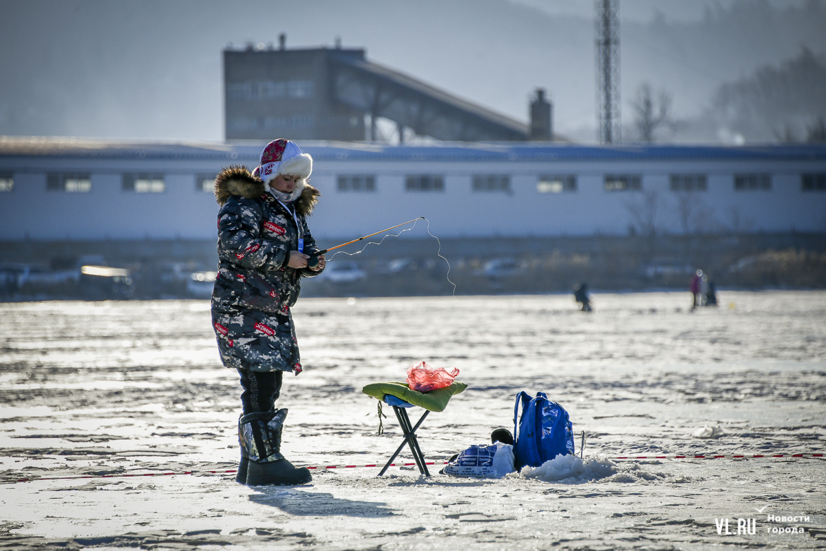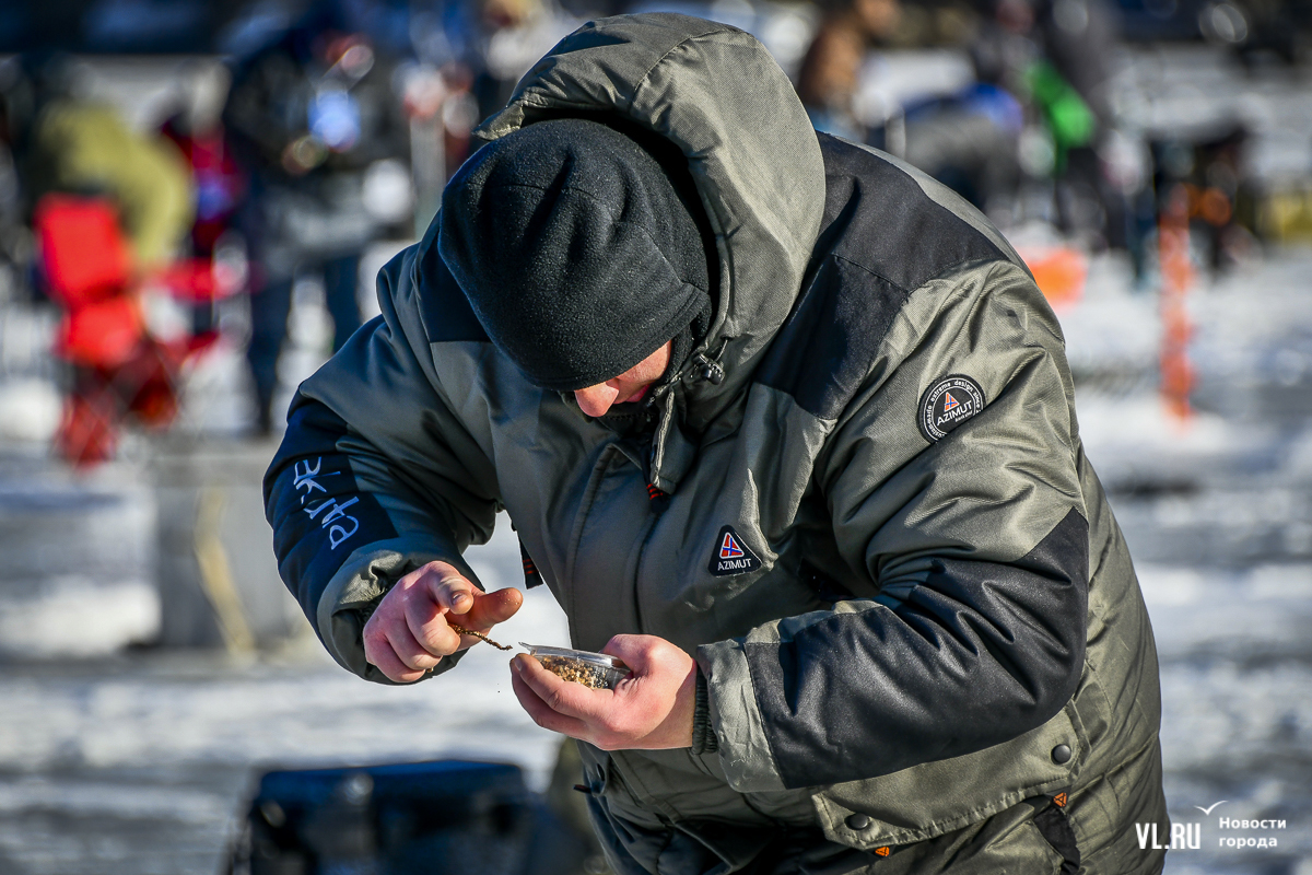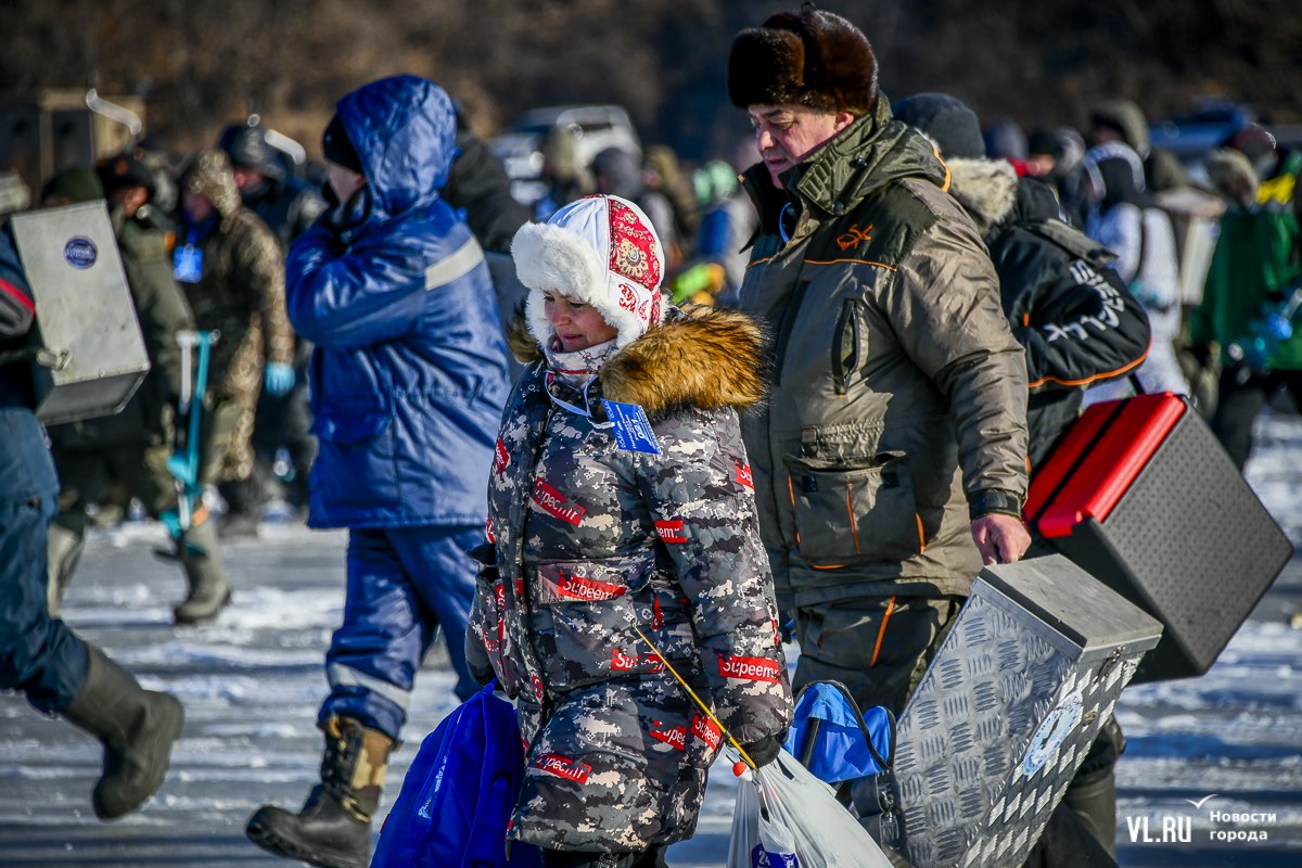 В морском городе рыбак с коробом за спиной – персонаж вполне привычный. Сегодня на Океанской было 500 таких персонажей. И в каждом рыболовном ящике – целый мир: короткие удочки, половники с дырками, чтобы убирать лёд из лунок, наживки, поплавки и другие снасти.