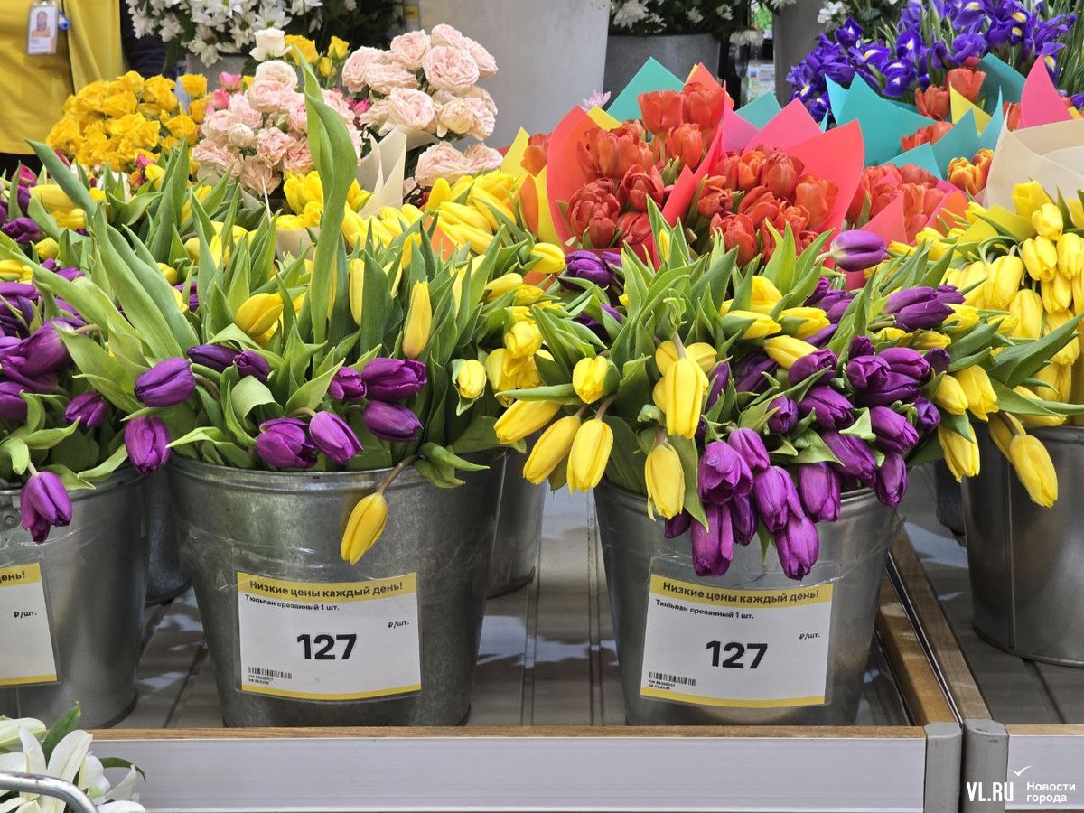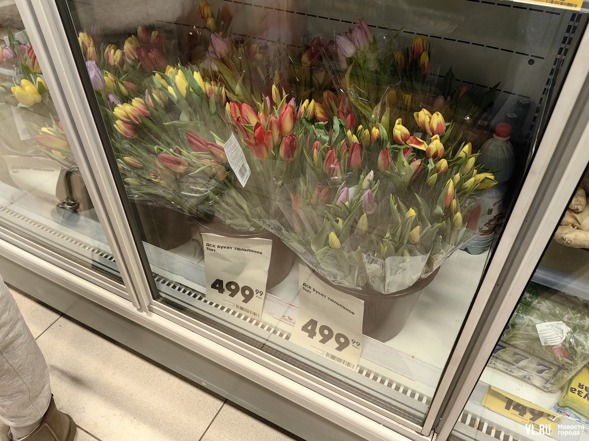 Самые дешёвые тюльпаны традиционно стоят в холодильниках супермаркетов и центре залов хозяйственных магазинов. В «Пятёрочке» корреспондент Новостей VL.ru нашёл готовые букетики в плёнке за 500 рублей, или 100 рублей за штуку. В бывшем «Леруа Мерлен» цветы продают по одному, по 127 рублей за штуку (или по 635 рублей за пять штук, если собрать самостоятельно).