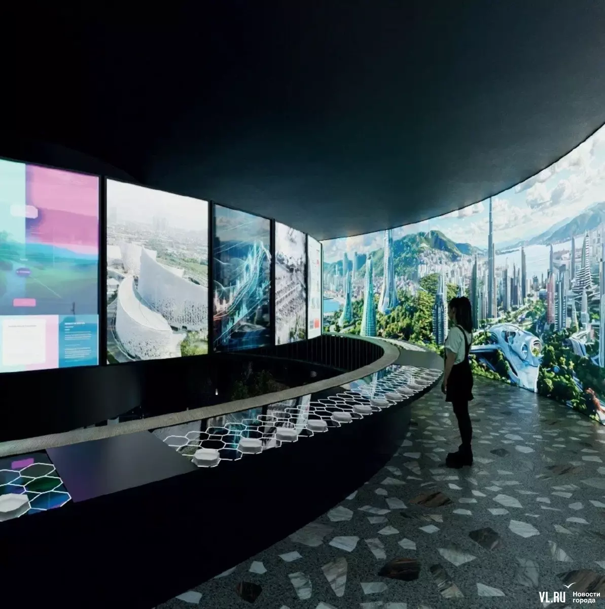 «Здесь разместим выставку достижений Приморья. Внизу – зал сегодняшний, а этот зал того, что будет завтра. Мы хотим, чтобы гости получили эмоции. Внизу – серьёзные мультимедийные решения. А при подъёме наверх, надеемся, люди будут задерживать дыхание от удивления. Обычно делают сверху вниз, а мы – наоборот. Поднимаемся, идём вперёд. Здесь будет достаточно большая зона. И в первый этап войдёт ещё вот это помещение, там тоже разместят коворкинг».