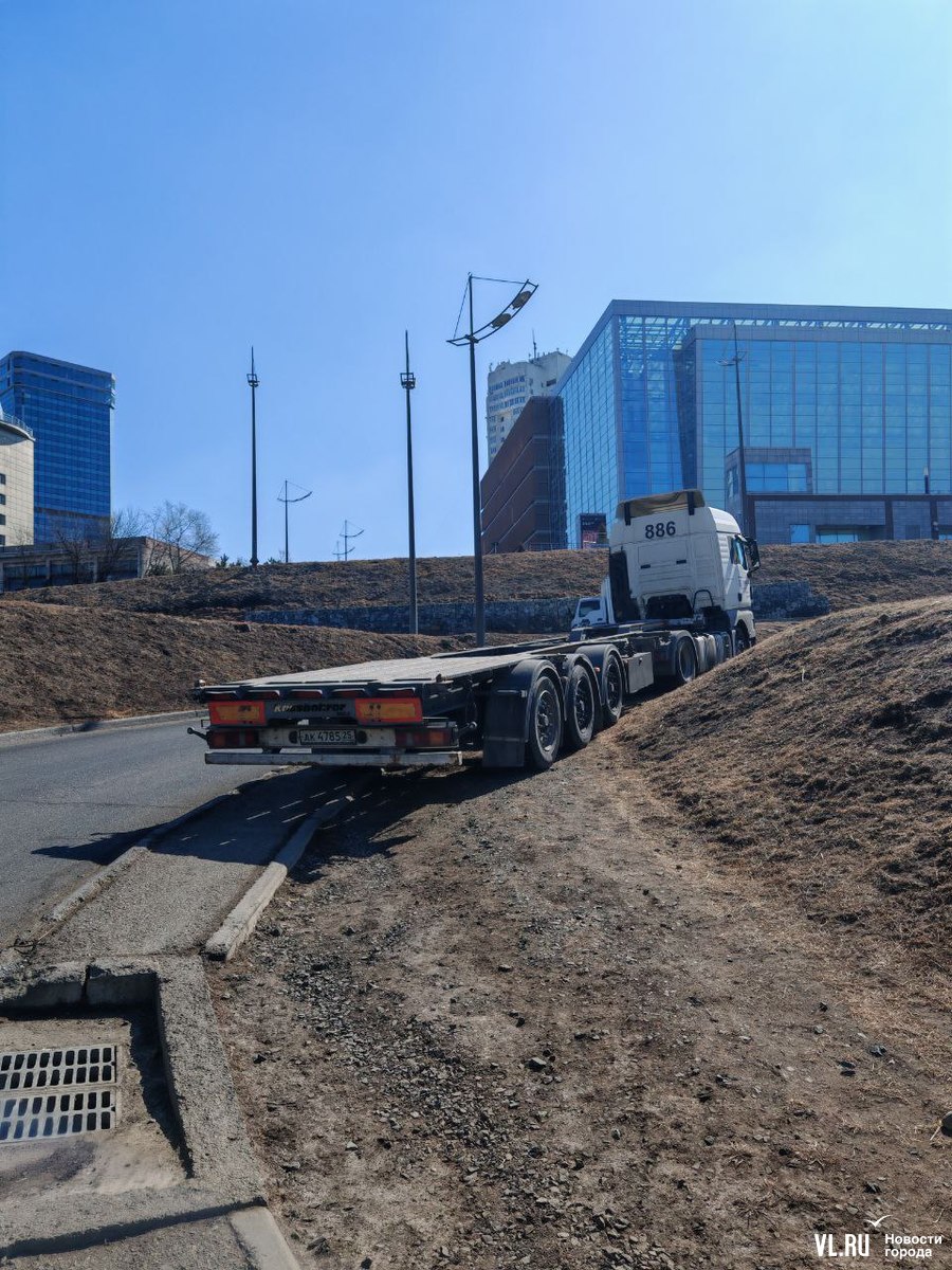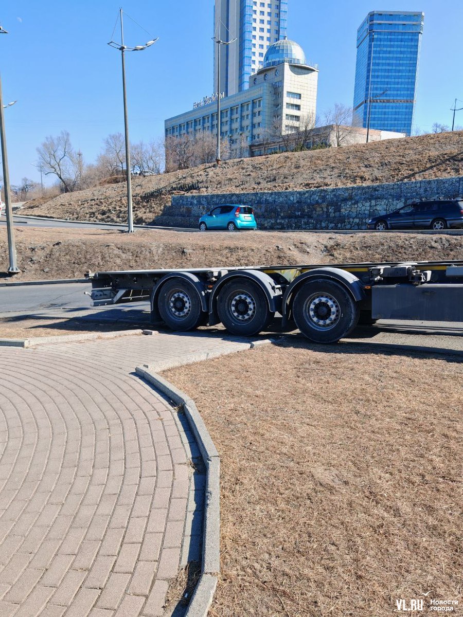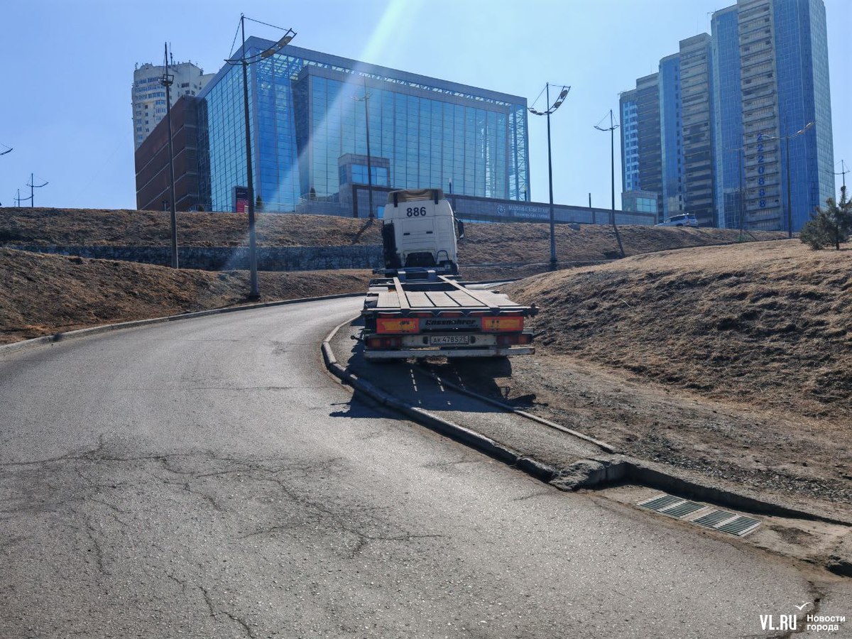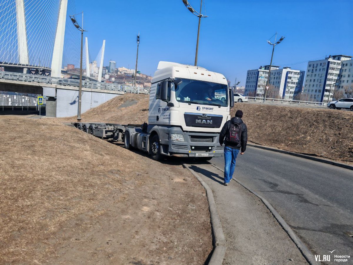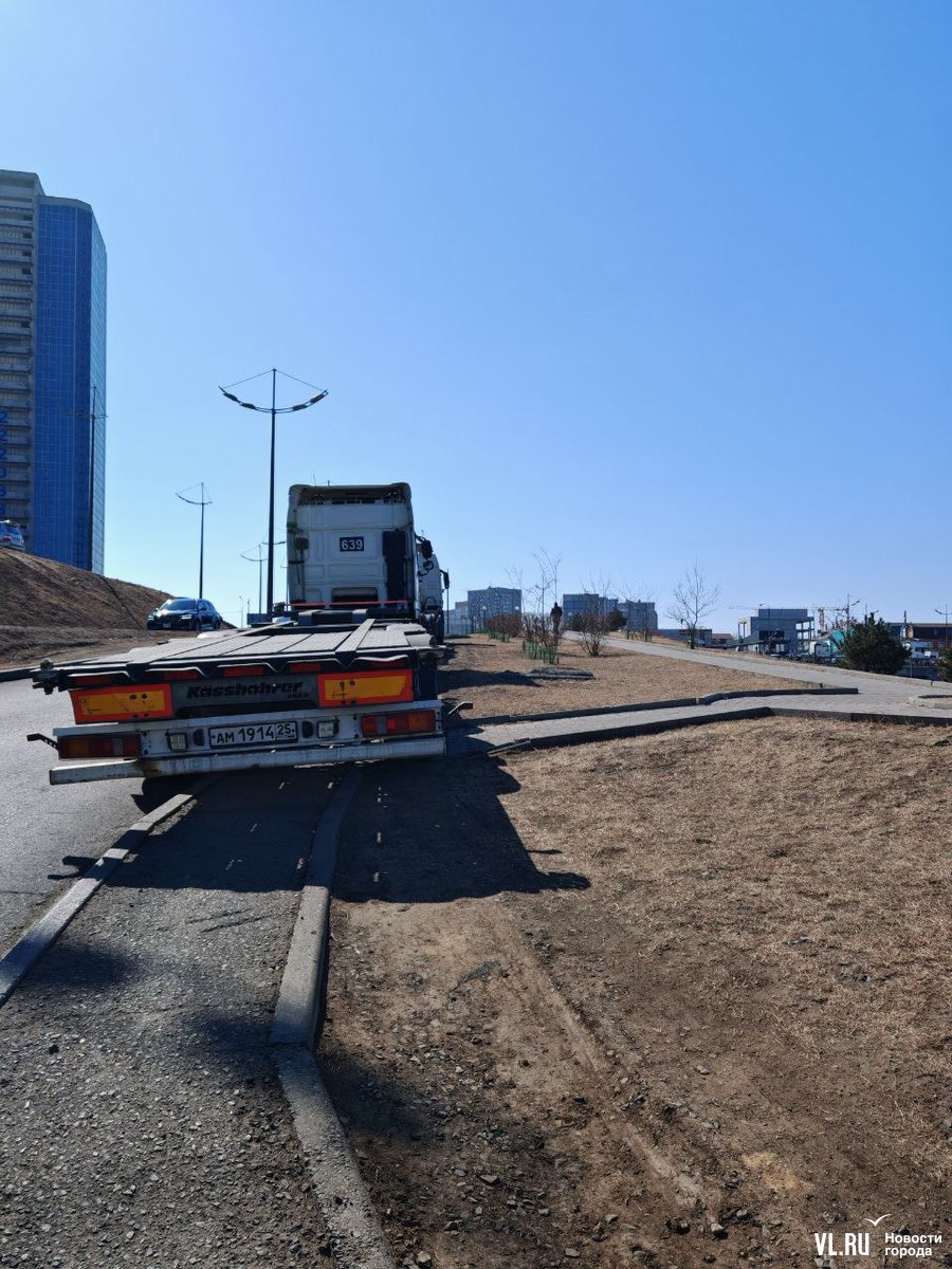 Жители Владивостока продолжают жаловаться на большегрузы, которые запарковывают дороги в Первомайском районе в ожидании погрузки в портах. Только теперь они пошли дальше и буквально выгнали пешеходов с тротуаров, а порой паркуются даже на газонах, утрамбовывая колёсами грунт. Такую картину наблюдали вчера горожане на автомобильной развязке возле Золотого моста со стороны оперного театра.