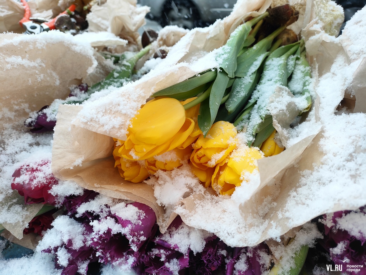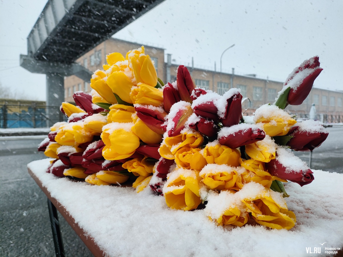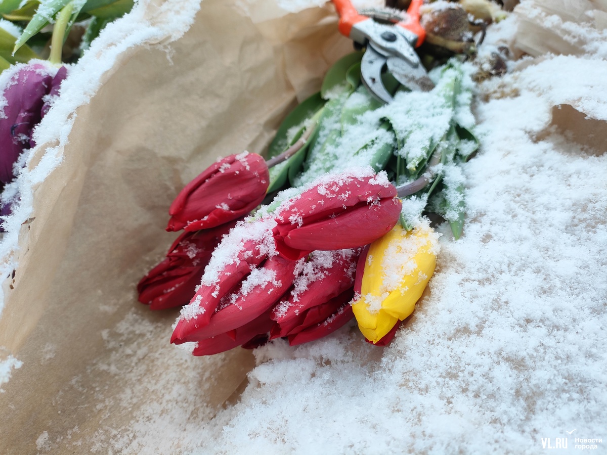 Необычно теперь выглядят автолавки, развернувшие торговлю тюльпанами по всему городу. Теперь цветы украшают хлопья снега. А охранять товар, кажется, стало сложнее. Но покупателей снегопад пока не пугает.
