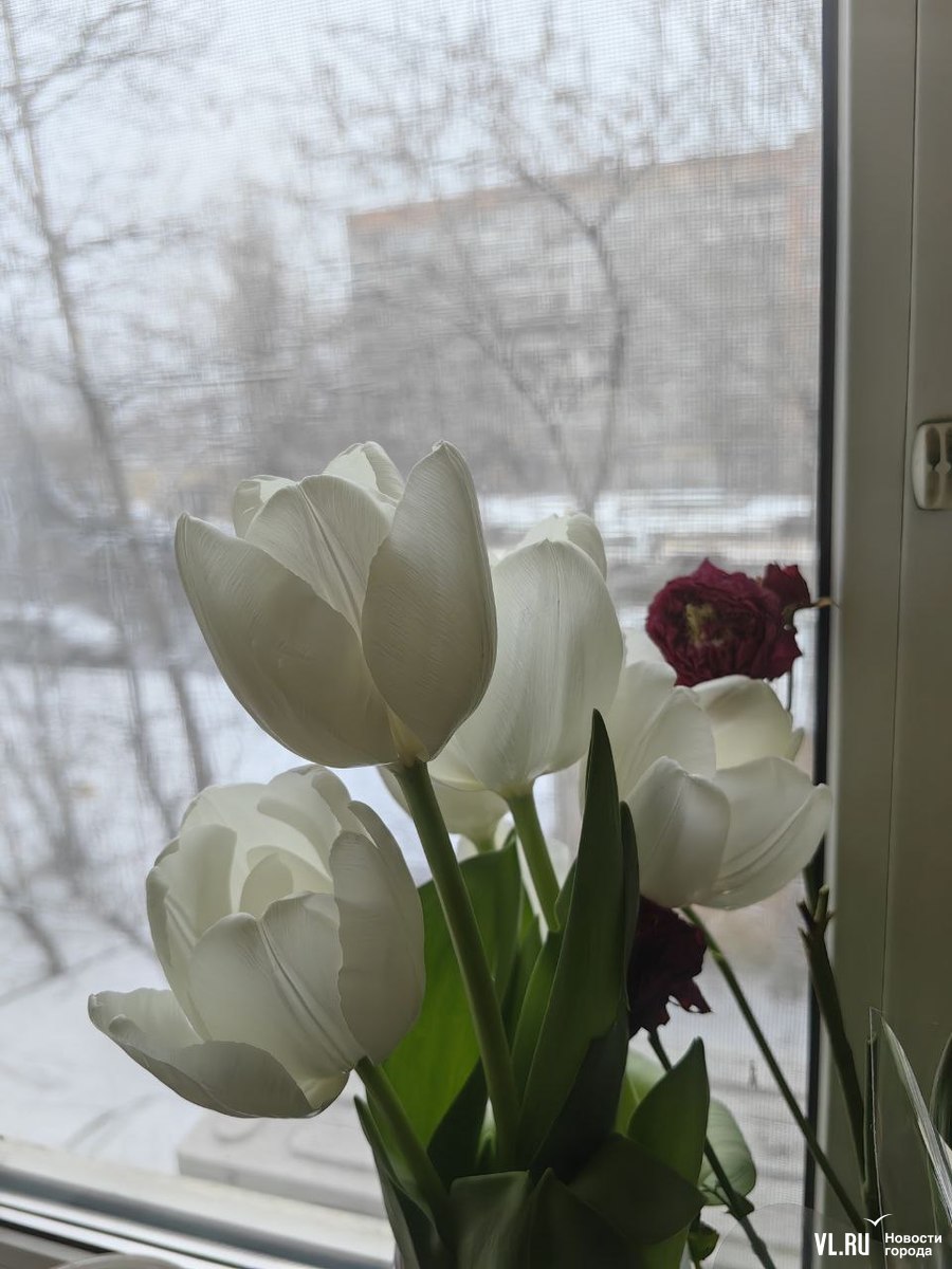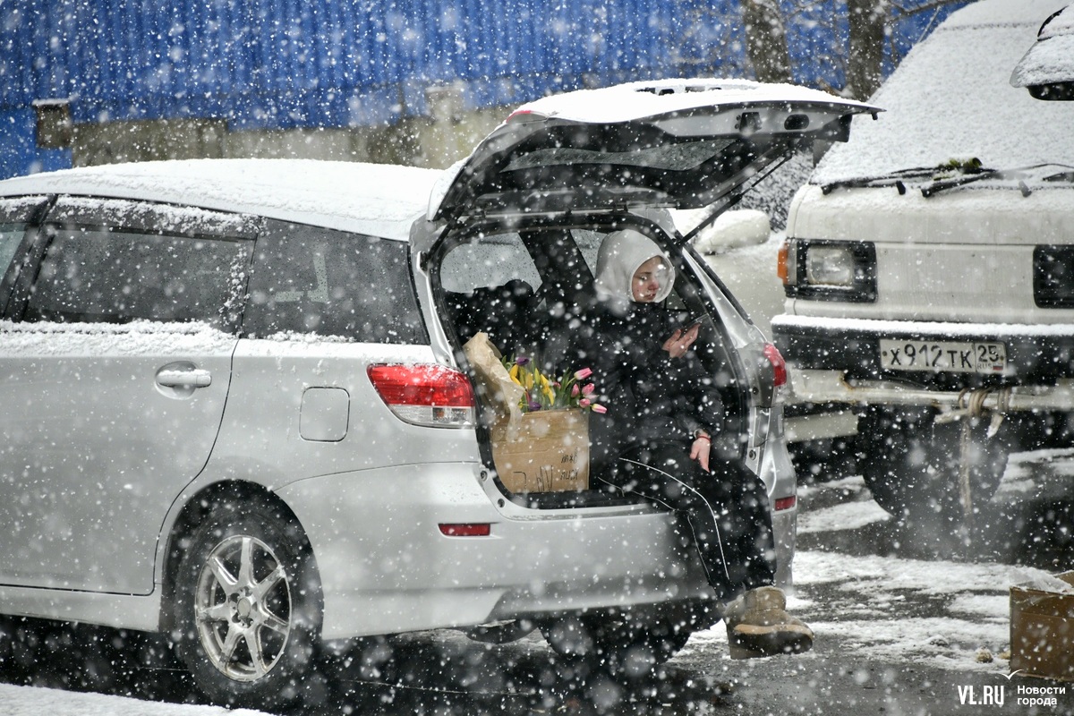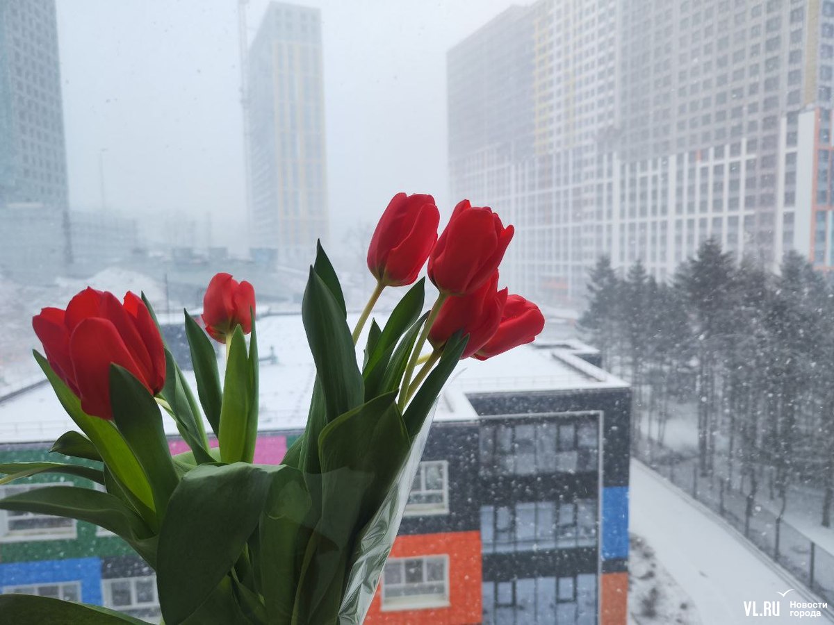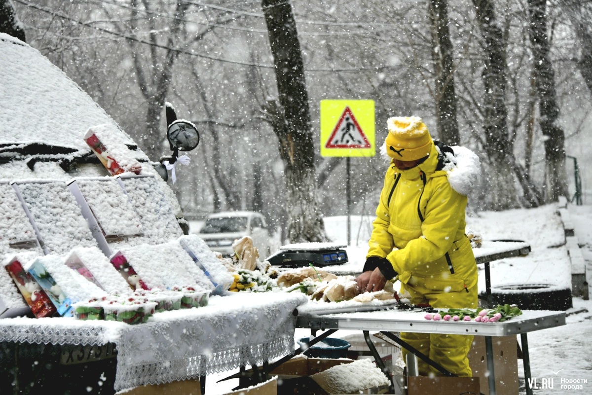 Необычно теперь выглядят автолавки, развернувшие торговлю тюльпанами по всему городу. Теперь цветы украшают хлопья снега. А охранять товар, кажется, стало сложнее. Но покупателей снегопад пока не пугает.