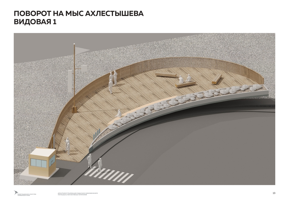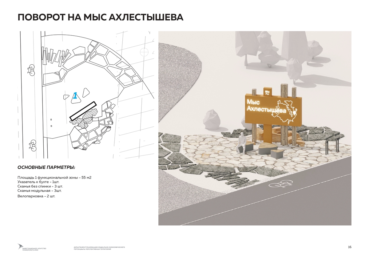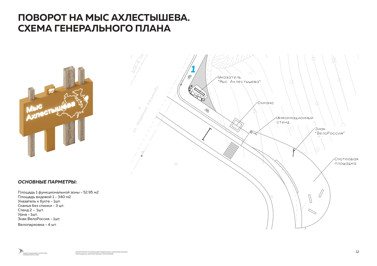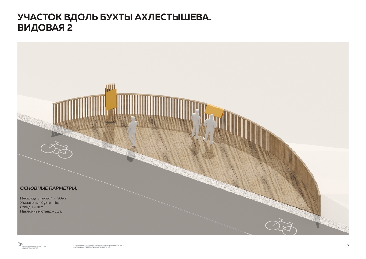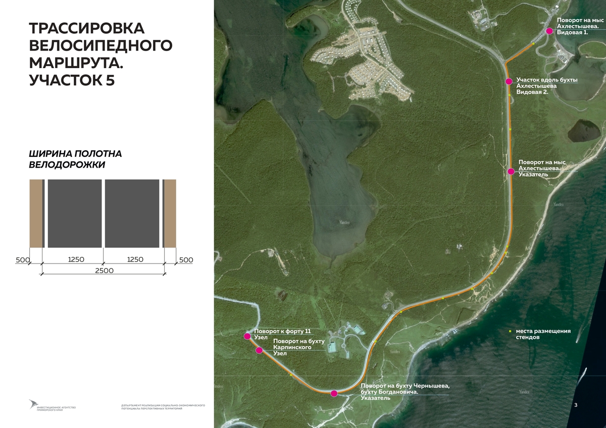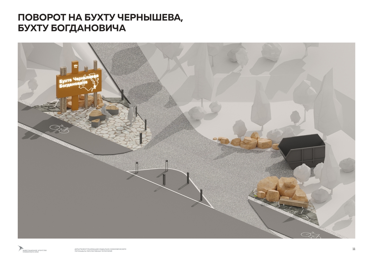 Согласно аукционной документации, подрядчику нужно будет разработать план организации земельных участков, озеленения, расстановки малых архитектурных форм, знака «Нулевой километр велодорог России». Участков два. Первый – от поворота на пляж Ахлёстышева до поворота к бухте Карпинского и форту № 11. Второй – продолжение уже действующей 1,4-километровой велодорожки в районе Ахлёстышева до моря.