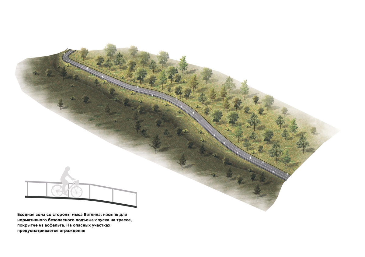 В проекте, помимо обустройства велодорожек, ливнёвок и подпорных стен, нужно предусмотреть размещение двух видовых площадок в районе Ахлёстышева. Также в списке несколько зон отдыха со скамейками и урнами, два туалета, пункт проката, три площадки сервиса и торговли, парковки, технические средства организации дорожного движения, в том числе велосветофоры.