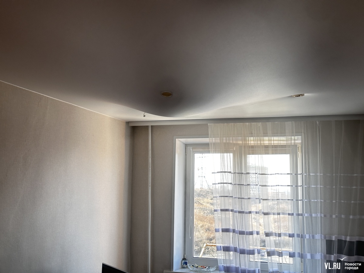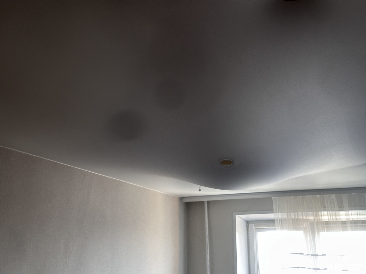 Затопленная квартира имеет две комнаты – пострадали обе. Больше всего досталось «детской». Часть натяжного потолка оборвалась, а на полу лежат мокрые тряпки и вёдра, в которые до сих пор капают остатки воды. Состояние второй комнаты получше, там в натяжном потолке скопилось лишь чуть-чуть воды. Хотя, как отмечает Алтына, её уже сливали, но набежало ещё.