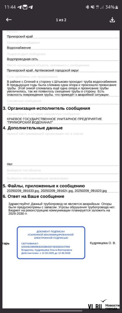 Иронично, что примерно неделю назад Примводоканал в официальном ответе сообщил местным жителям, что трубопровод не является аварийным, опоры были предусмотрены с запасом и угрозы обрушения водопровода нет. Бюджет на реконструкцию коммуникации планируется заложить на 2029-2030 гг.