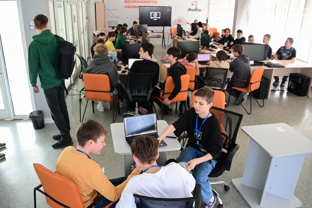 В 12 часов начался тестовый тур, а затем и основное соревнование. Для студентов и 11-классников выделили зону на первом этаже, а школьников 4-10-х классов распределили по аудиториям на третьем этаже «Кванториума».