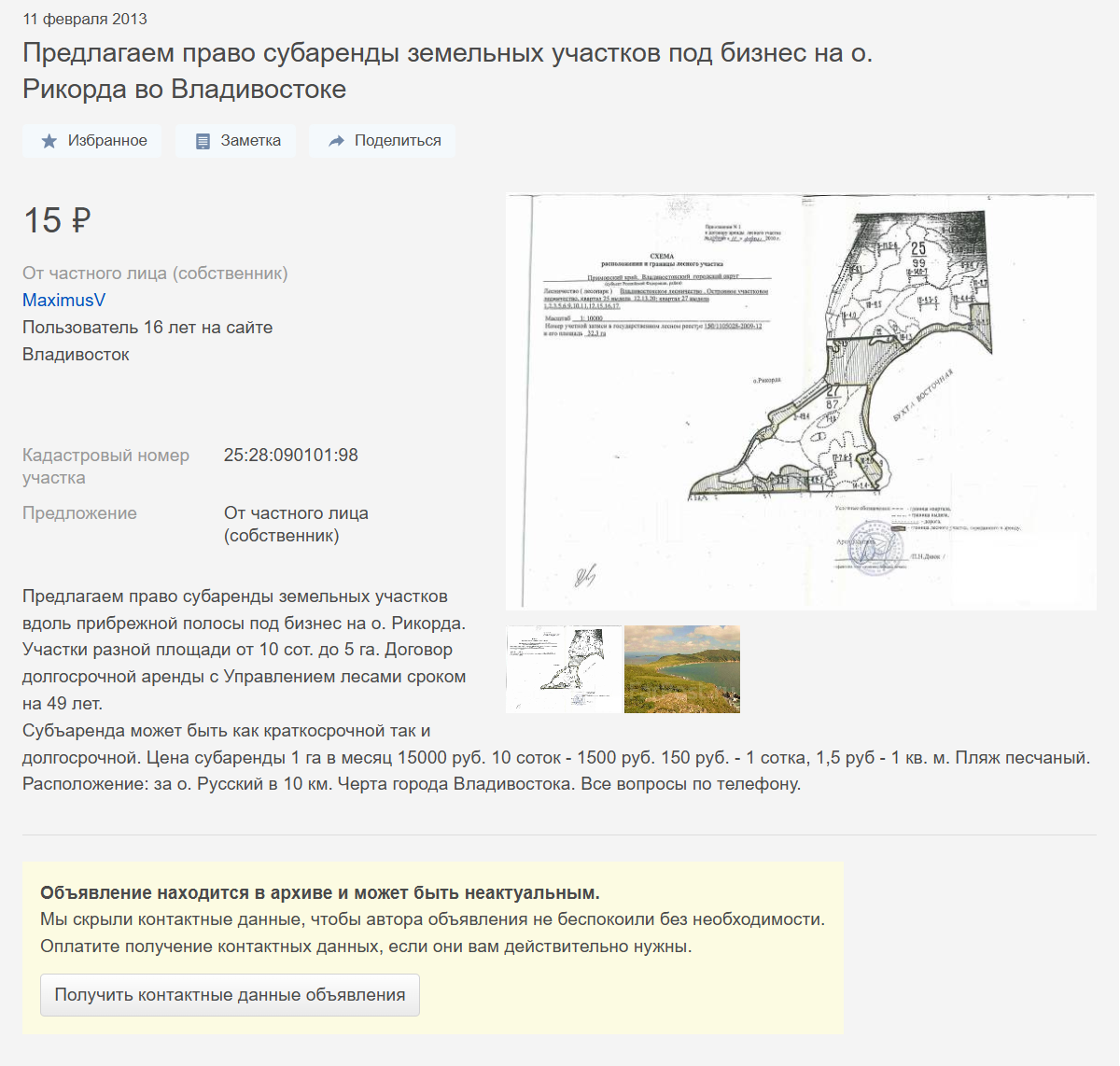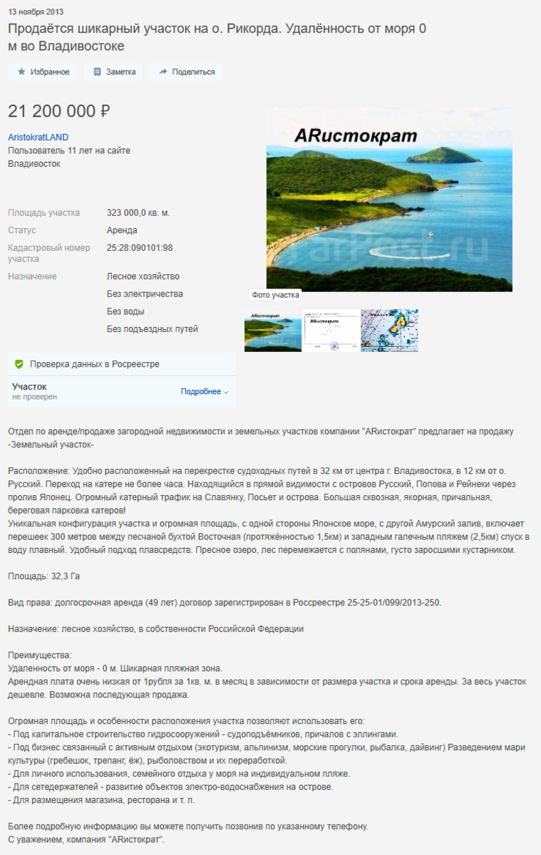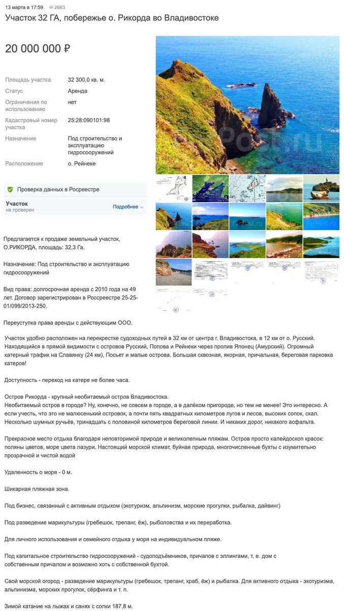 Объявление о продаже права аренды или доли в уставном капитале компании-арендатора части острова Рикорда за 20 млн рублей появилось на одном из сайтов в интернете. Остров является необитаемым, но относится к Владивостокскому городскому округу. Его площадь – почти 500 гектаров, из них в аренду предлагают 31,6 га. Правда, после огласки информации в соцсетях объявление было удалено. Однако удалось проследить историю владения этим участком, где нынешние арендаторы хотели в своё время построить некие гидротехнические сооружения.