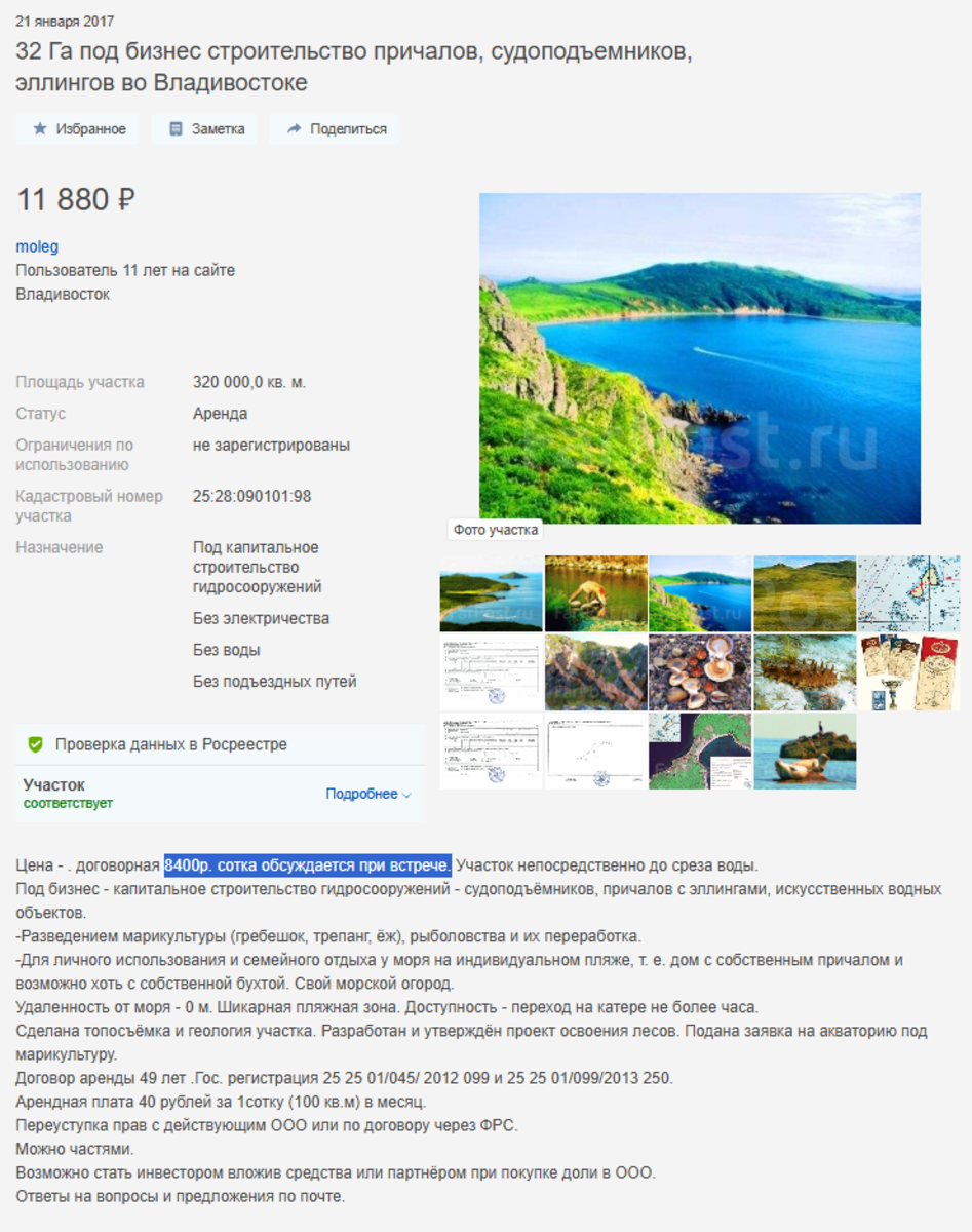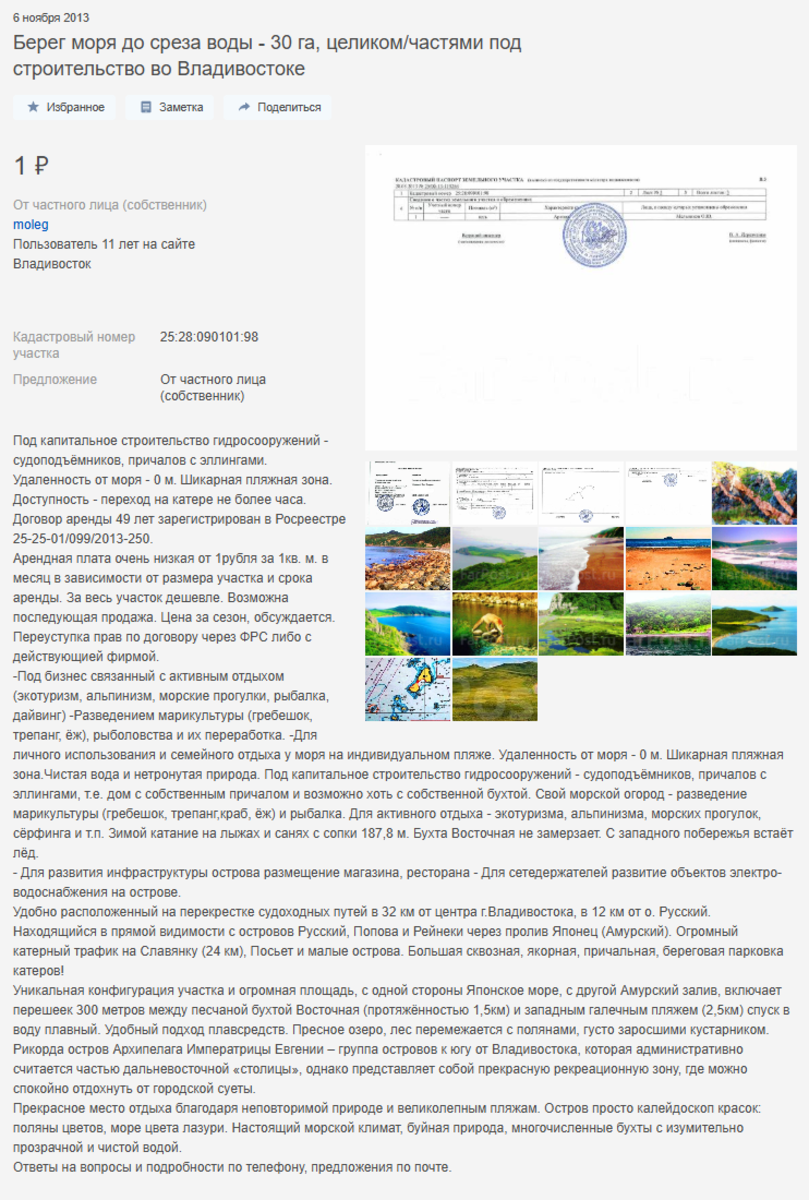 Интересно, что в объявлении расписывают редкую привлекательность земли: удобное расположение «на перекрёстке судоходных путей», час на катере от Владивостока, огромный трафик судов, уникальная конфигурация участка и так далее. А вот в суде, когда арендатор пытался сбить ставку аренды, он упирал на то, что остров Рикорда «находится в удалённом и труднодоступной месте залива Петра Великого, является необитаемым, не имеющим дорог, причалов, регулярного транспортного сообщения (паромной переправы), инженерной и других видов инфраструктуры, свойственной для любых населённых пунктов».