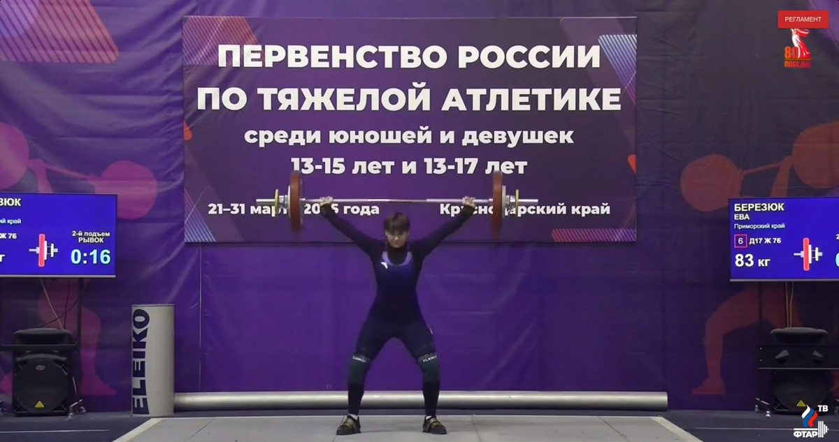 Ева Березюк, выступавшая в весовой категории 76 кг среди девушек 15-17 лет, выполнила рывок штанги 80 кг и толчок 105 кг, установив личный рекорд, рекорд Владивостока и Приморского края в этом возрасте. Девушка стала серебряным призёром, выполнив норматив мастера спорта. Тренируют её Елена Лепина и Алексей Мелентьев.