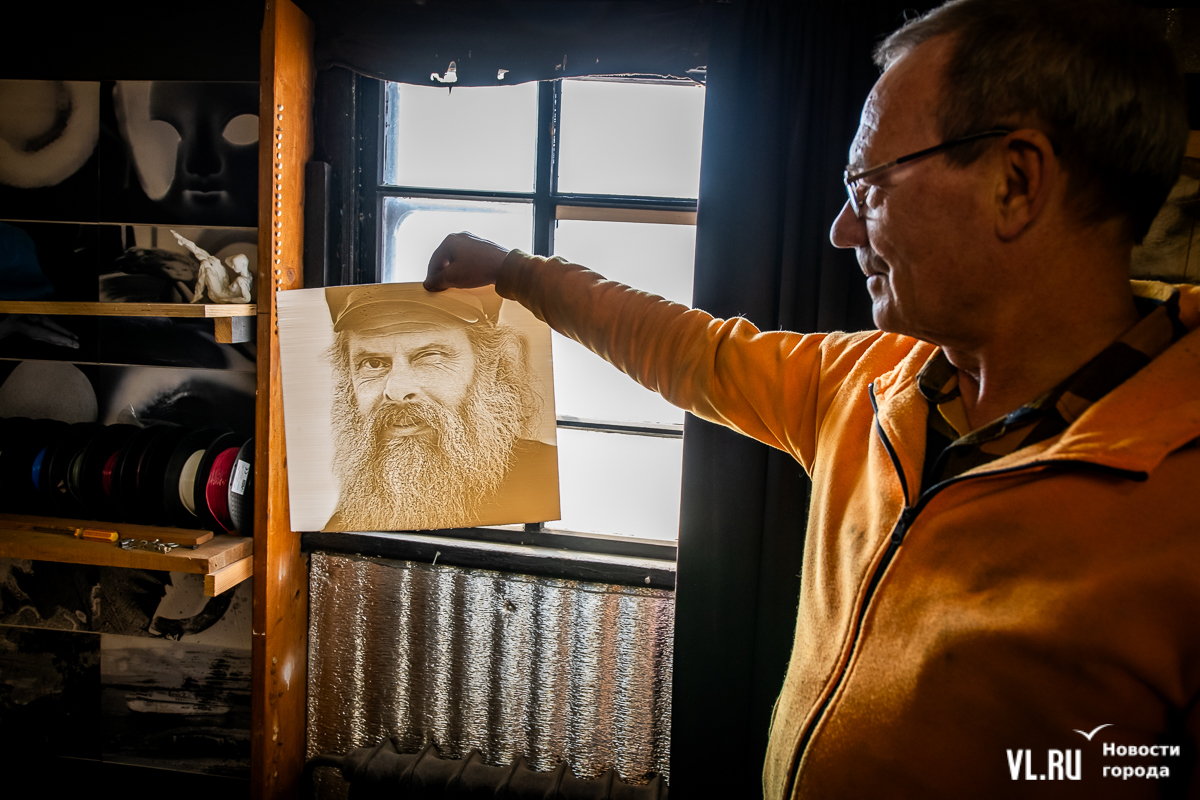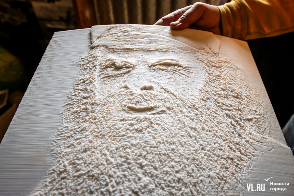 Павин берёт форму, подносит к свету, и проявляется бородатое лицо. Комментирует: «Кудрявцев на свету» (Джон Кудрявцев, художник, график, карикатурист, которого при жизни называли живой достопримечательностью Владивостока, умер в 2016 году. — Прим. ред.). Тоже 3D-печать.