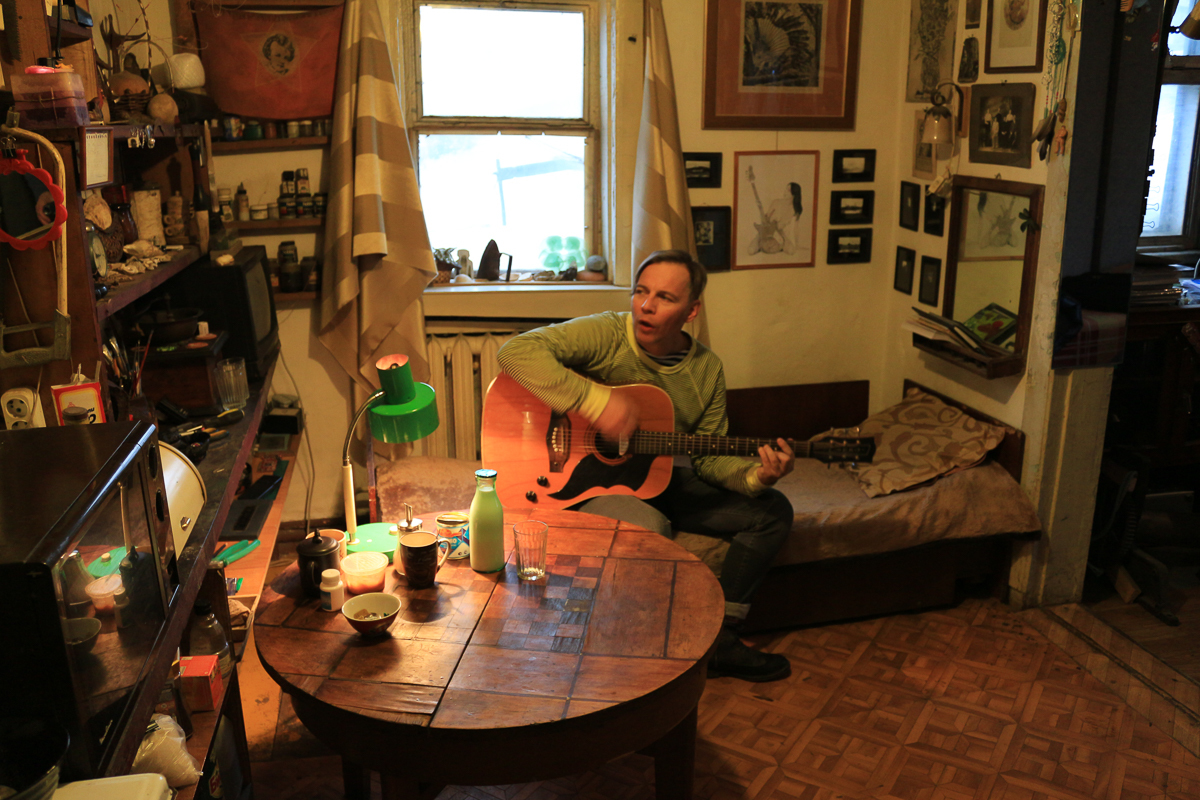 В кадре Лагутенко сидит на диване у окна. Кухонное окно на месте, а вот дивана нет: