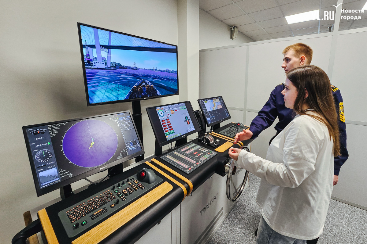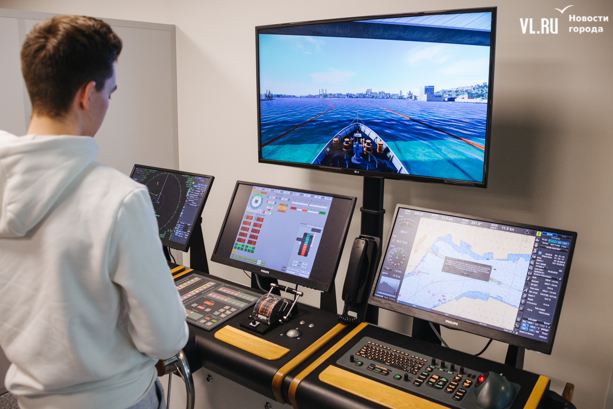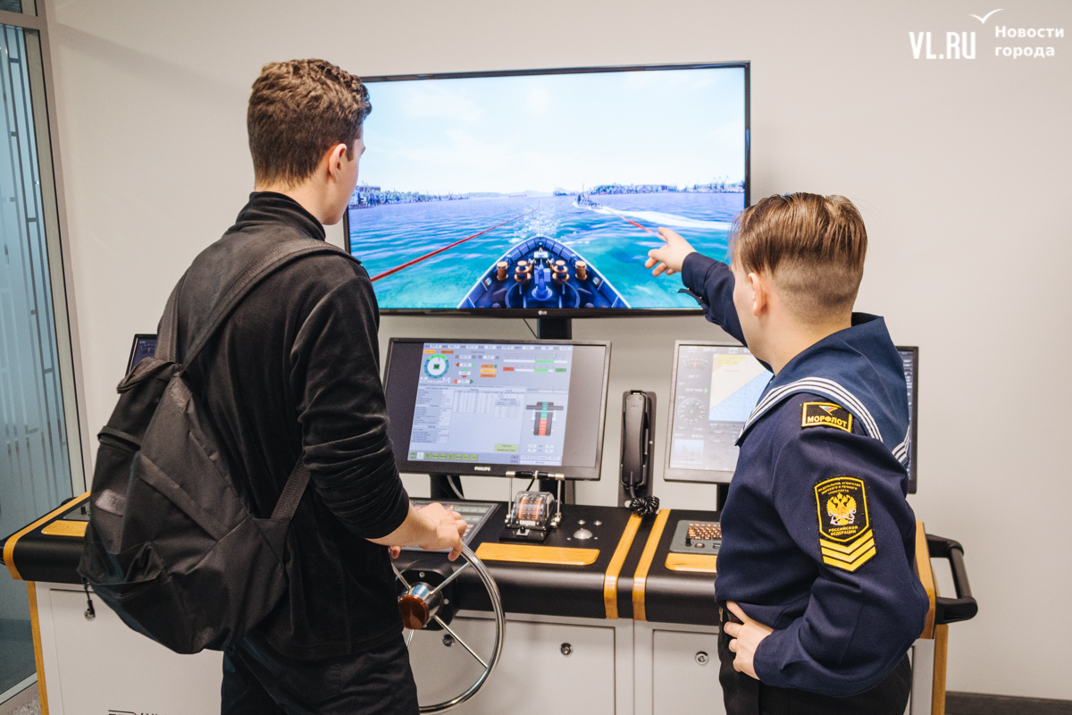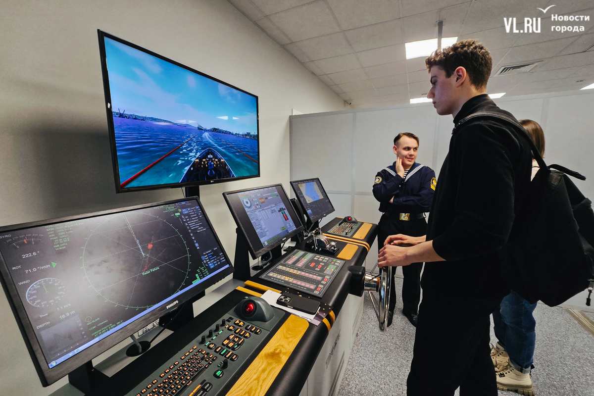 Так, абитуриентам предлагали с помощью компьютера рассмотреть машинное отделение судна, узнать больше об атомных ледоколах, а также пройти на тренажёре капитанского мостика по акваториям Владивостока.