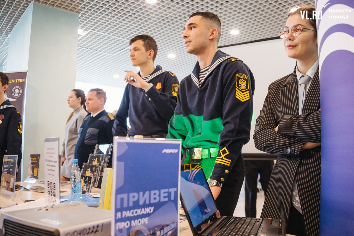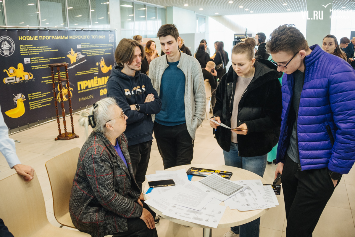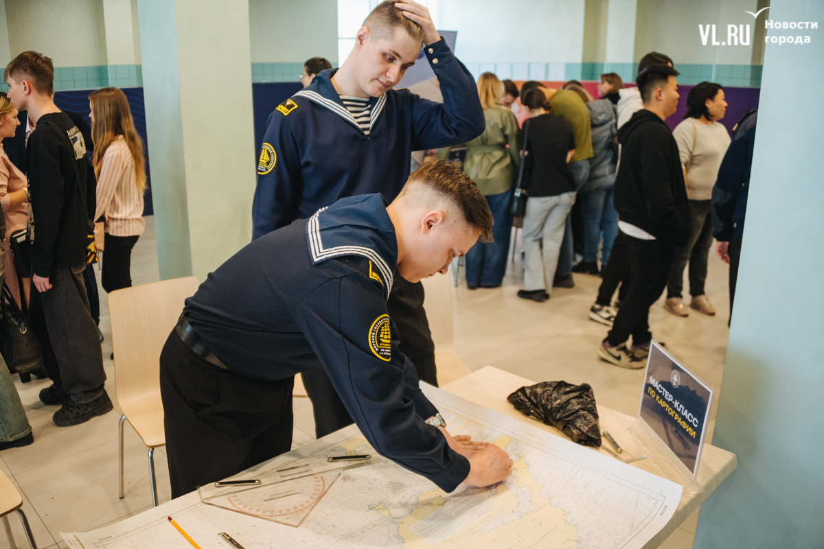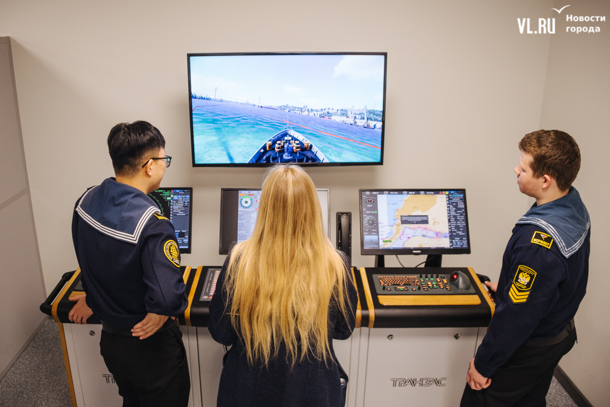 Так, абитуриентам предлагали с помощью компьютера рассмотреть машинное отделение судна, узнать больше об атомных ледоколах, а также пройти на тренажёре капитанского мостика по акваториям Владивостока.