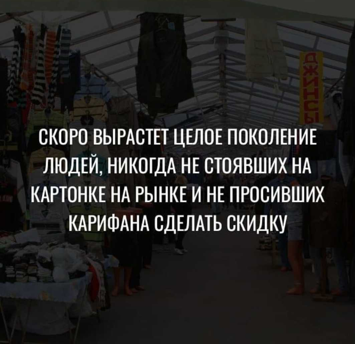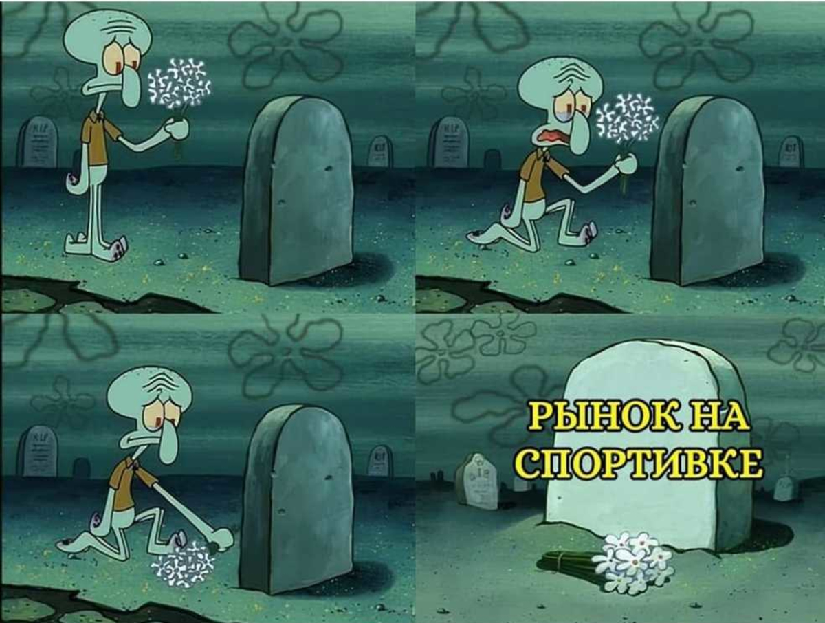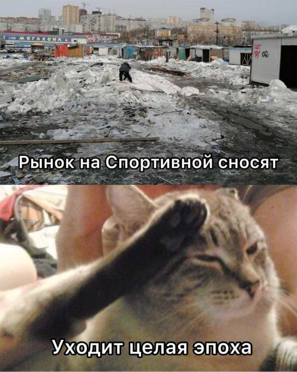 Пока закончим историю мемов на закрытии рынка на Спортивной. «Эпоха уходит», – писали пользователи социальных сетей. И, разумеется, делали мемы. Котик, отдающий честь местному воплощению международной торговли, чёрно-белая надпись «скоро негде будет купить пару носков и труселей за 300 рублей» на фоне разваленных павильонов.