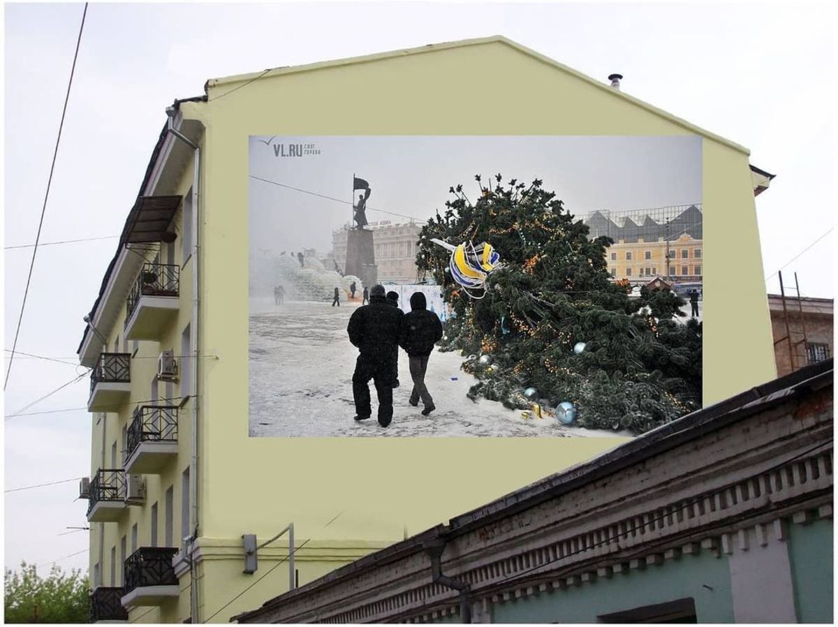 Как же без реакции на выдающиеся архитектурные решения, создающие благодатную почву для владивостокских интернет-троллей. Вспомнить хотя бы «бетонные лавочки Гуменюка» за 11 млн рублей. Предложение заменить нарисованный парусник на стене дома на Алеутской стало ещё одним вызовом для пользователей сети. Что там только не рисовали – в том числе и «мемную рекурсию» с упавшей на центральной площади ёлкой.