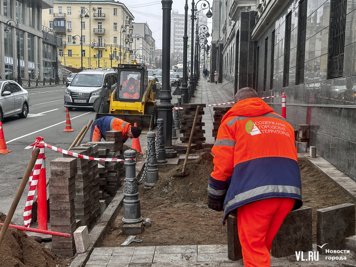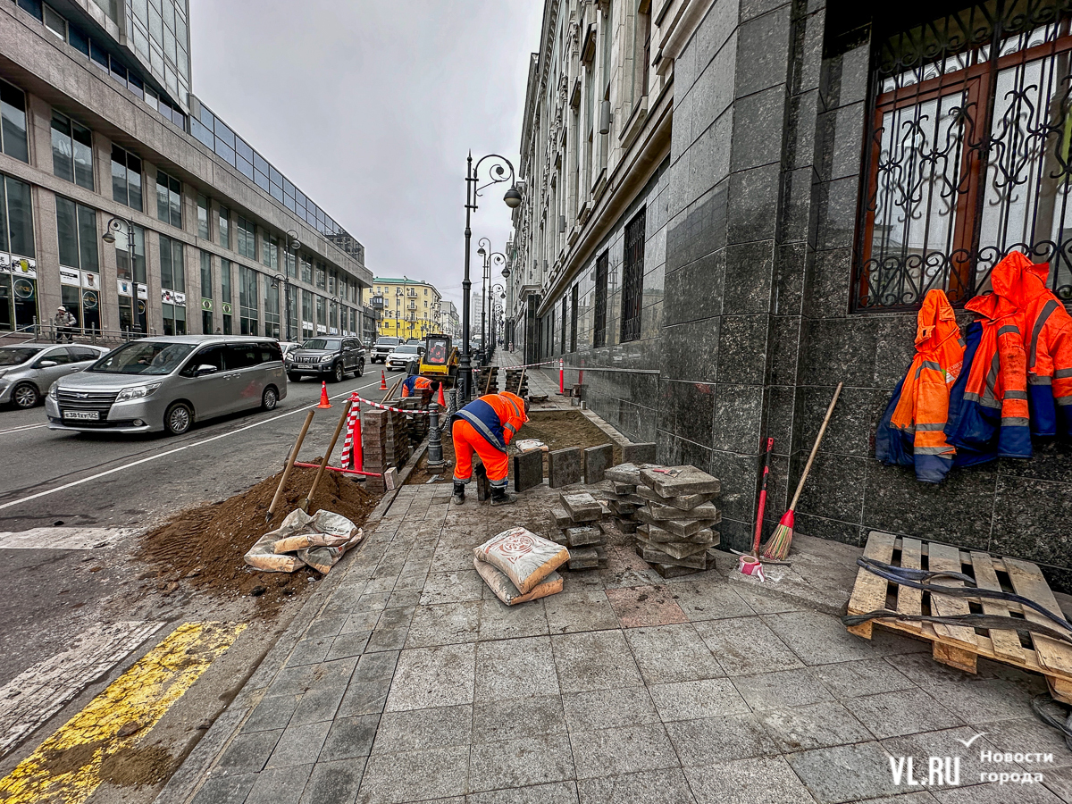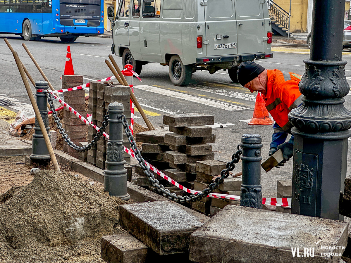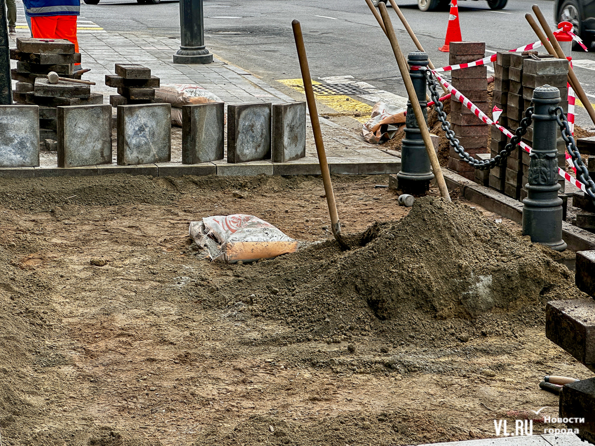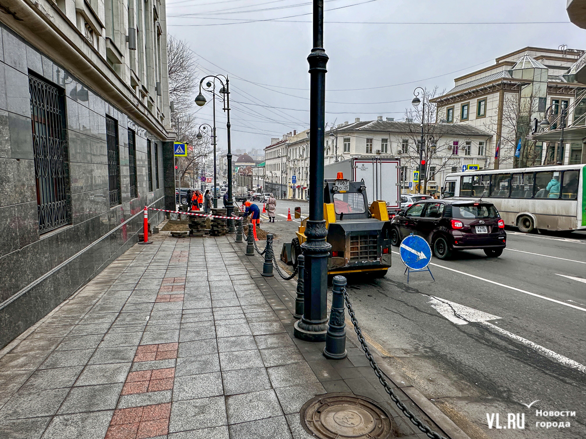 Меняют плитку возле Алеутской, 44. Из-за этого тротуар и крайняя правая полоса частично перекрыты – на ней стоит мини-погрузчик, который огорожен конусами и дорожными знаками. Пешеходам же, которые идут вниз к «Клеверу», нужно обходить раскопки по проезжей части, огибая спецтехнику и перешагивая через заборчик.