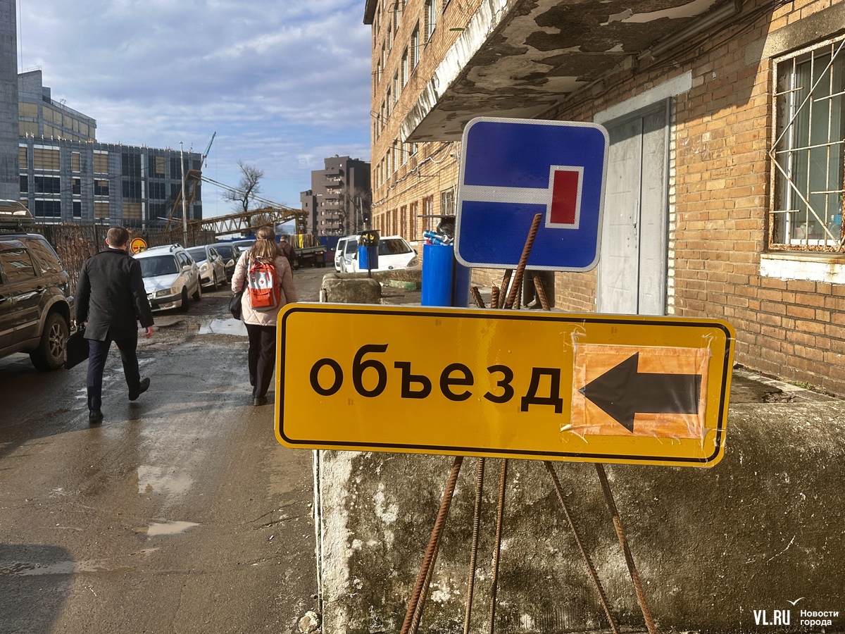 Перекрыли сквозной проезд в 8 утра. Огородили участок дороги длиной около 35 метров рядом с городком строителей музейно-театрального комплекса (ранее тут располагался ныне снесённый магазин «Баба Таня»). Выполняет работы подрядная организация ООО «Строй ДВ», которая, согласно постановлению, должна была установить временные дорожные знаки.