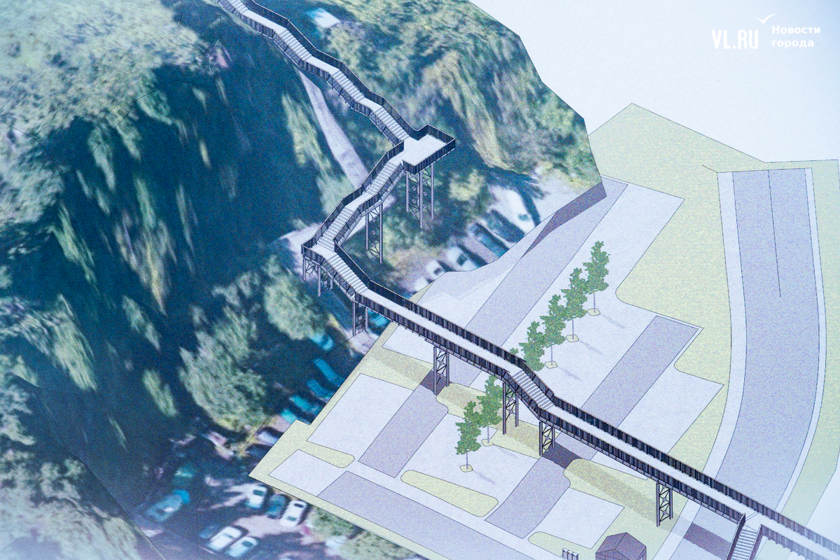 Строящийся переход будет выполнен в той же концепции, как уже отремонтированный. Люди будут подниматься и спускаться по бетонным ступеням, держась за высокие металлические поручни. Помимо реконструкции самого перехода, подрядчик планирует вмонтировать в него освещение, а вместо небольшого закутка, который раньше не имел никакого назначения, будет построена ещё одна смотровая площадка во Владивостоке с видом на Амурский залив. После того, как отремонтируют виадук, приступят к благоустройству самой территории. Проект пока находится на этапе разработки и согласования.