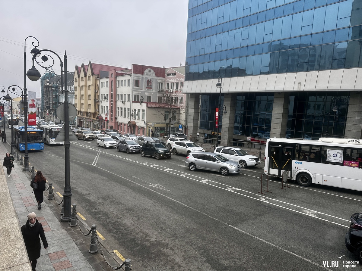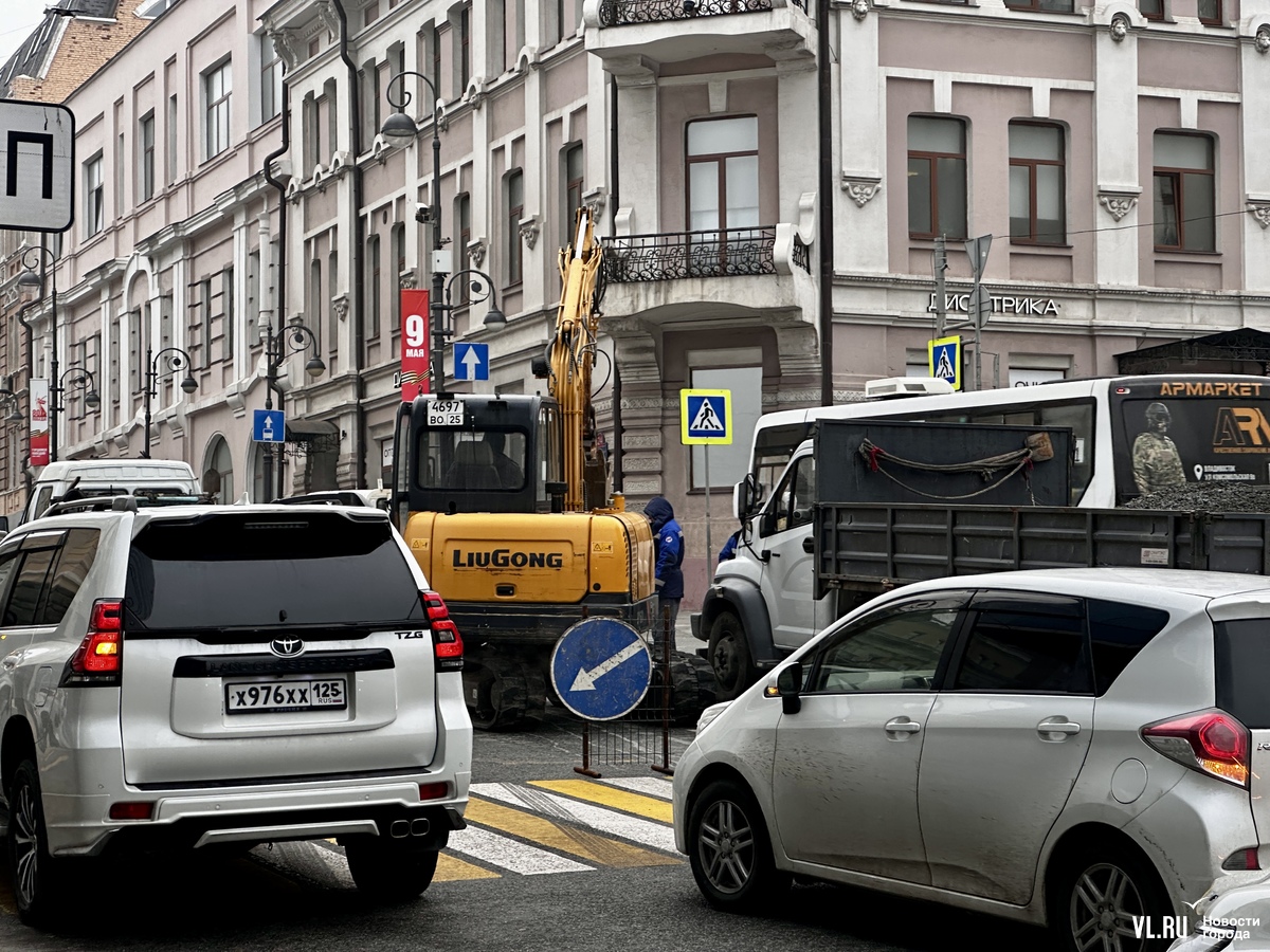 Утром в пятницу, 11 апреля, на перекрёстке Океанского проспекта с Фонтанной проводят ремонтные работы. Здесь заняты две полосы движения, собралась пробка.