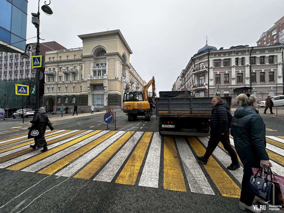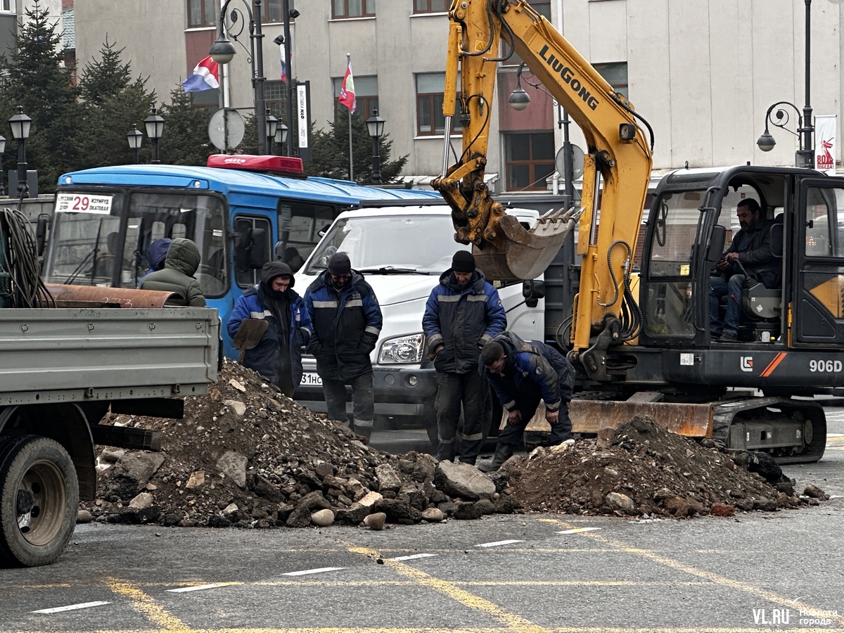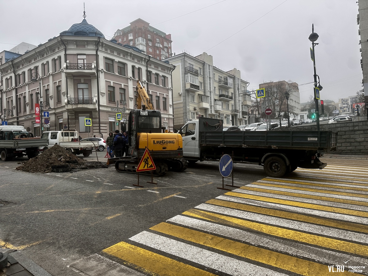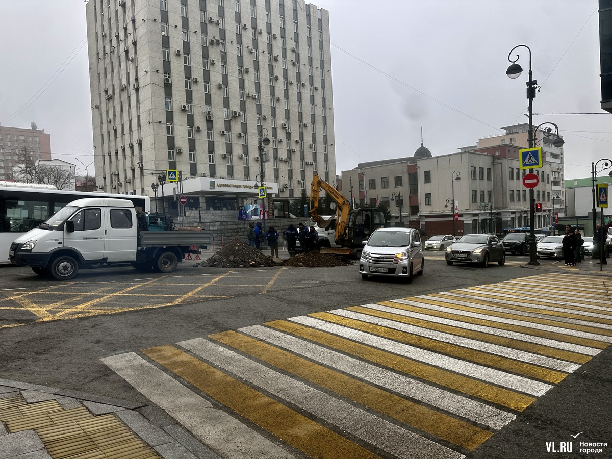 Ремонтные работы проводят на Океанском проспекте на перекрёстке с ул. Фонтанной, заняты две полосы. Отметим, что накануне в районе бизнес-центра «Скай Сити» «парила» дорога и приезжала аварийная бригада.