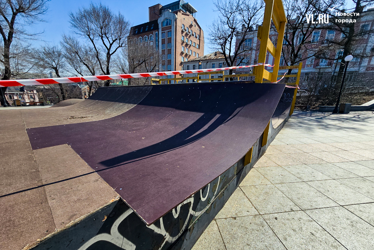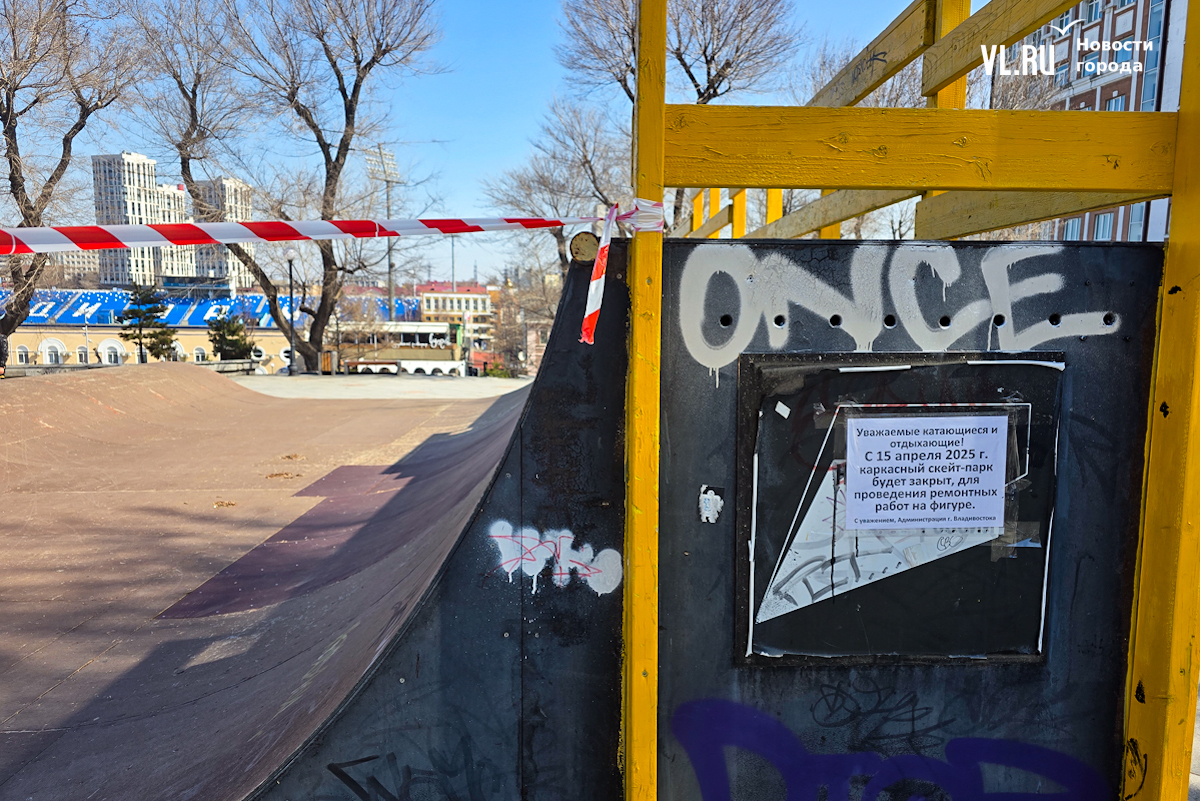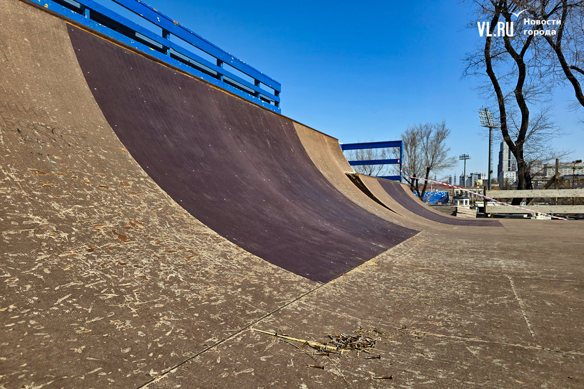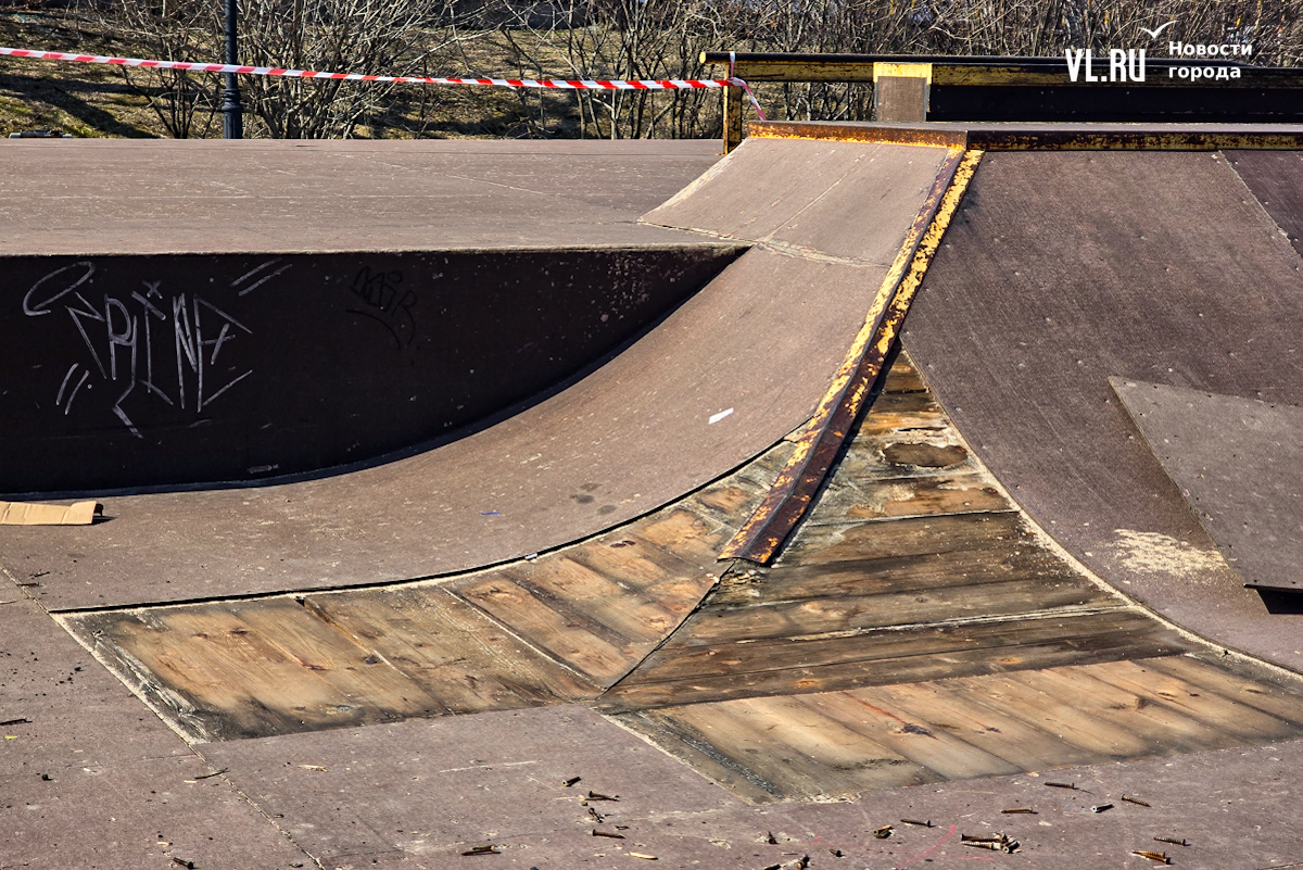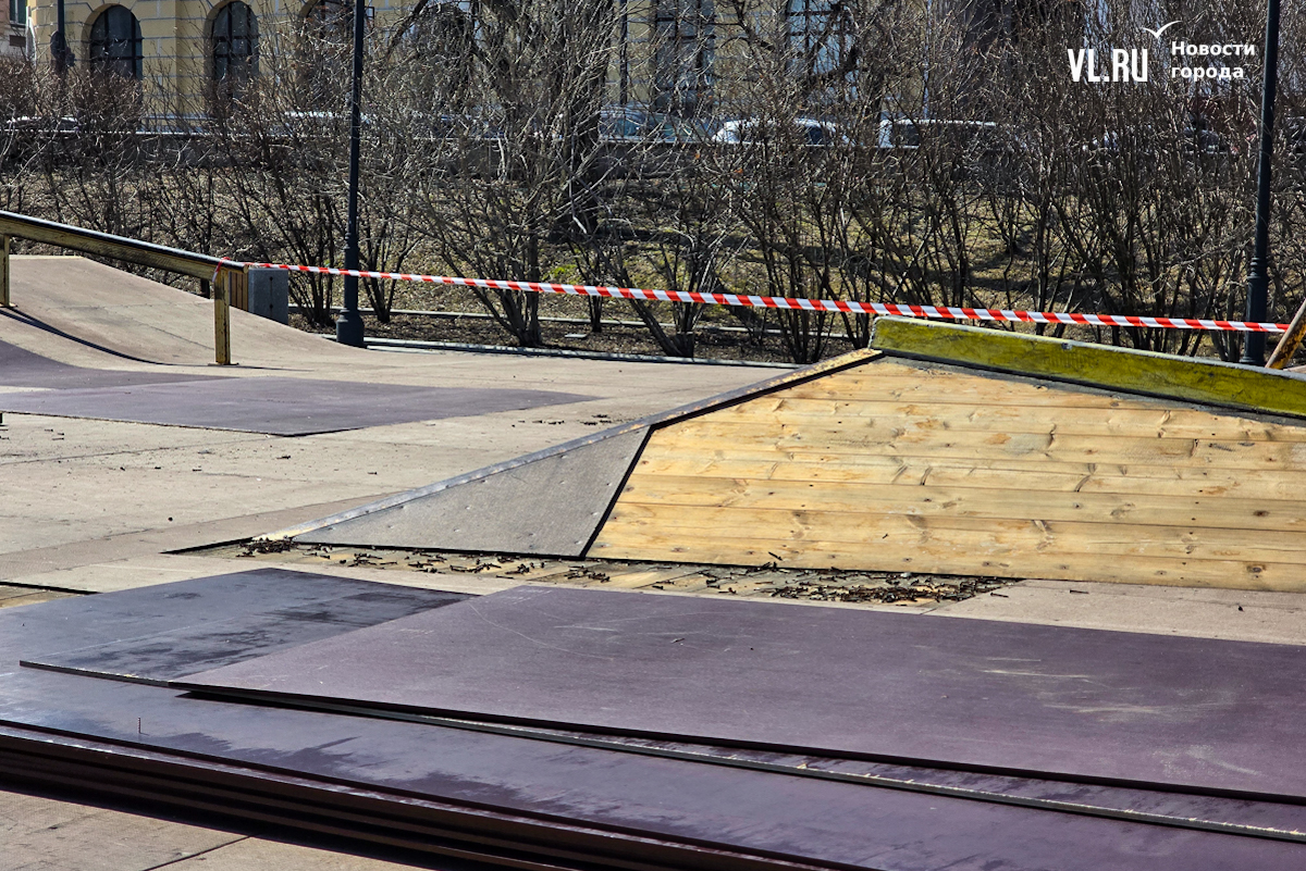 Сейчас площадку огородили сигнальной лентой, которой закрыли вход для скейтеров и самокатчиков. На самой конструкции висит уведомление о том, что с 15 апреля каркасный скейт-парк закрыт для проведения ремонтных работ. Проводит его, по всей видимости, администрация Владивостока. В некоторых местах уже сняли старые доски, которые местами уже были потёртые или разбитые. Вместо них будут устанавливать новые, более гладкие и ровные. Так, например, уже заменили две дощатые панели на эре и сняли настил с пирамиды.