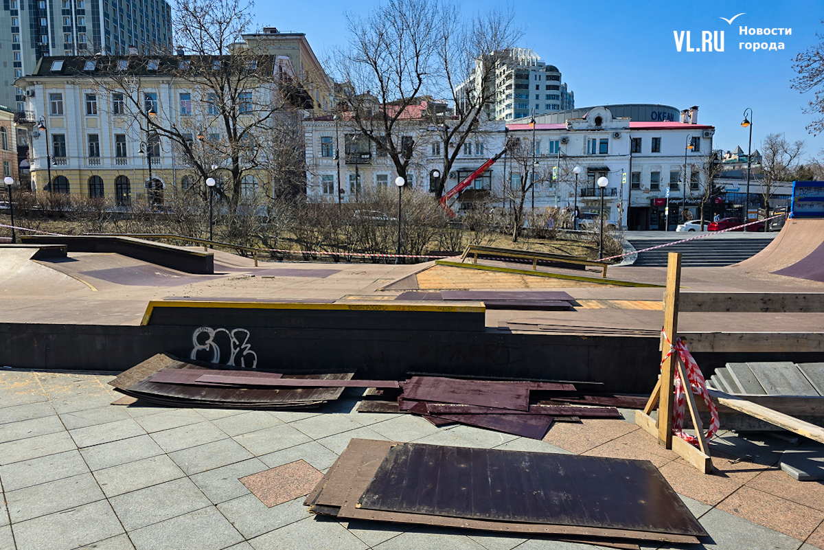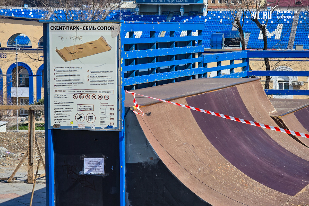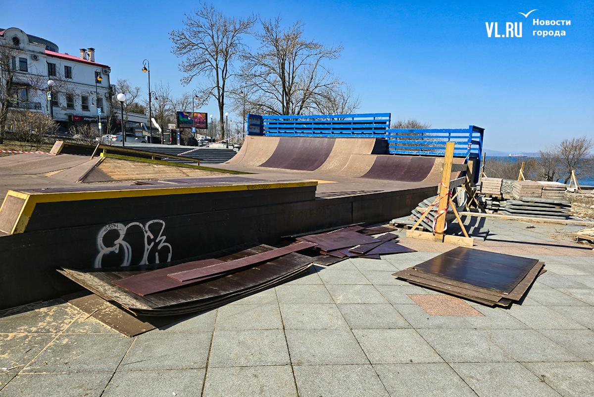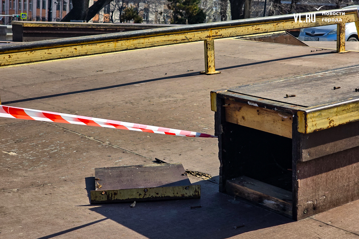 Сейчас площадку огородили сигнальной лентой, которой закрыли вход для скейтеров и самокатчиков. На самой конструкции висит уведомление о том, что с 15 апреля каркасный скейт-парк закрыт для проведения ремонтных работ. Проводит его, по всей видимости, администрация Владивостока. В некоторых местах уже сняли старые доски, которые местами уже были потёртые или разбитые. Вместо них будут устанавливать новые, более гладкие и ровные. Так, например, уже заменили две дощатые панели на эре и сняли настил с пирамиды.
