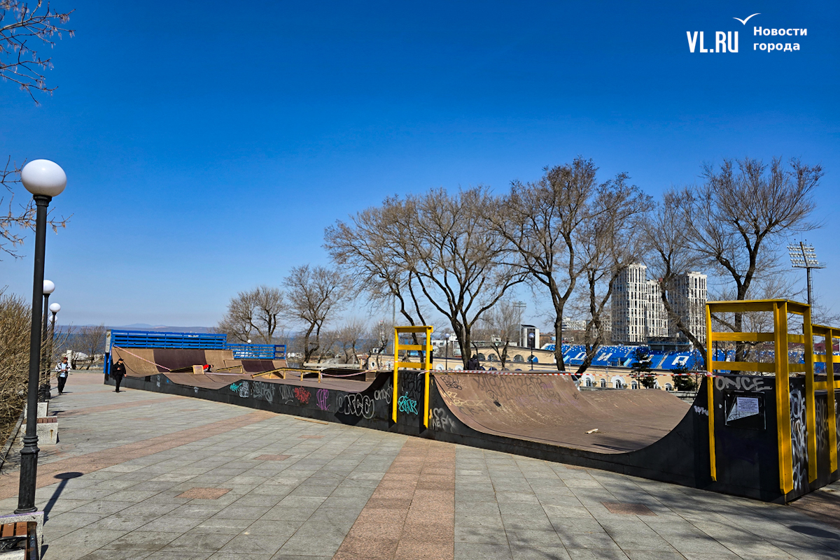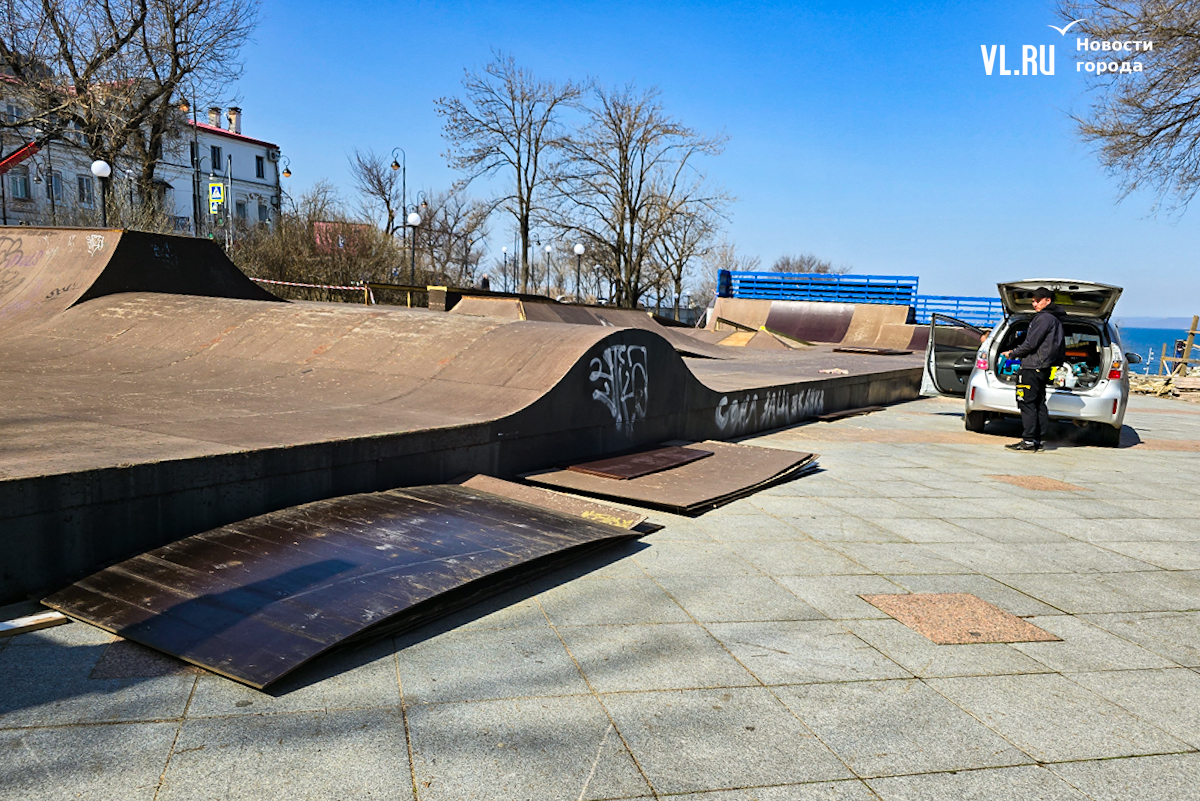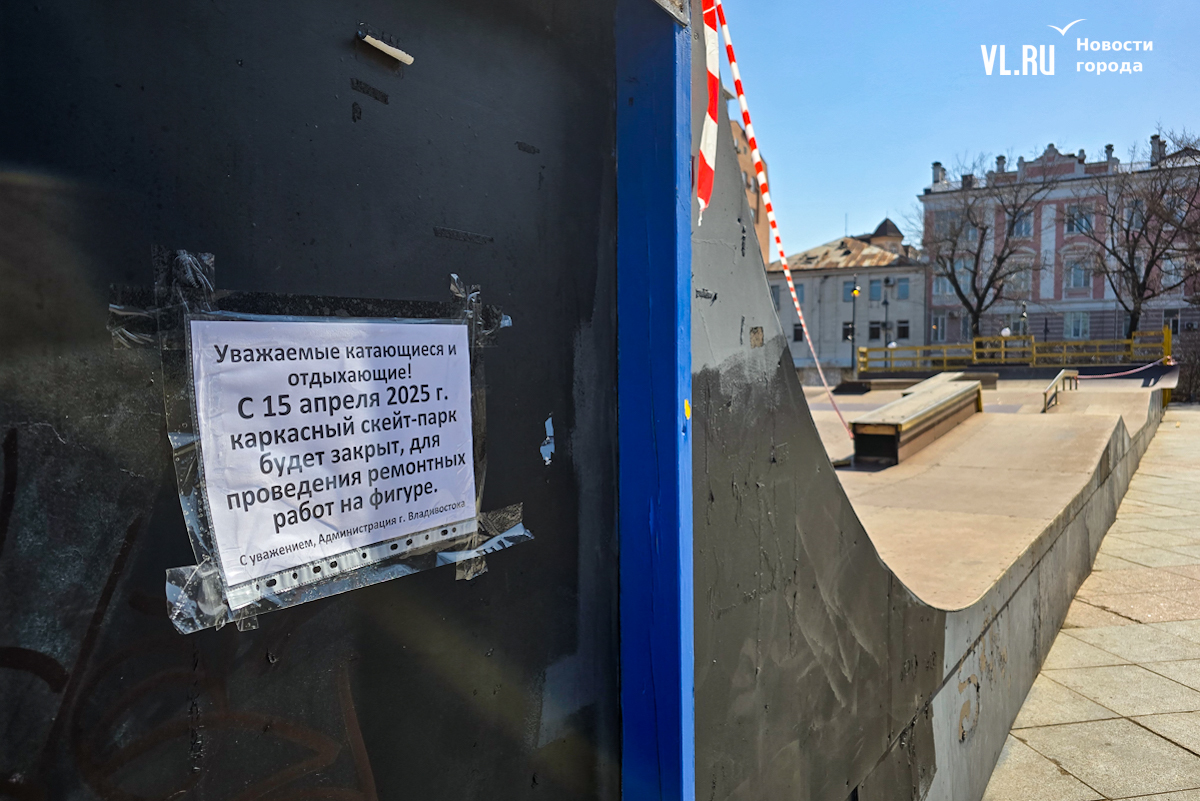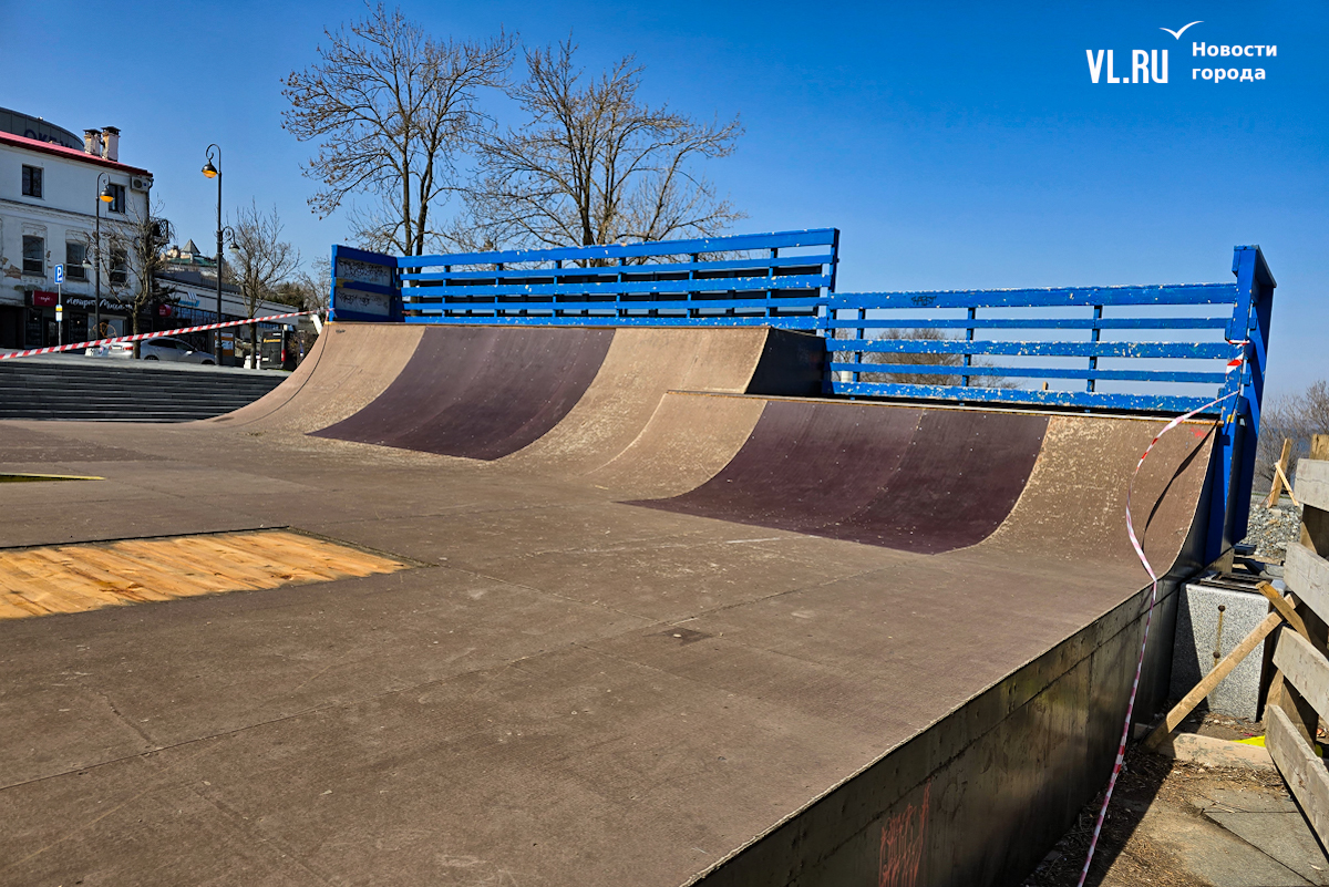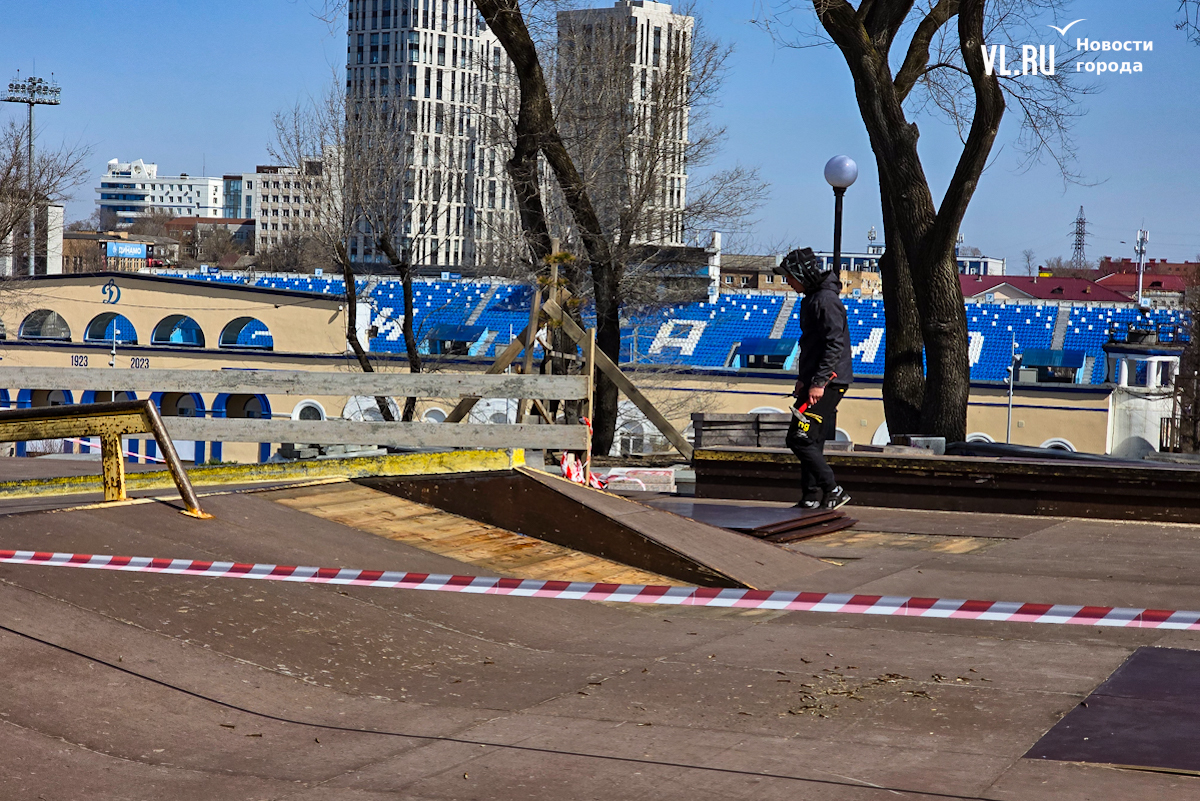 Сейчас площадку огородили сигнальной лентой, которой закрыли вход для скейтеров и самокатчиков. На самой конструкции висит уведомление о том, что с 15 апреля каркасный скейт-парк закрыт для проведения ремонтных работ. Проводит его, по всей видимости, администрация Владивостока. В некоторых местах уже сняли старые доски, которые местами уже были потёртые или разбитые. Вместо них будут устанавливать новые, более гладкие и ровные. Так, например, уже заменили две дощатые панели на эре и сняли настил с пирамиды.