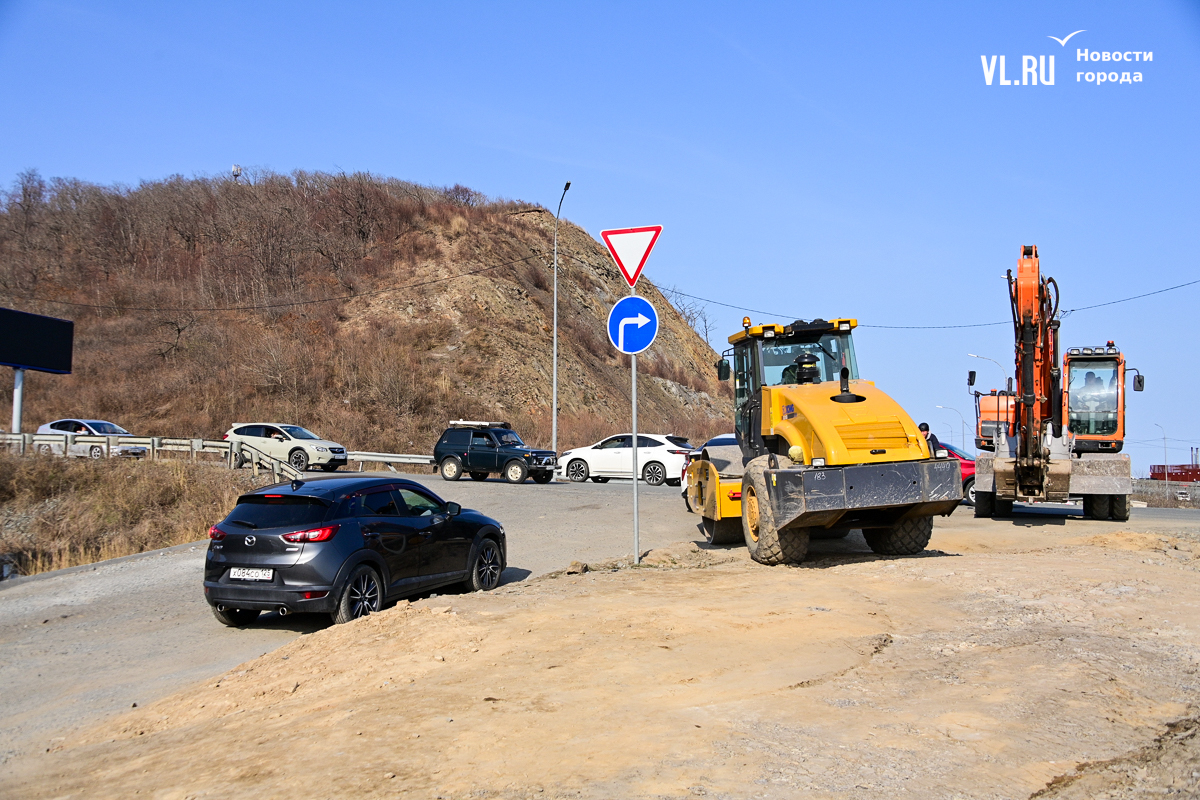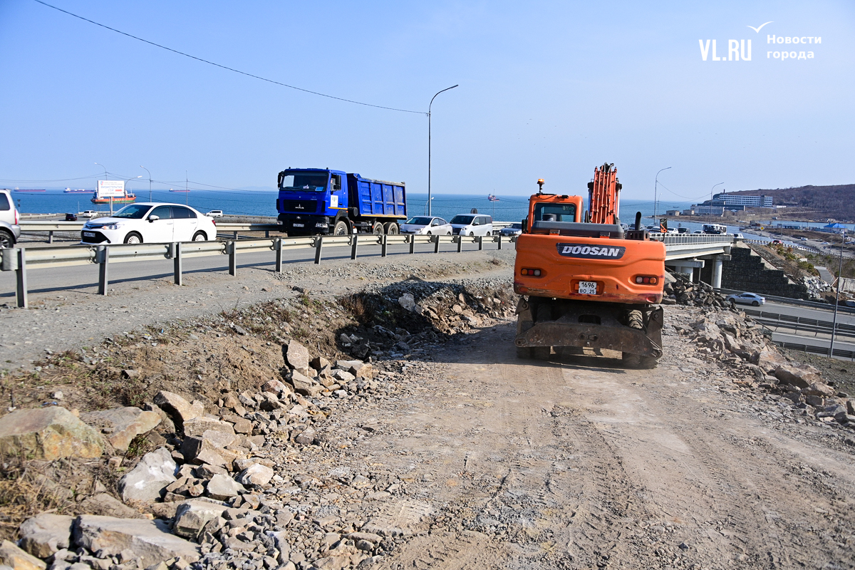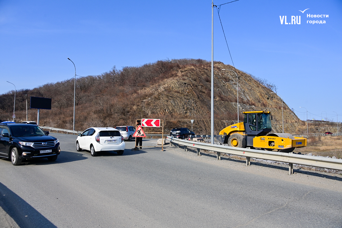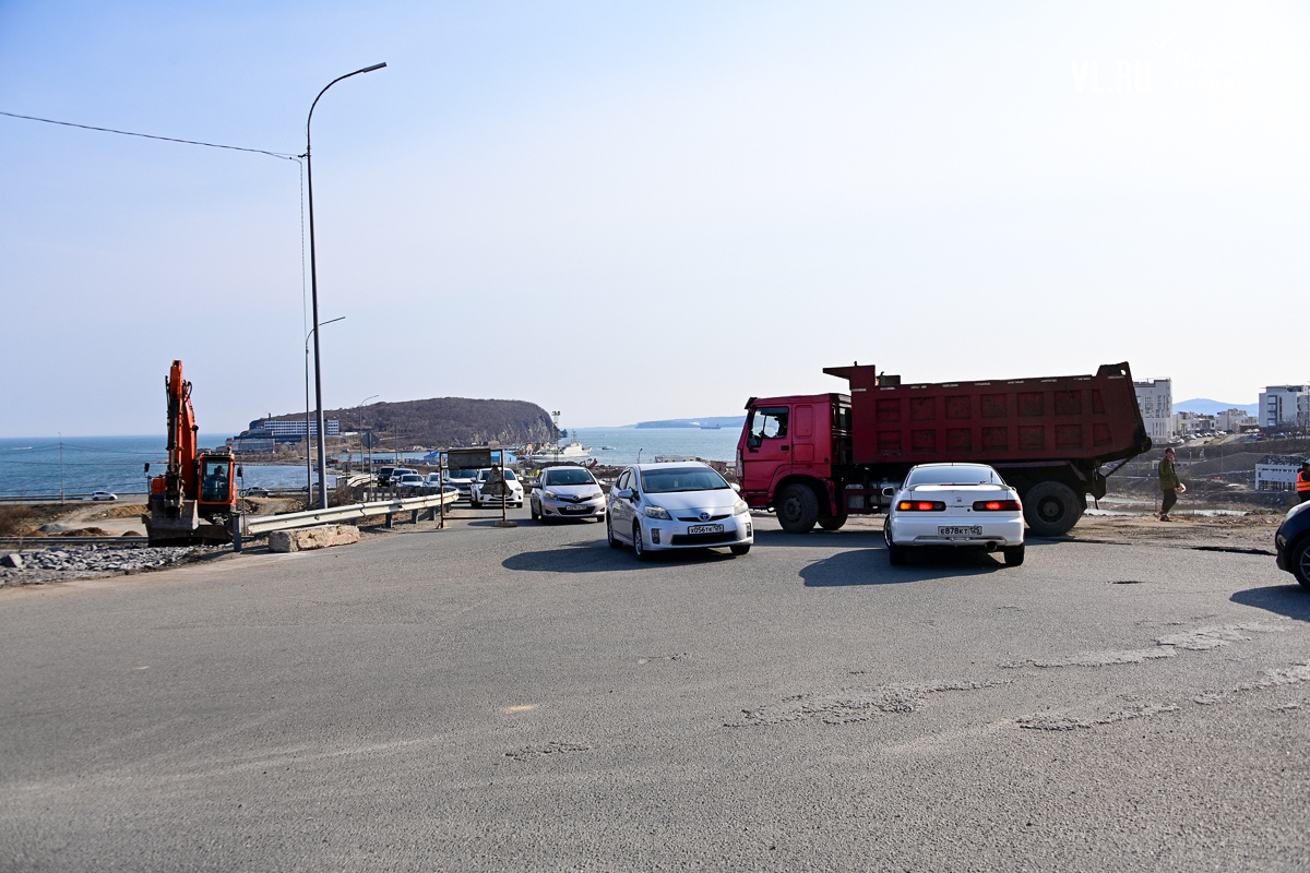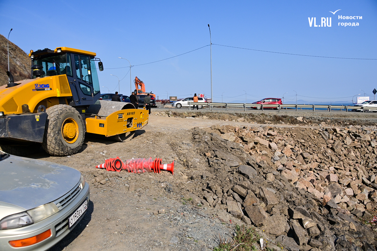 По словам корреспондента Новостей VL.ru, периодически на участок привозят скалу. На время выгрузки приходится ненадолго перекрывать некоторые полосы, и движение почти останавливается. Кроме того, тут находится автобусная остановка, её никуда не переносили – людей приходится высаживать там же, где выгружают скалу.