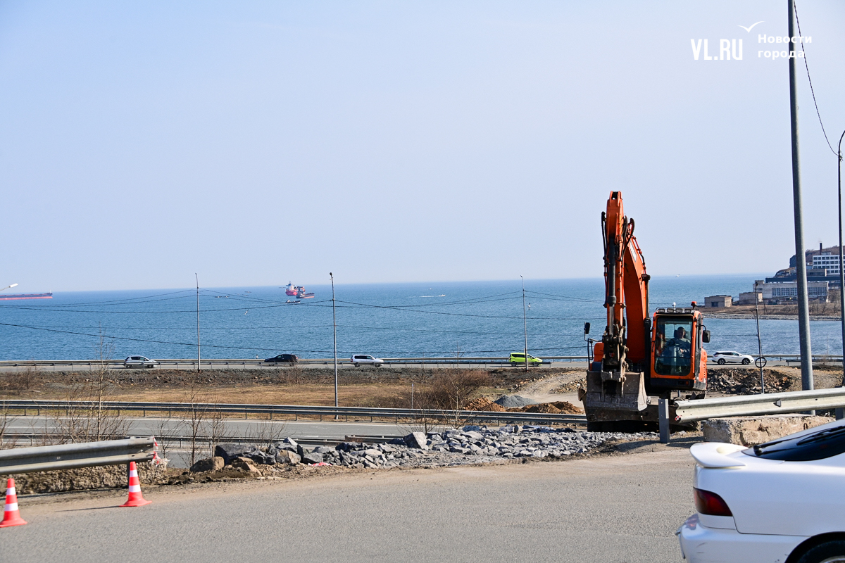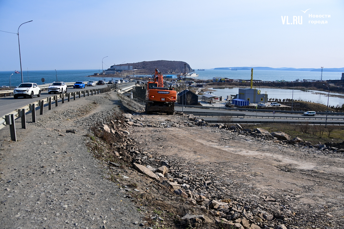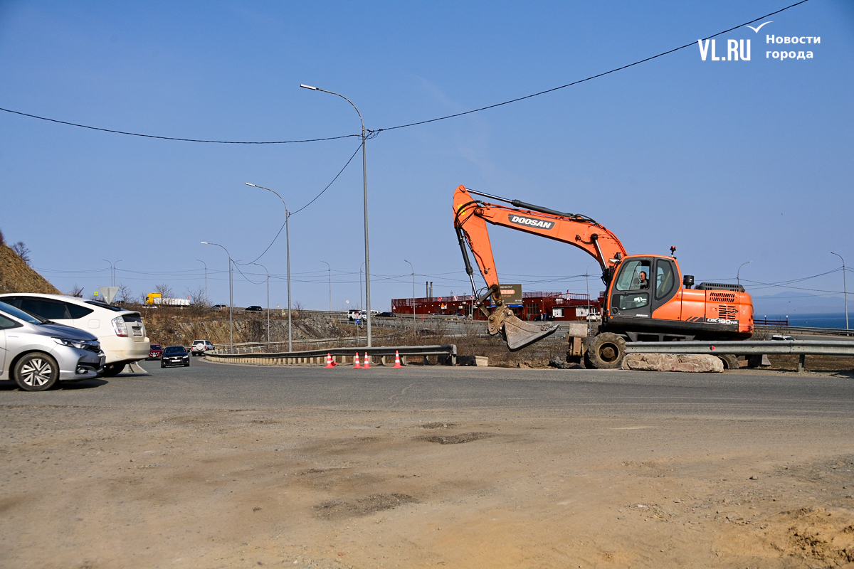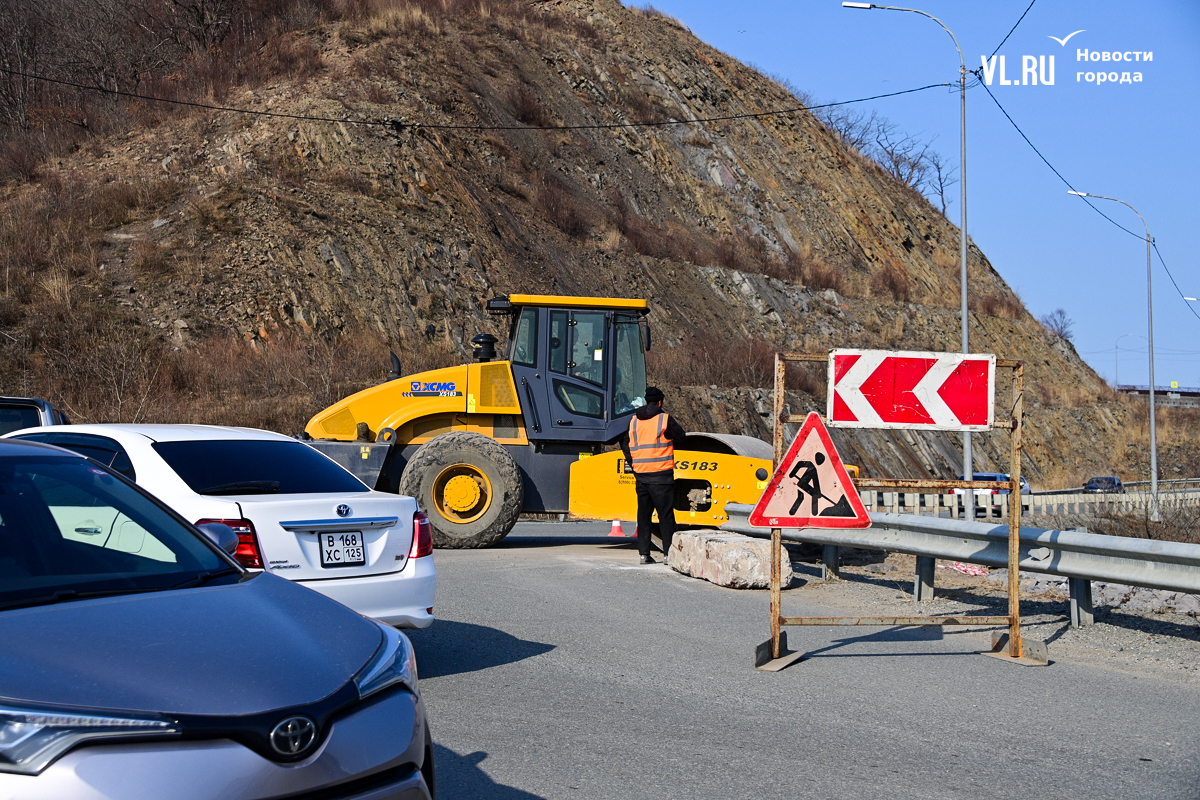 По словам корреспондента Новостей VL.ru, периодически на участок привозят скалу. На время выгрузки приходится ненадолго перекрывать некоторые полосы, и движение почти останавливается. Кроме того, тут находится автобусная остановка, её никуда не переносили – людей приходится высаживать там же, где выгружают скалу.