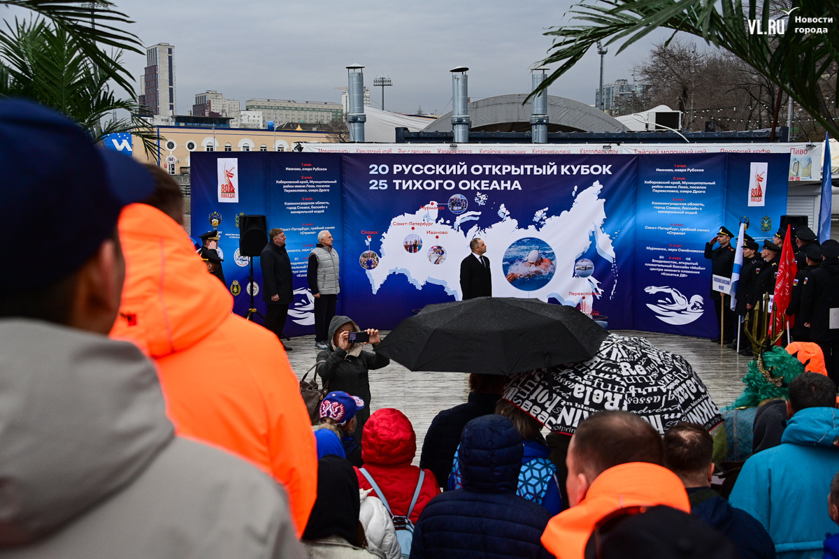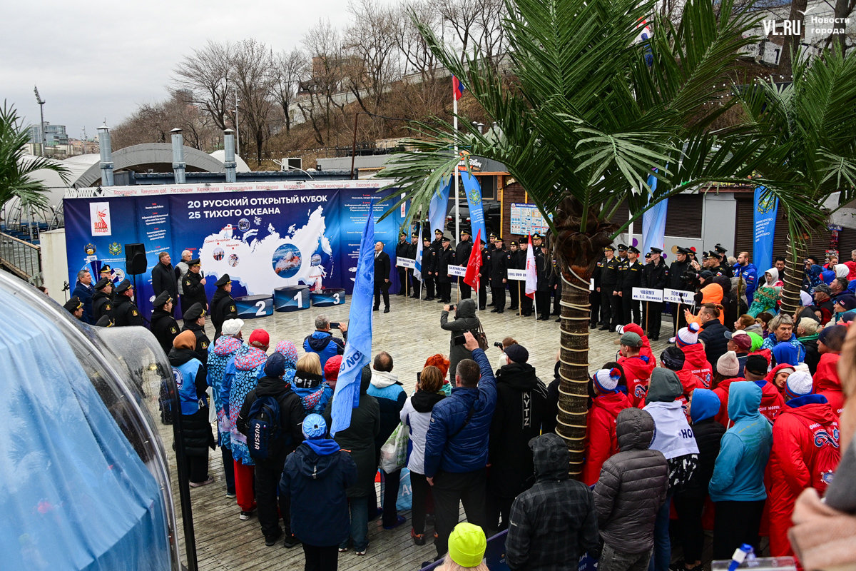 Приморье принимает заключительные старты по зимнему плаванию сразу трёх соревнований: пятого этапа Кубка России, третьего этапа всероссийского фестиваля «Русский открытый Кубок Тихого океана» и третьего этапа Кубка Военно-морского флота». Все три торжественно открыли сегодня, в пятницу. Участники выстроились на площадке рядом с бассейном, под дождливым небом и искусственными пальмами. Были представители команд, клубов, флотов и флотилий – то есть и «штатские» пловцы, и «флотские», которые стояли в форме. Был даже закалённый Нептун с зелёными водорослями-волосами. После духового оркестра, речей и духоподъёмного гимна зимнего плавания – оказывается, есть такой – спортсмены двинулись на регистрацию.
