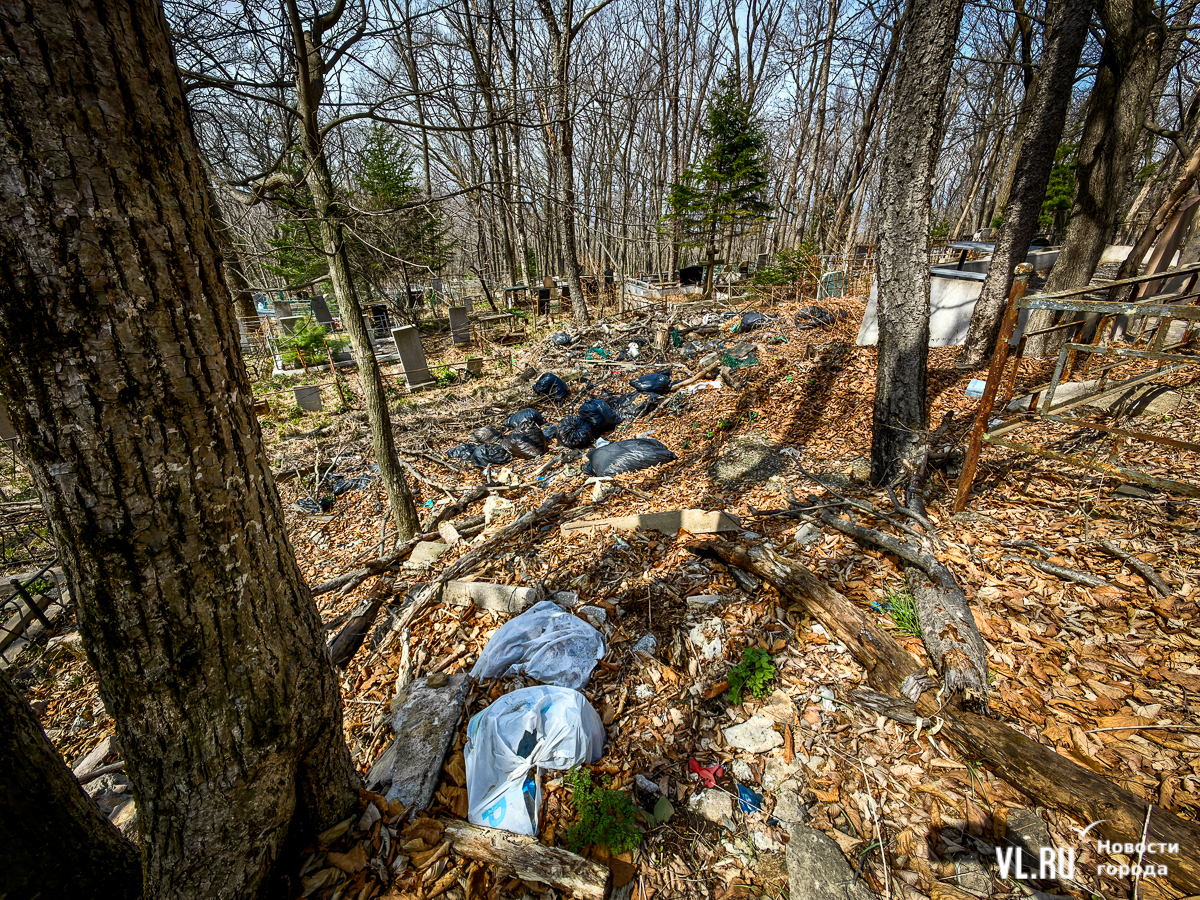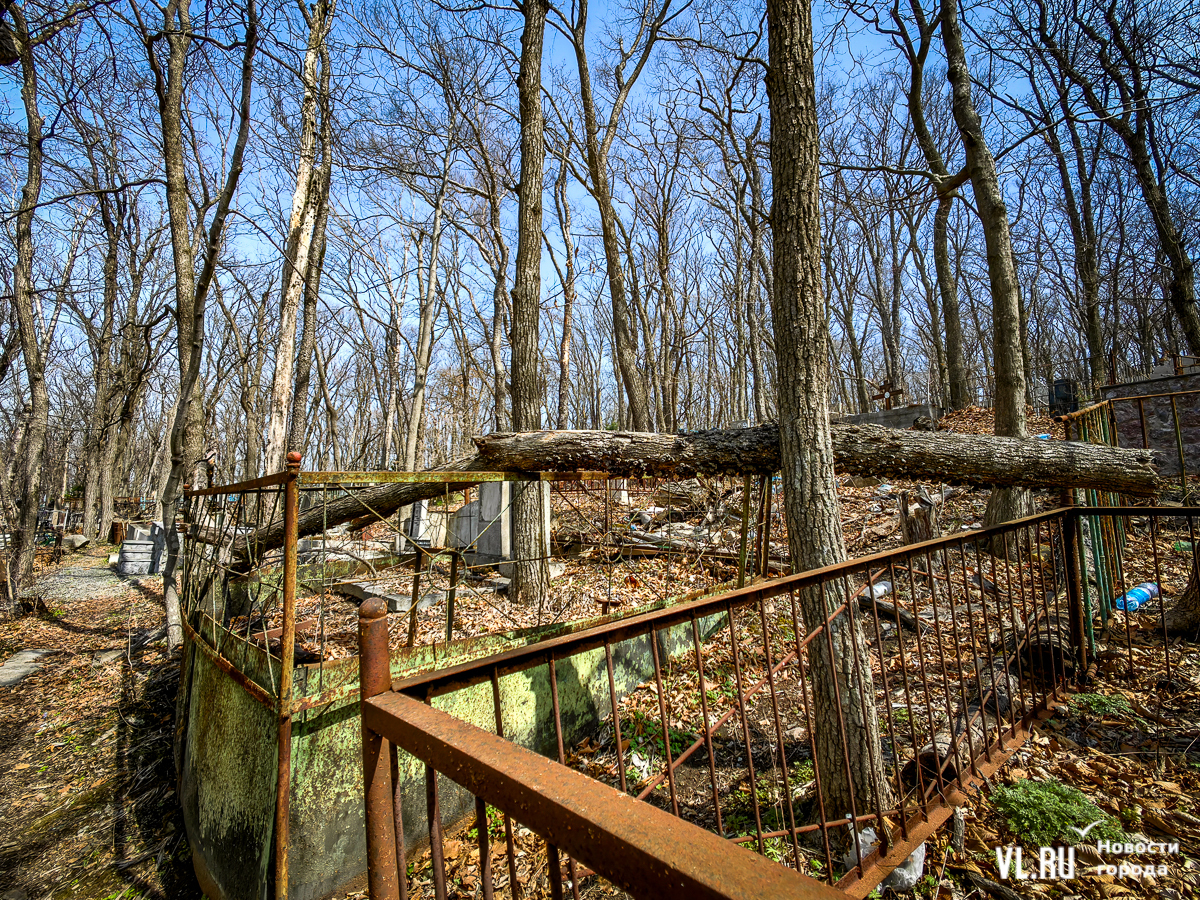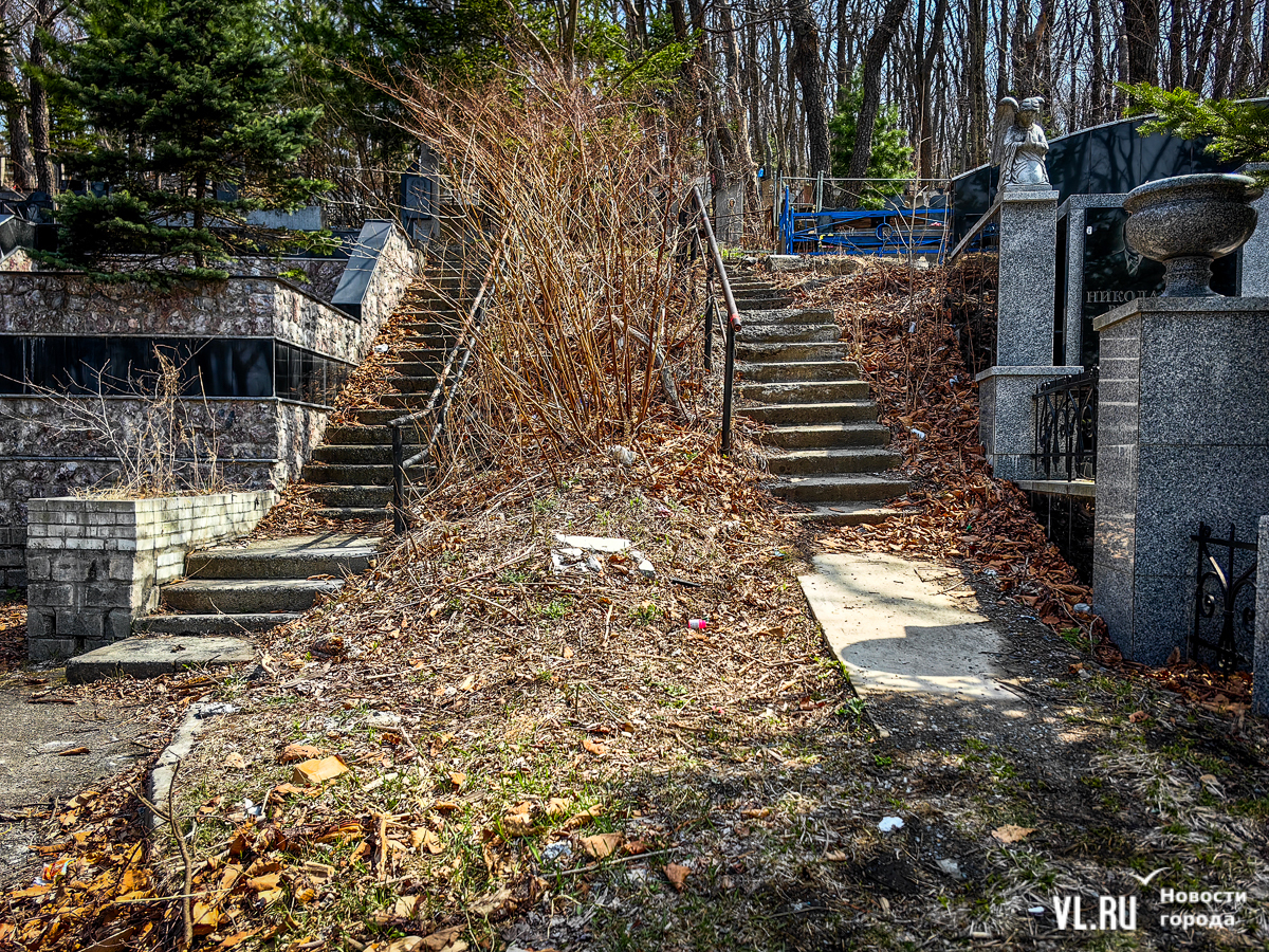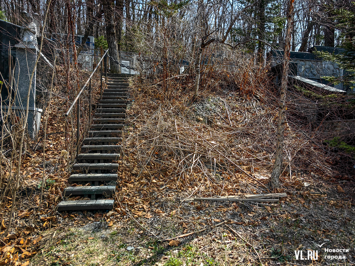 На центральной дороге между могилами лес из сухостоя, обваливающиеся ступени лестниц. С сопок бежит вода в разбитые ливнёвки. Так было и год назад – лучше не стало. Кладбище как будто выглядит чуть чище, чем раньше, но в основном всё осталось на своих местах. По горам мусора снуют белки, вороны и щекастые бурундуки.