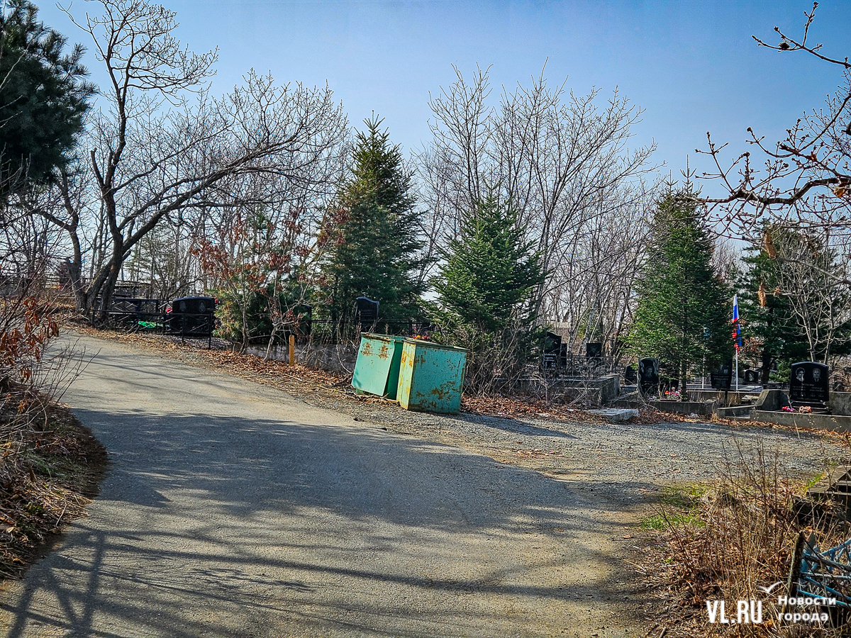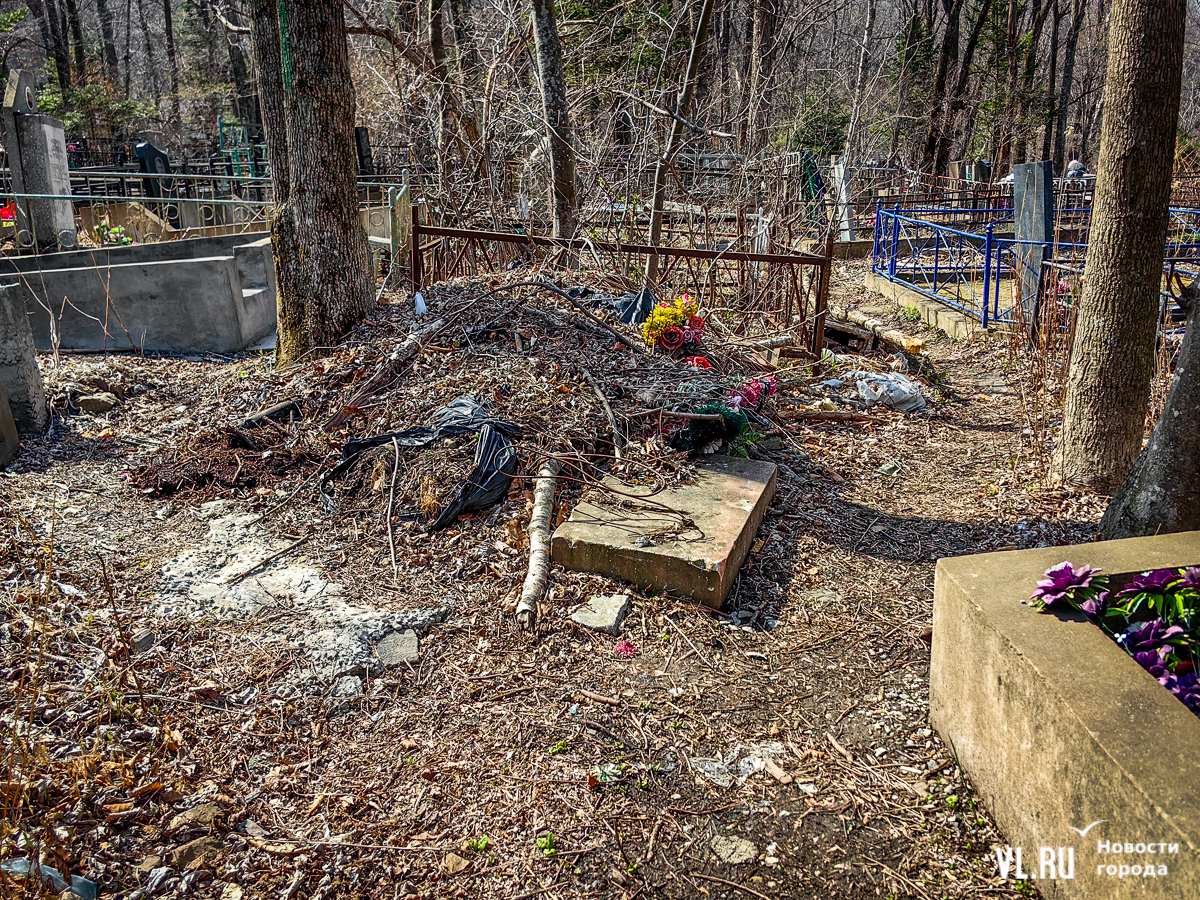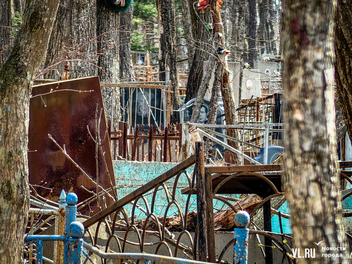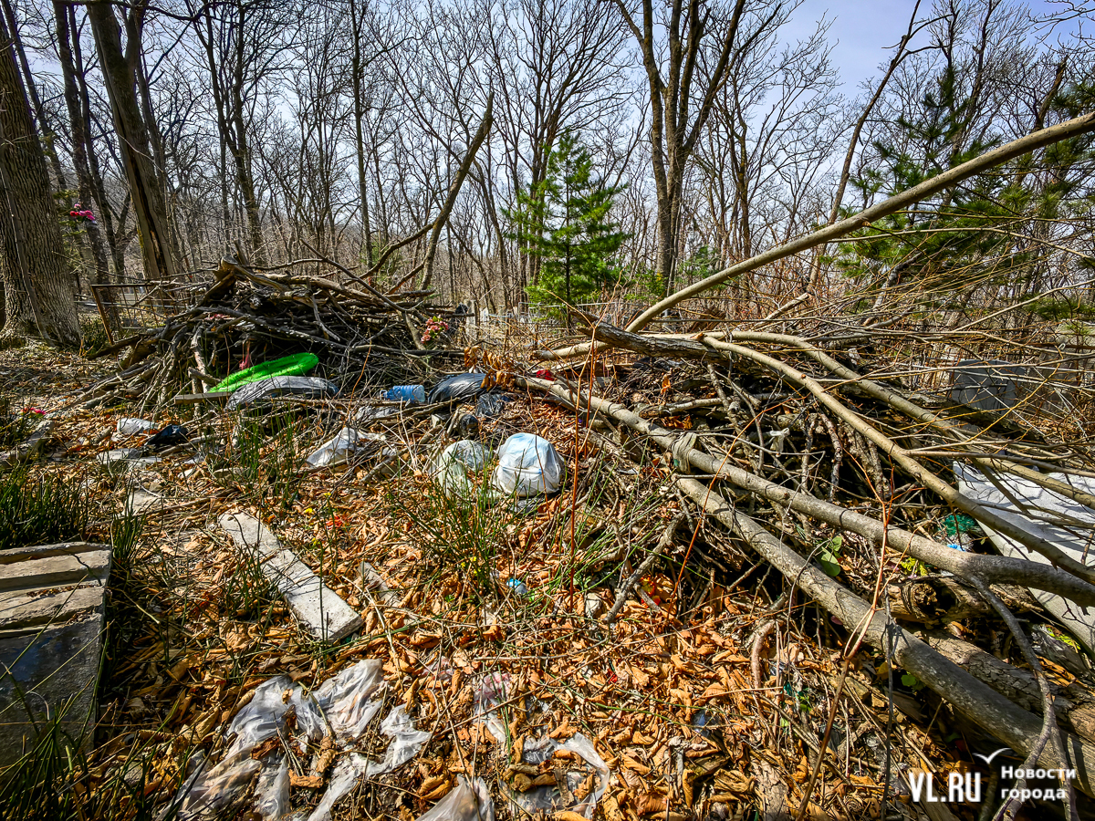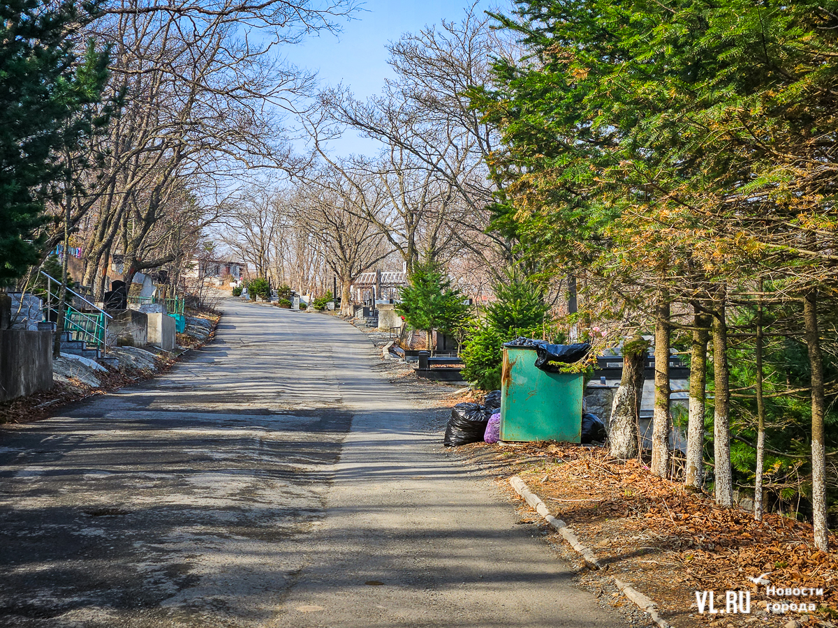 На центральной дороге между могилами лес из сухостоя, обваливающиеся ступени лестниц. С сопок бежит вода в разбитые ливнёвки. Так было и год назад – лучше не стало. Кладбище как будто выглядит чуть чище, чем раньше, но в основном всё осталось на своих местах. По горам мусора снуют белки, вороны и щекастые бурундуки.