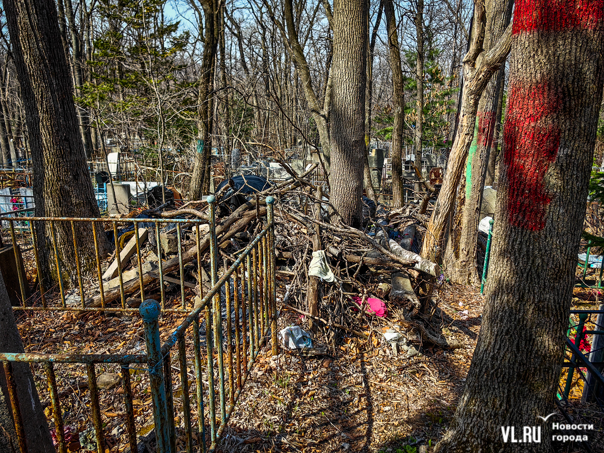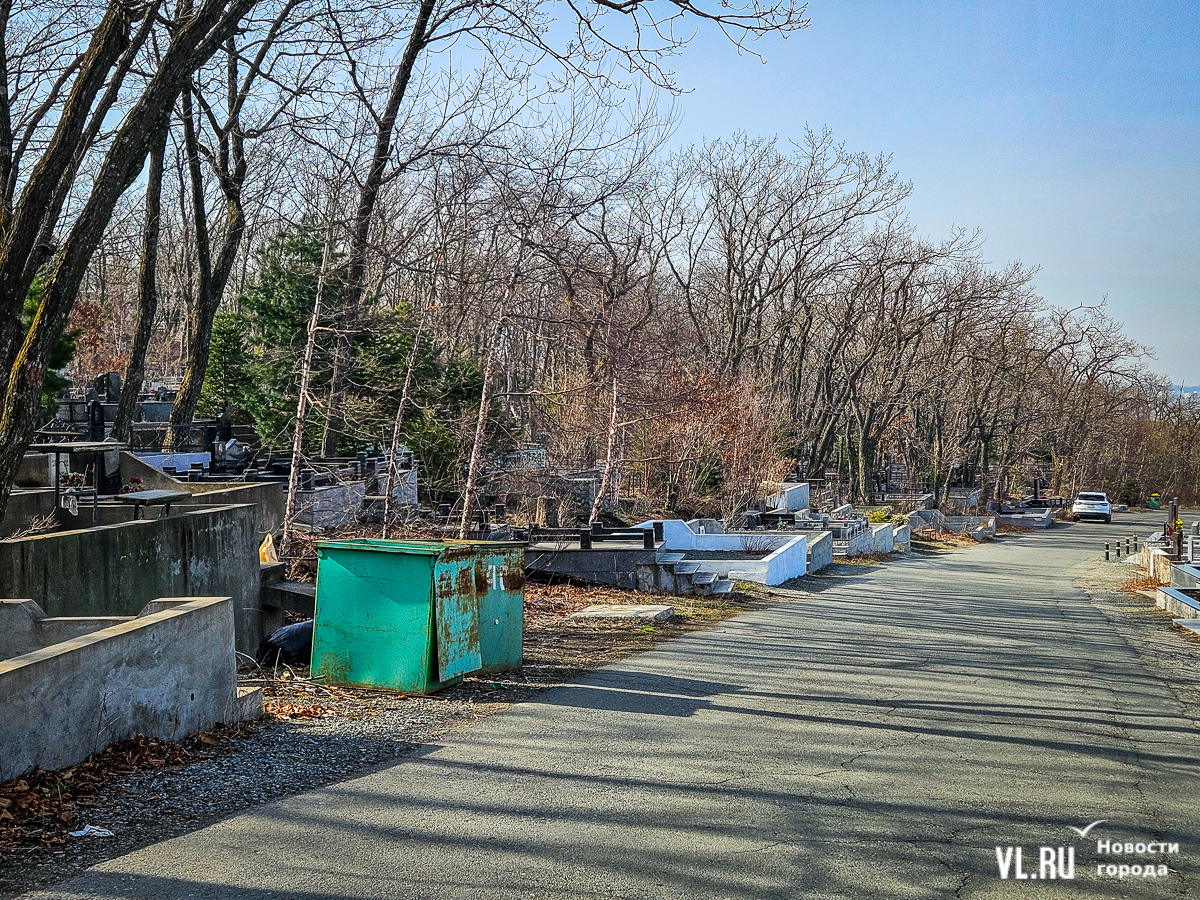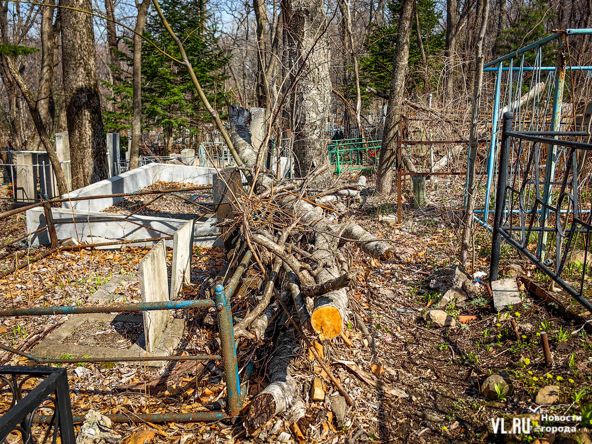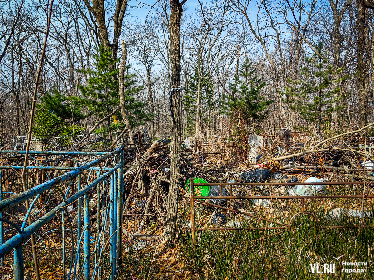 На центральной дороге между могилами лес из сухостоя, обваливающиеся ступени лестниц. С сопок бежит вода в разбитые ливнёвки. Так было и год назад – лучше не стало. Кладбище как будто выглядит чуть чище, чем раньше, но в основном всё осталось на своих местах. По горам мусора снуют белки, вороны и щекастые бурундуки.