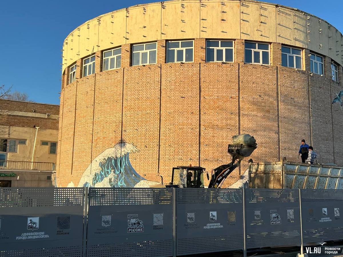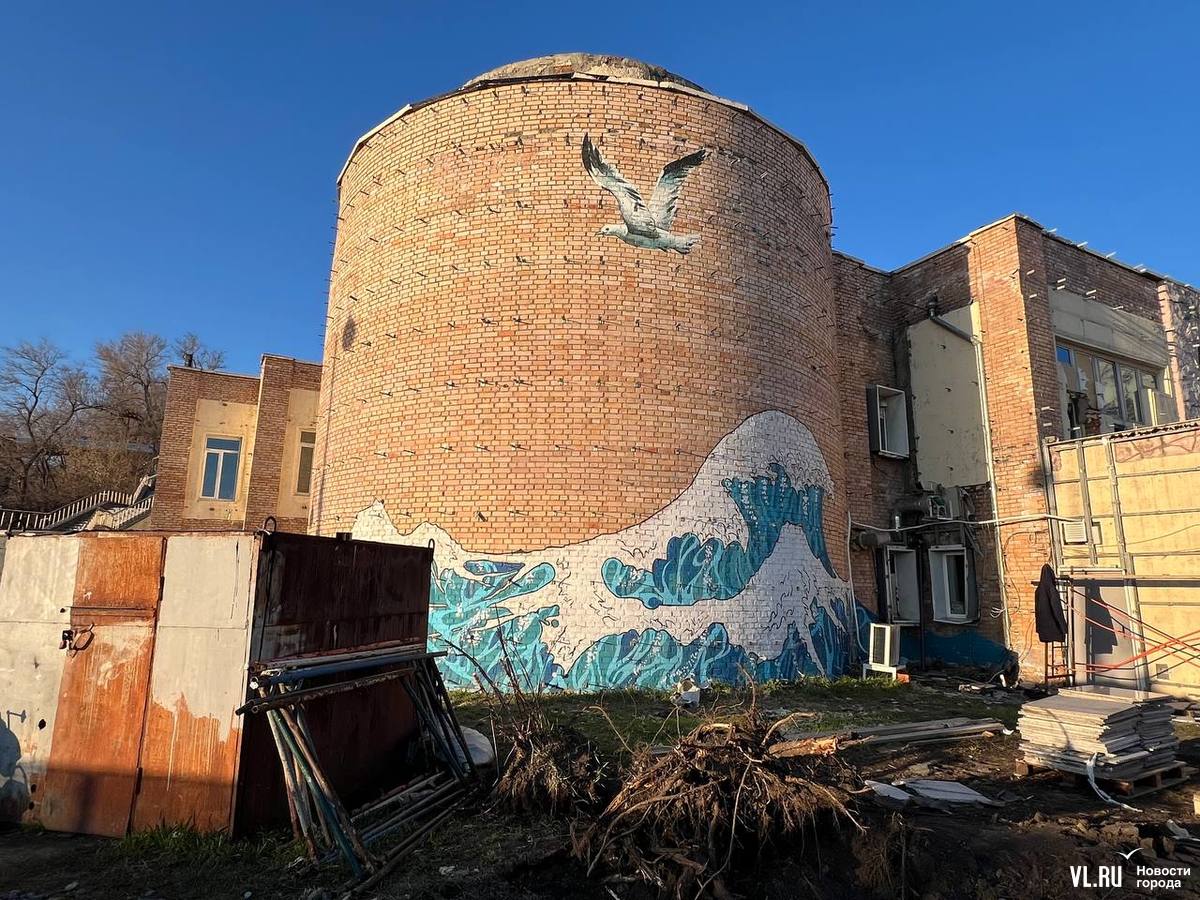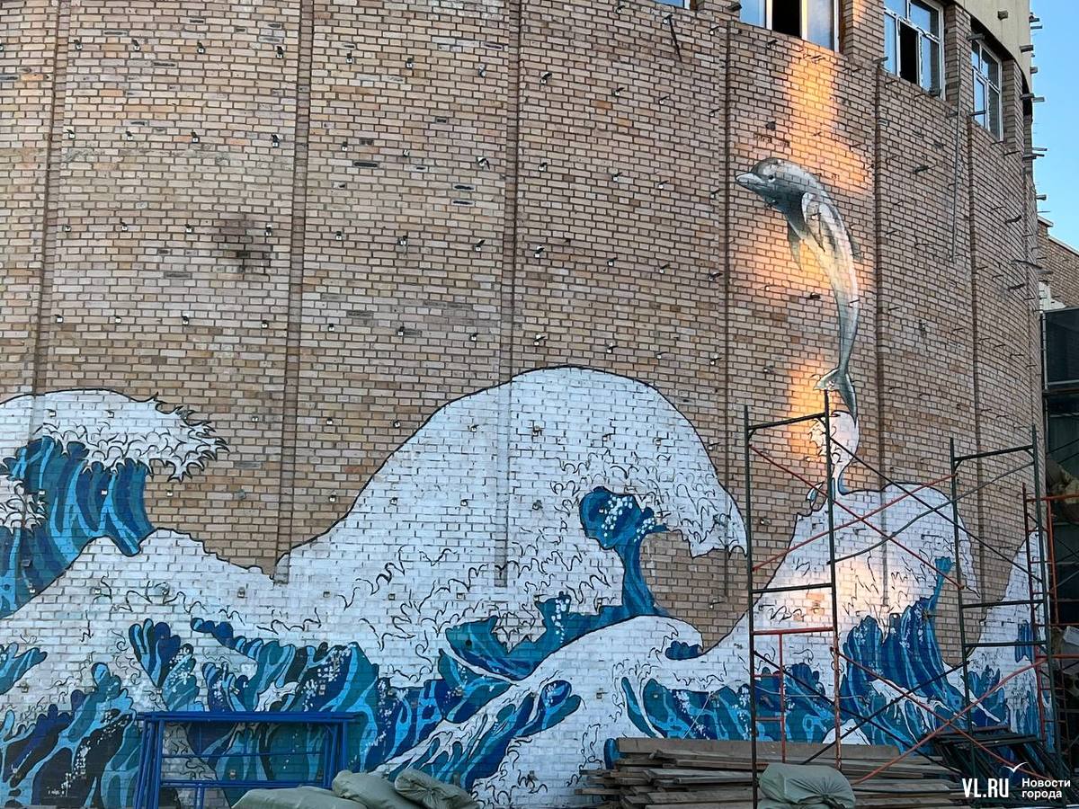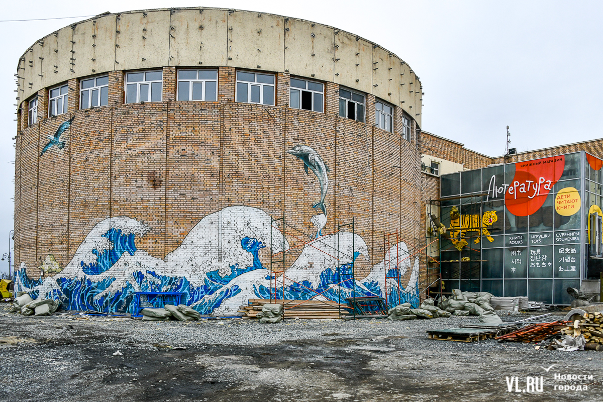 Рабочие, которые реконструируют здание океанариума на Батарейной во Владивостоке, сняли с него плиты обшивки. Под ними обнаружился нанесённый примерно 15 лет назад рисунок морских волн, дельфина и летящих чаек, о котором многие успели позабыть, так долго оно было закрыто фасадом.