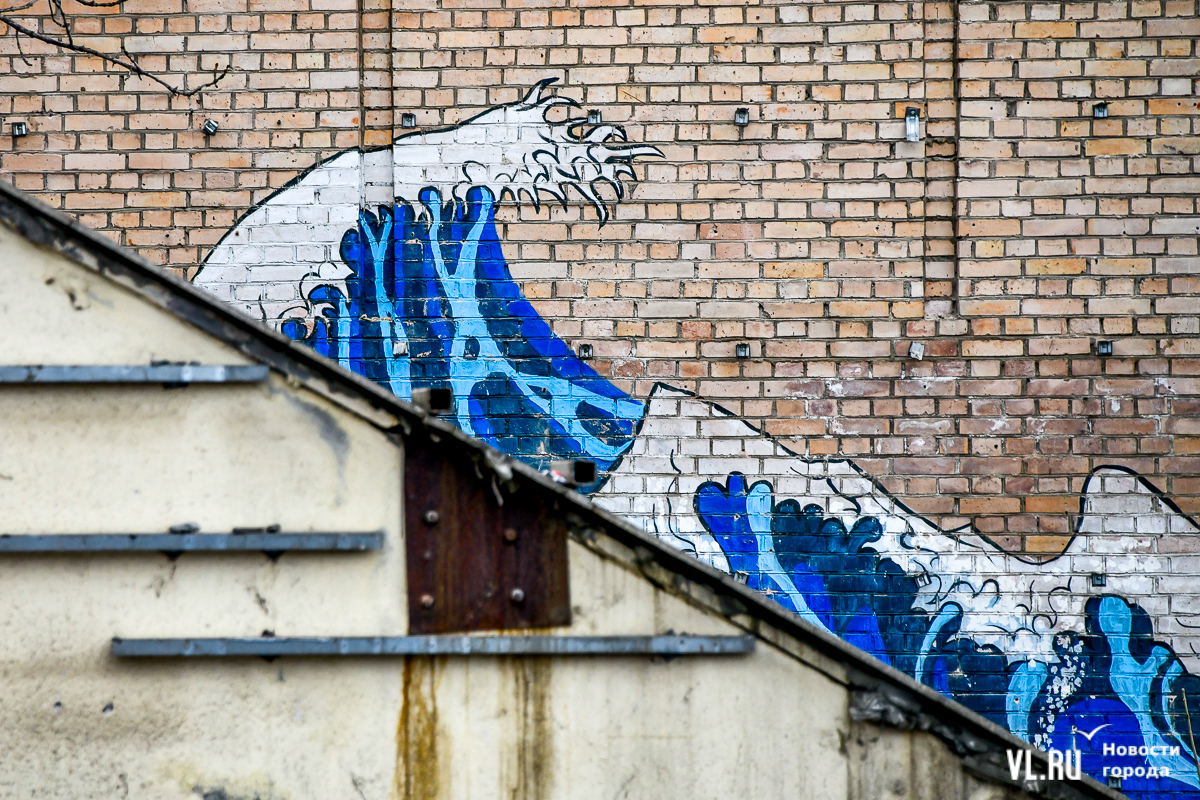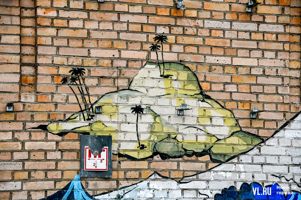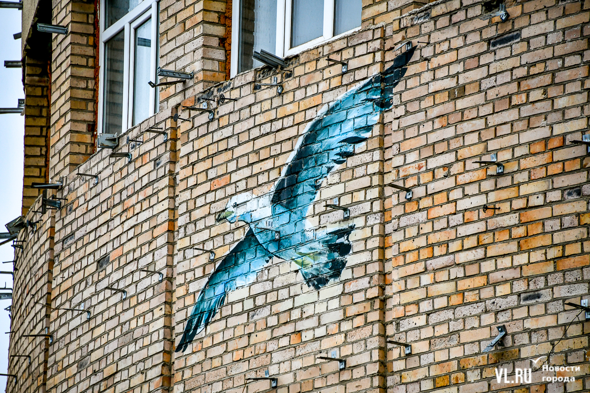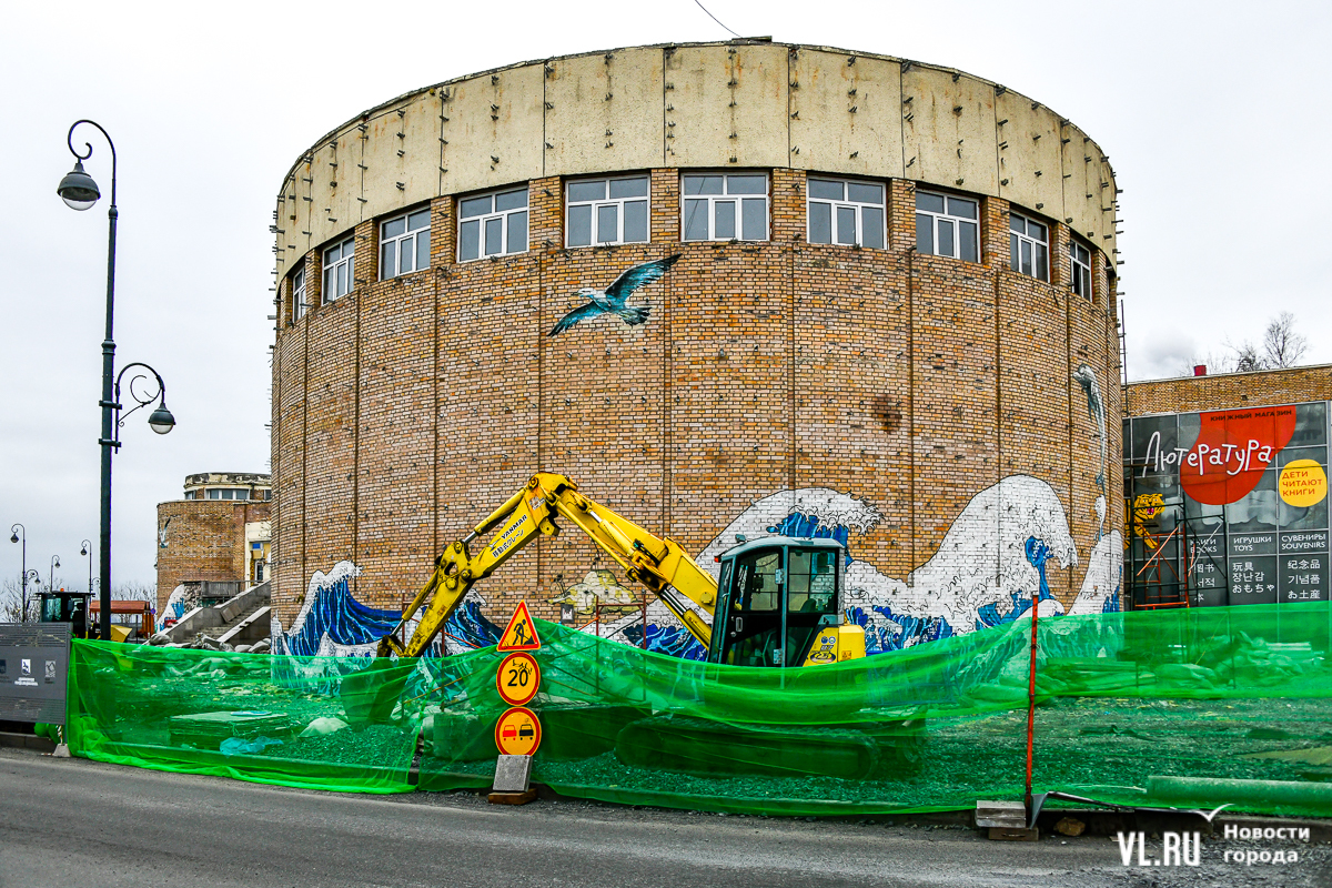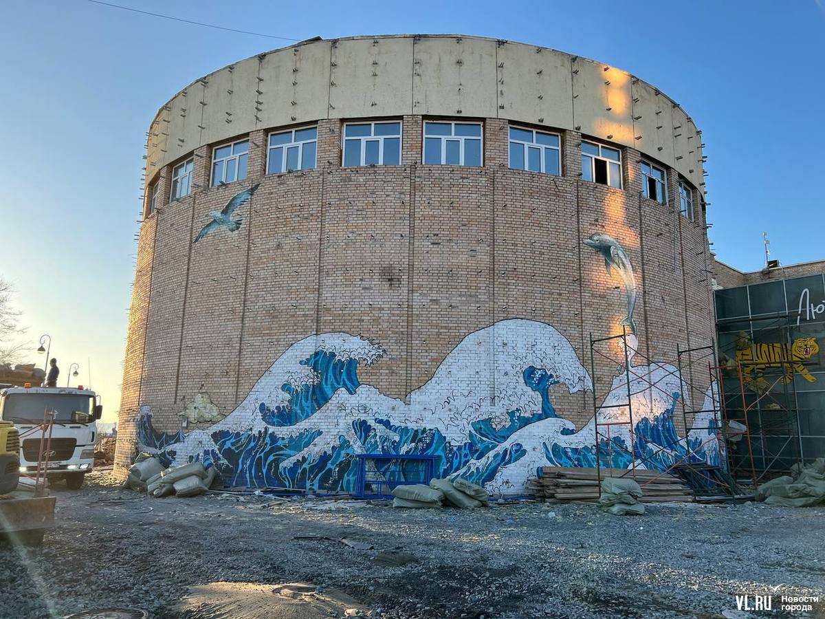 Рабочие, которые реконструируют здание океанариума на Батарейной во Владивостоке, сняли с него плиты обшивки. Под ними обнаружился нанесённый примерно 15 лет назад рисунок морских волн, дельфина и летящих чаек, о котором многие успели позабыть, так долго оно было закрыто фасадом.