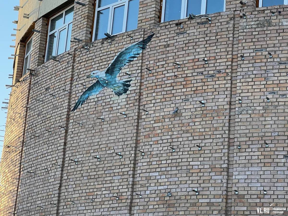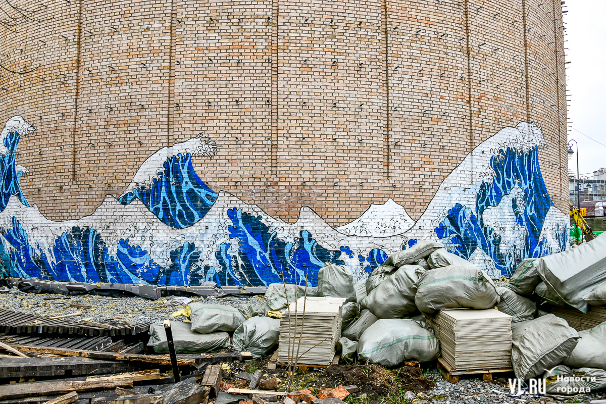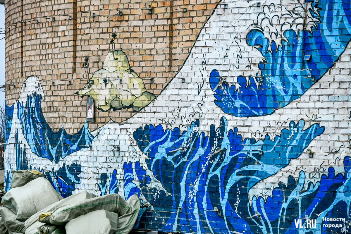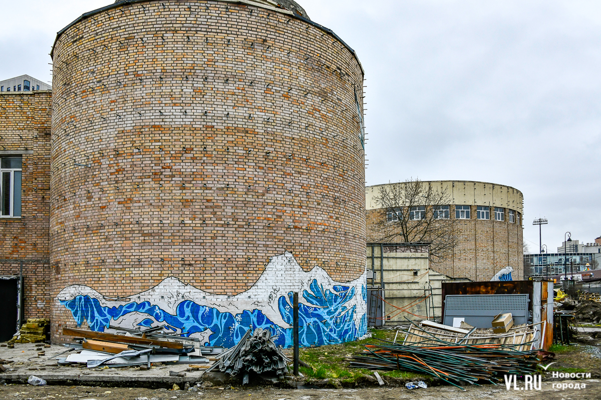 Рабочие, которые реконструируют здание океанариума на Батарейной во Владивостоке, сняли с него плиты обшивки. Под ними обнаружился нанесённый примерно 15 лет назад рисунок морских волн, дельфина и летящих чаек, о котором многие успели позабыть, так долго оно было закрыто фасадом.
