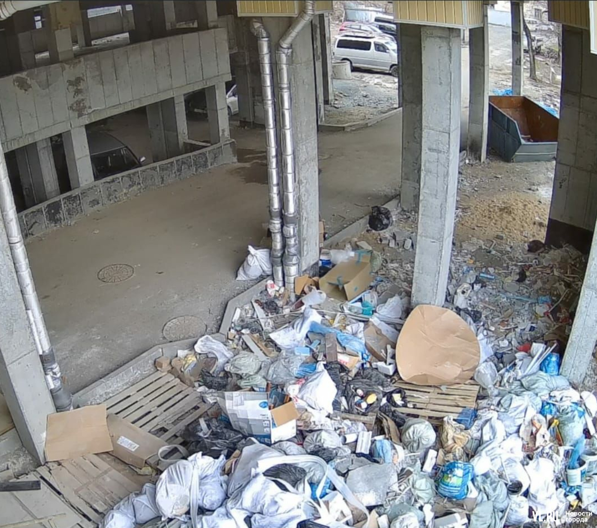 Картина «до» выглядит и правда удручающе – территория у парковки похожа на мусорную свалку, на которой валяются паллеты, упаковки от строительных смесей и мешки с мусором. С другой стороны лежат уже обычные бытовые отходы, которые жители соседних бараков просто перекидывают через перила, вероятно, зная, что дом потихоньку заселяется.