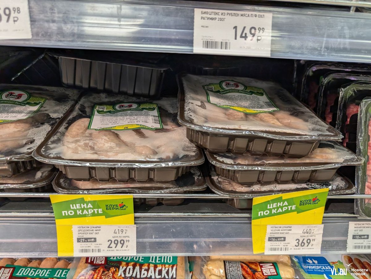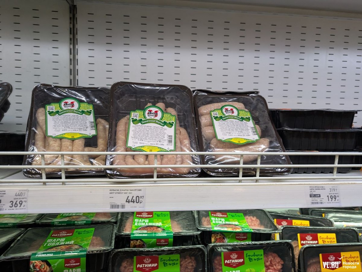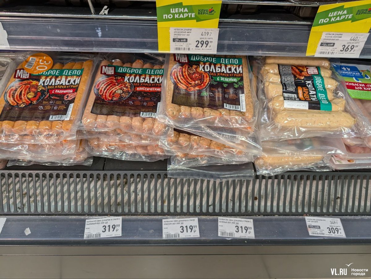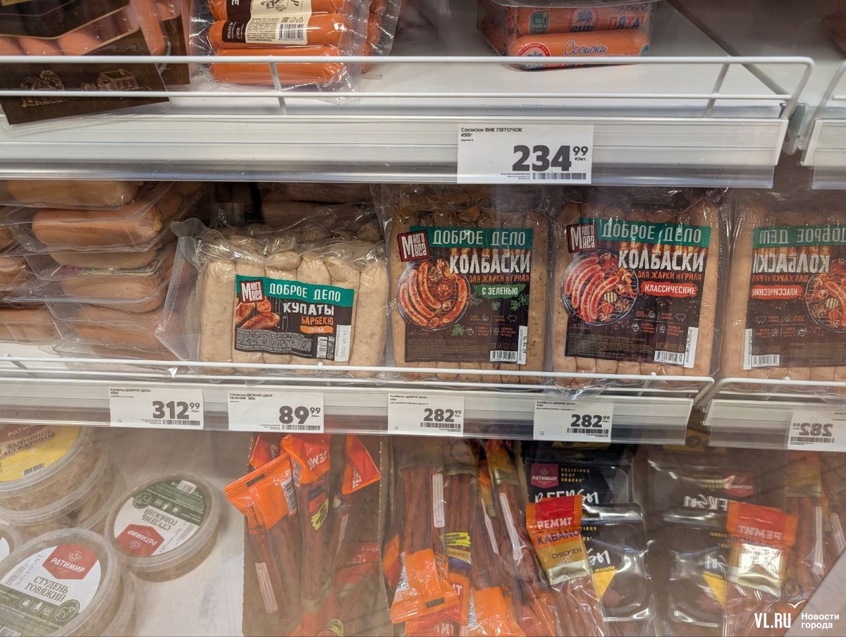 Для разнообразия мы берём купаты или колбаски для жарки. Они продаются в упаковках примерно по полкило и стоят от 239 до 540 рублей.