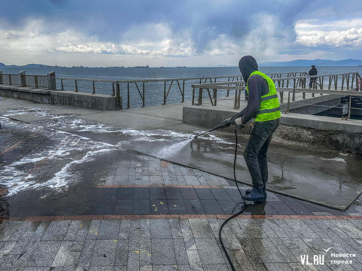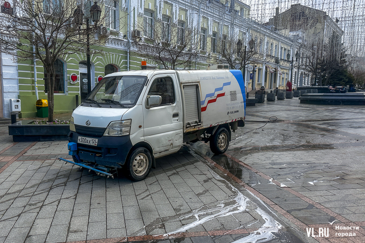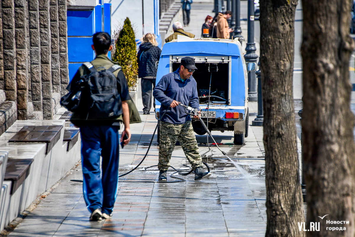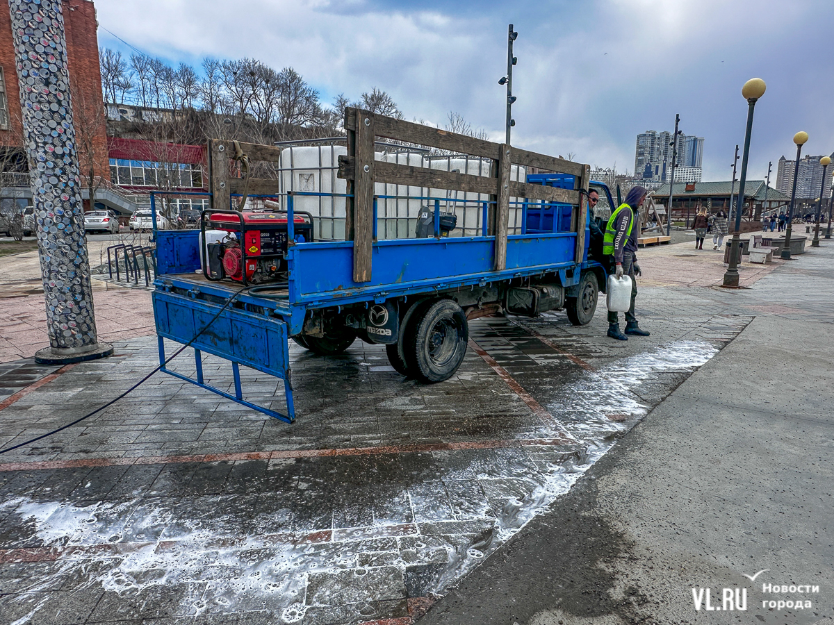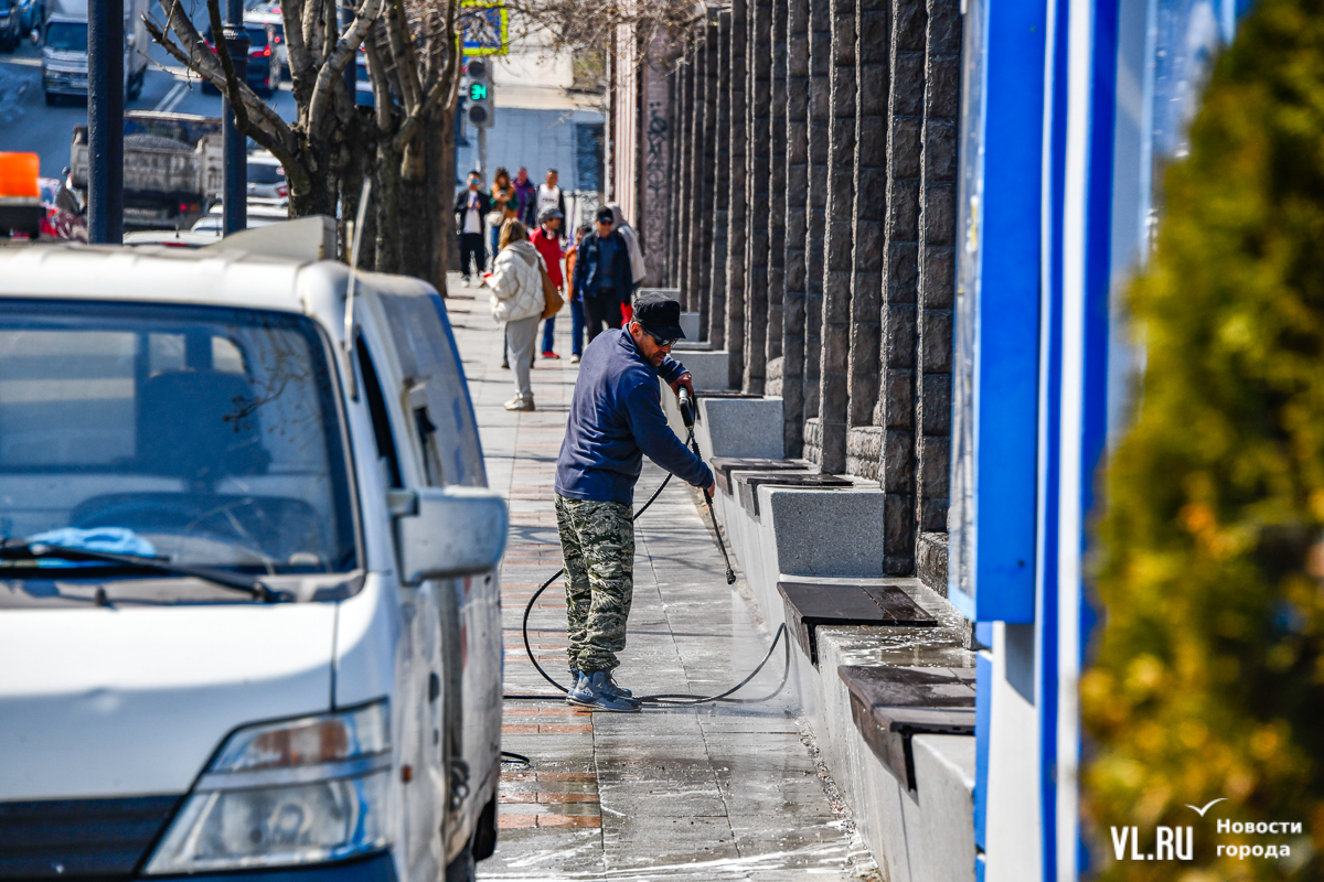 В центре Владивостока с наступлением тепла начали приводить в порядок тротуары и пешеходные дорожки. Пока на улицах работает две бригады по два человека в каждой, они отмывают набережную Спортивной гавани и улицу Адмирала Фокина. Передвигаются они на специальных машинах, оборудованных водным насосом и канистрами с шампунем. Пока один рабочий следит за уровнем воды в баке и управляет машиной, другой, вооружившись «Кёрхером», отмывает улицу от песка, грязи и строительного масла. Корреспондент Новостей VL.ru тоже попробовал помыть тротуар и узнал, что это похоже на мойку машины, главное – не обрызгать себя и прохожих.