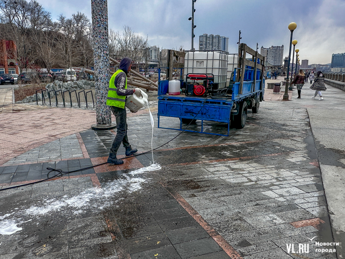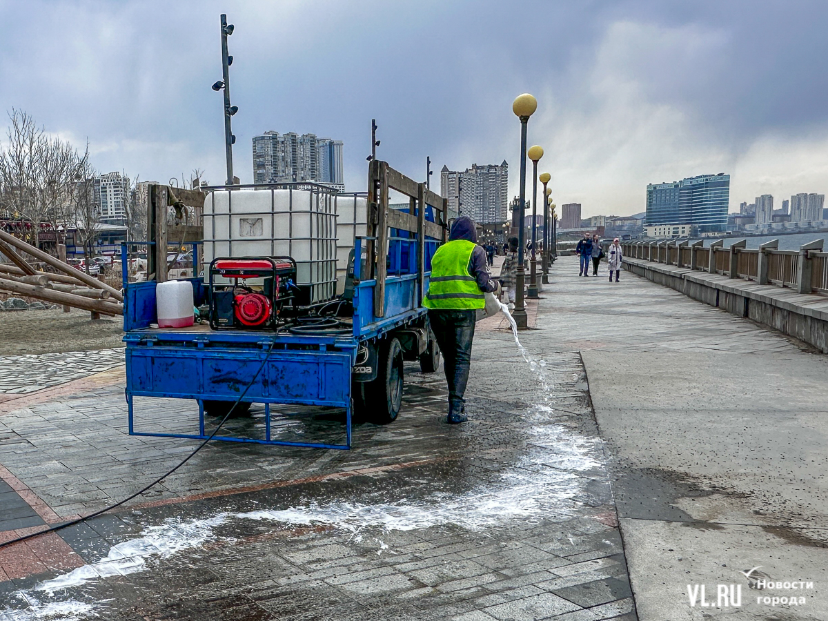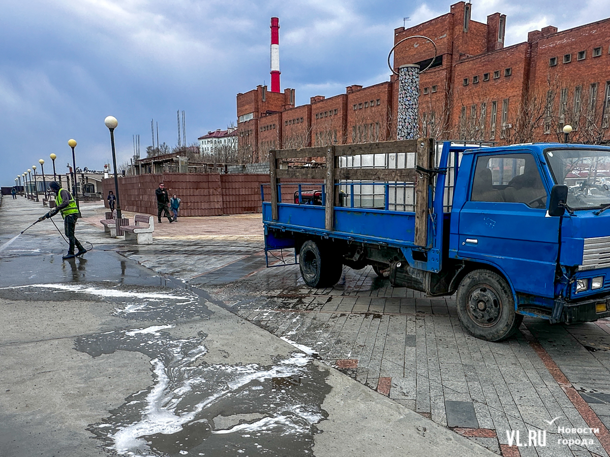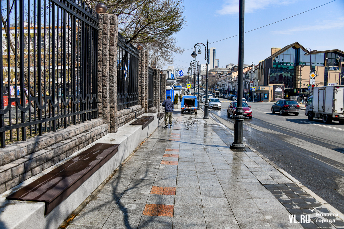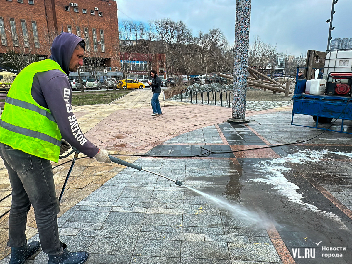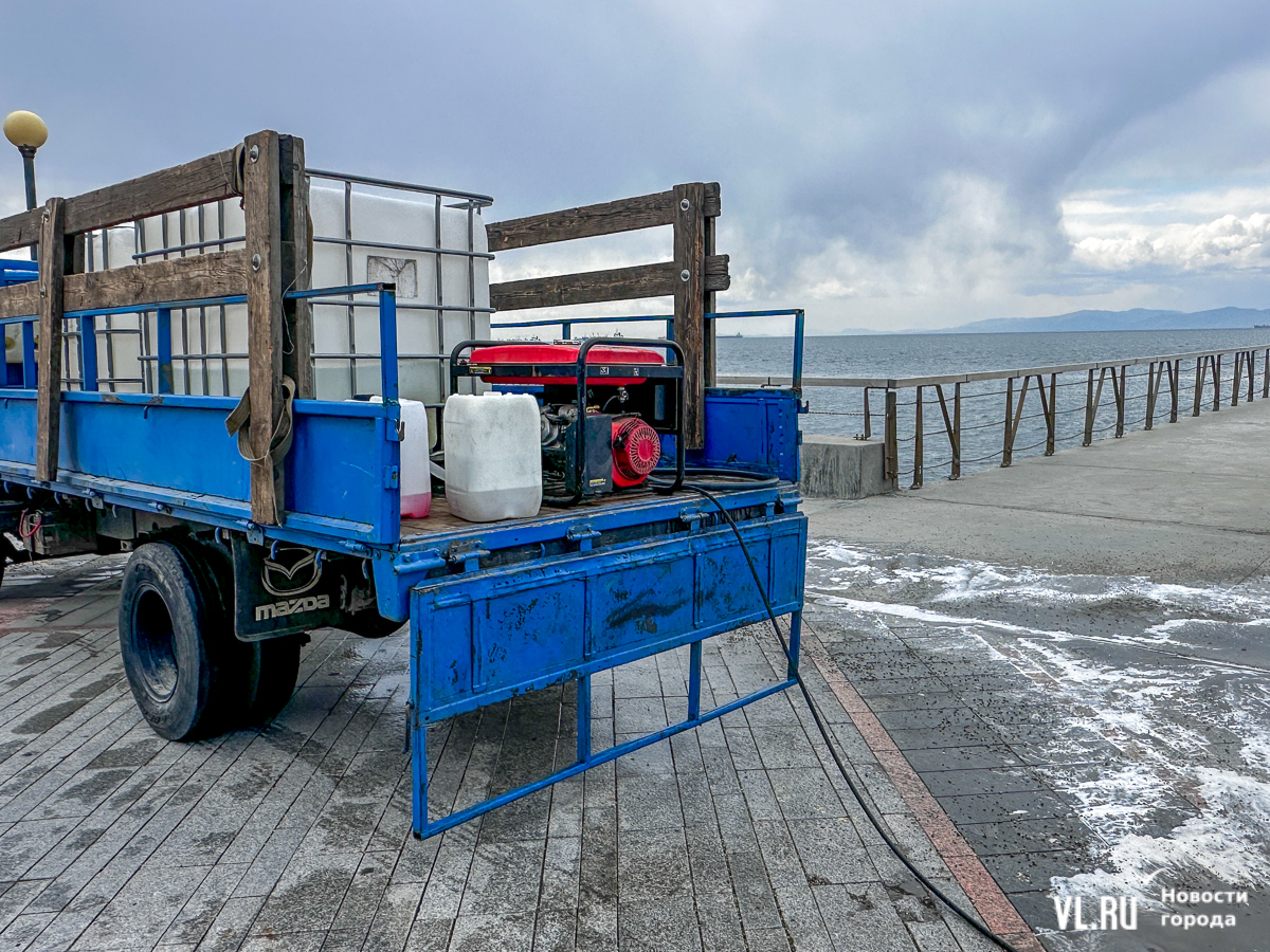 В центре Владивостока с наступлением тепла начали приводить в порядок тротуары и пешеходные дорожки. Пока на улицах работает две бригады по два человека в каждой, они отмывают набережную Спортивной гавани и улицу Адмирала Фокина. Передвигаются они на специальных машинах, оборудованных водным насосом и канистрами с шампунем. Пока один рабочий следит за уровнем воды в баке и управляет машиной, другой, вооружившись «Кёрхером», отмывает улицу от песка, грязи и строительного масла. Корреспондент Новостей VL.ru тоже попробовал помыть тротуар и узнал, что это похоже на мойку машины, главное – не обрызгать себя и прохожих.