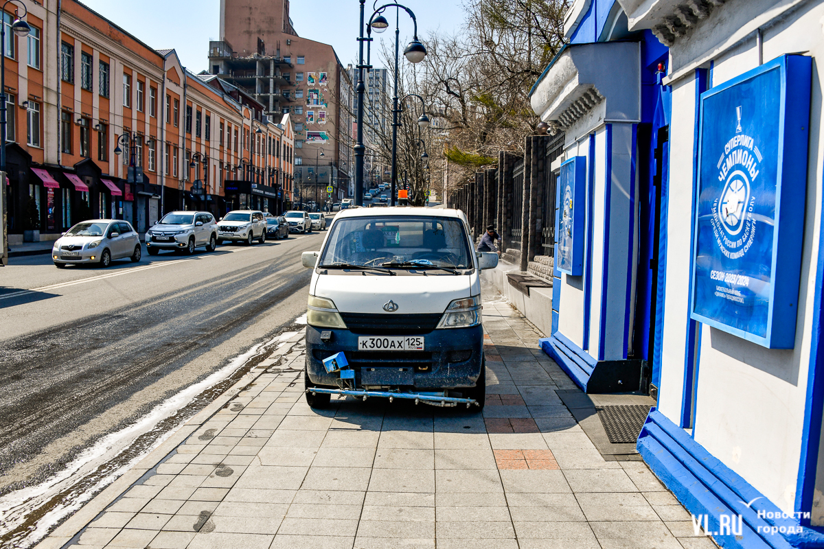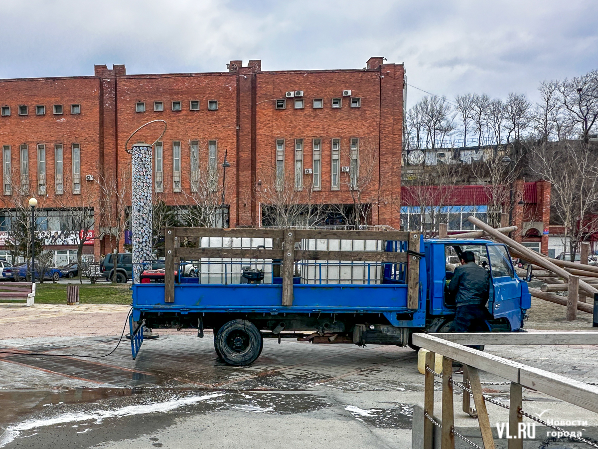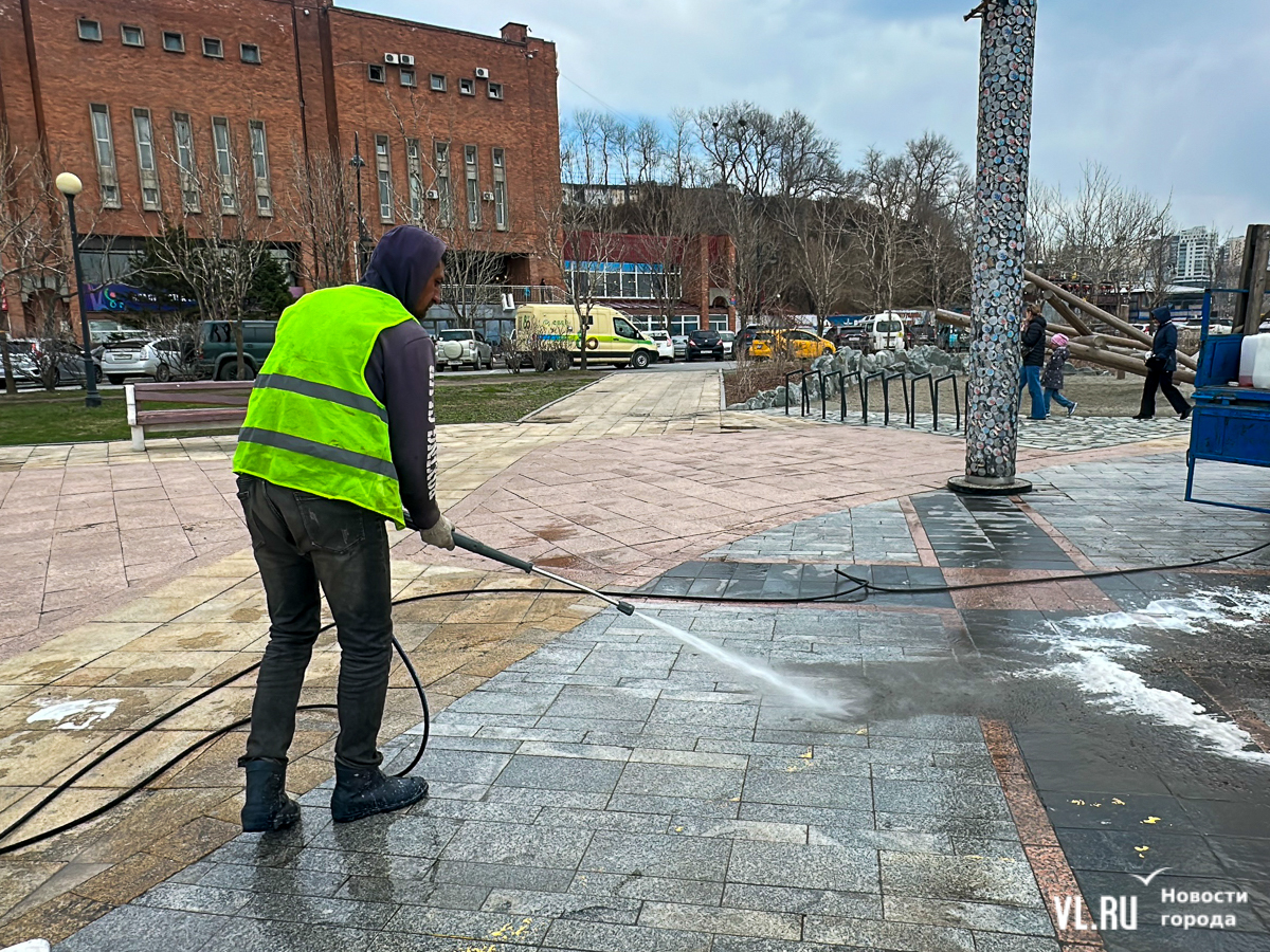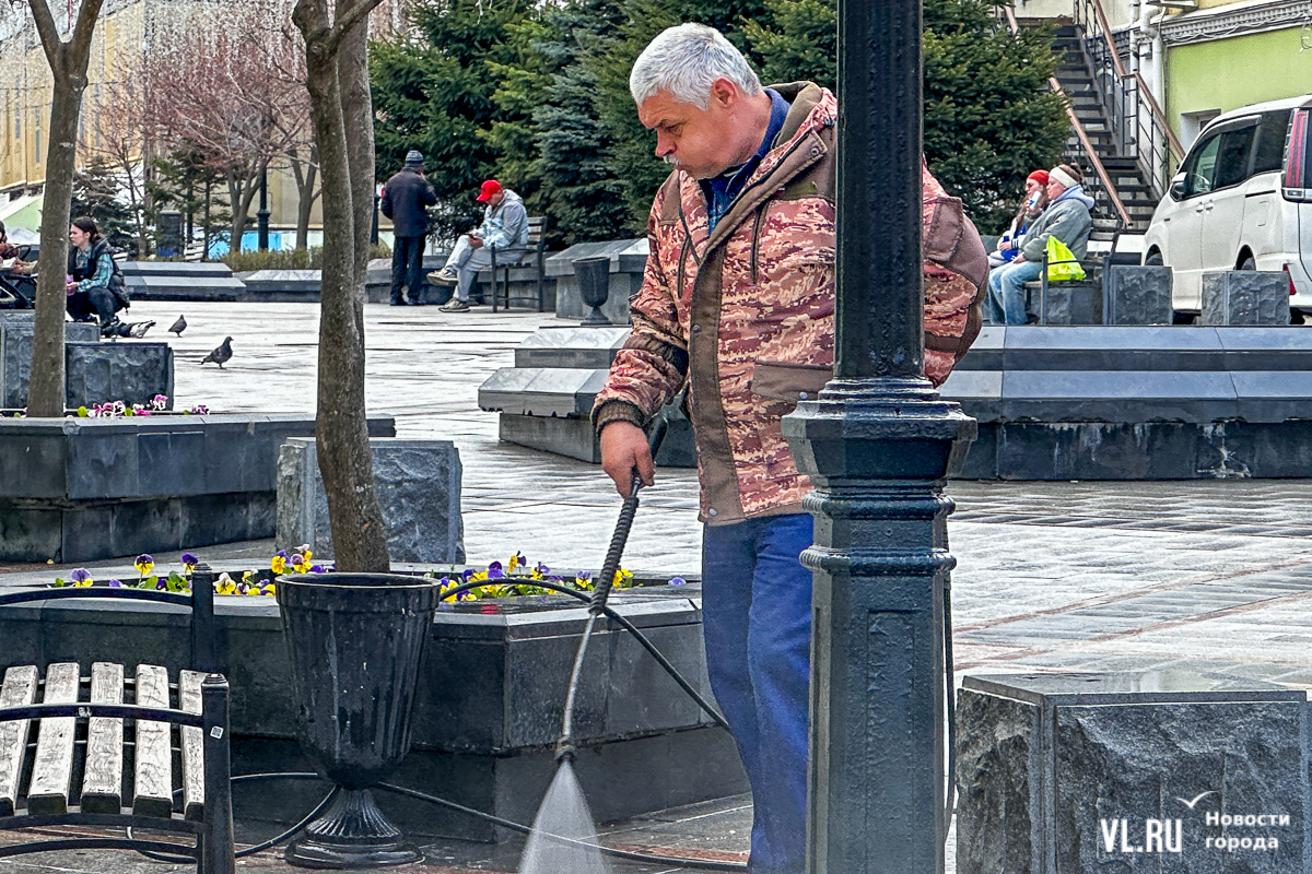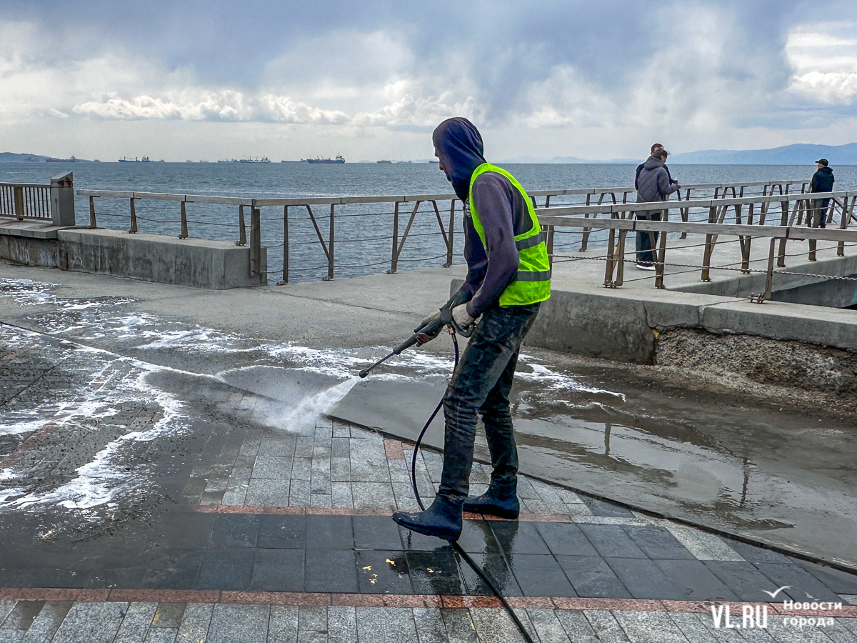 В центре Владивостока с наступлением тепла начали приводить в порядок тротуары и пешеходные дорожки. Пока на улицах работает две бригады по два человека в каждой, они отмывают набережную Спортивной гавани и улицу Адмирала Фокина. Передвигаются они на специальных машинах, оборудованных водным насосом и канистрами с шампунем. Пока один рабочий следит за уровнем воды в баке и управляет машиной, другой, вооружившись «Кёрхером», отмывает улицу от песка, грязи и строительного масла. Корреспондент Новостей VL.ru тоже попробовал помыть тротуар и узнал, что это похоже на мойку машины, главное – не обрызгать себя и прохожих.