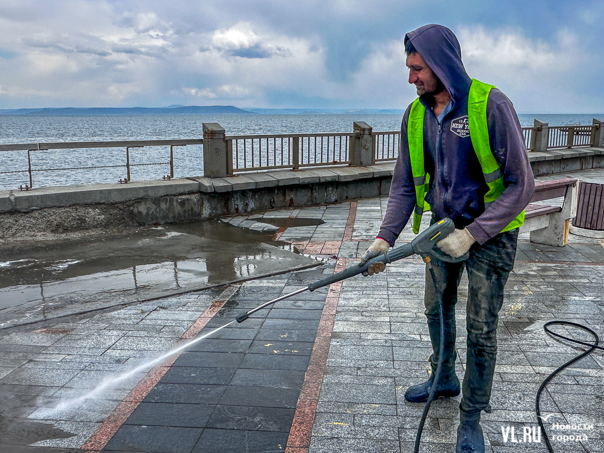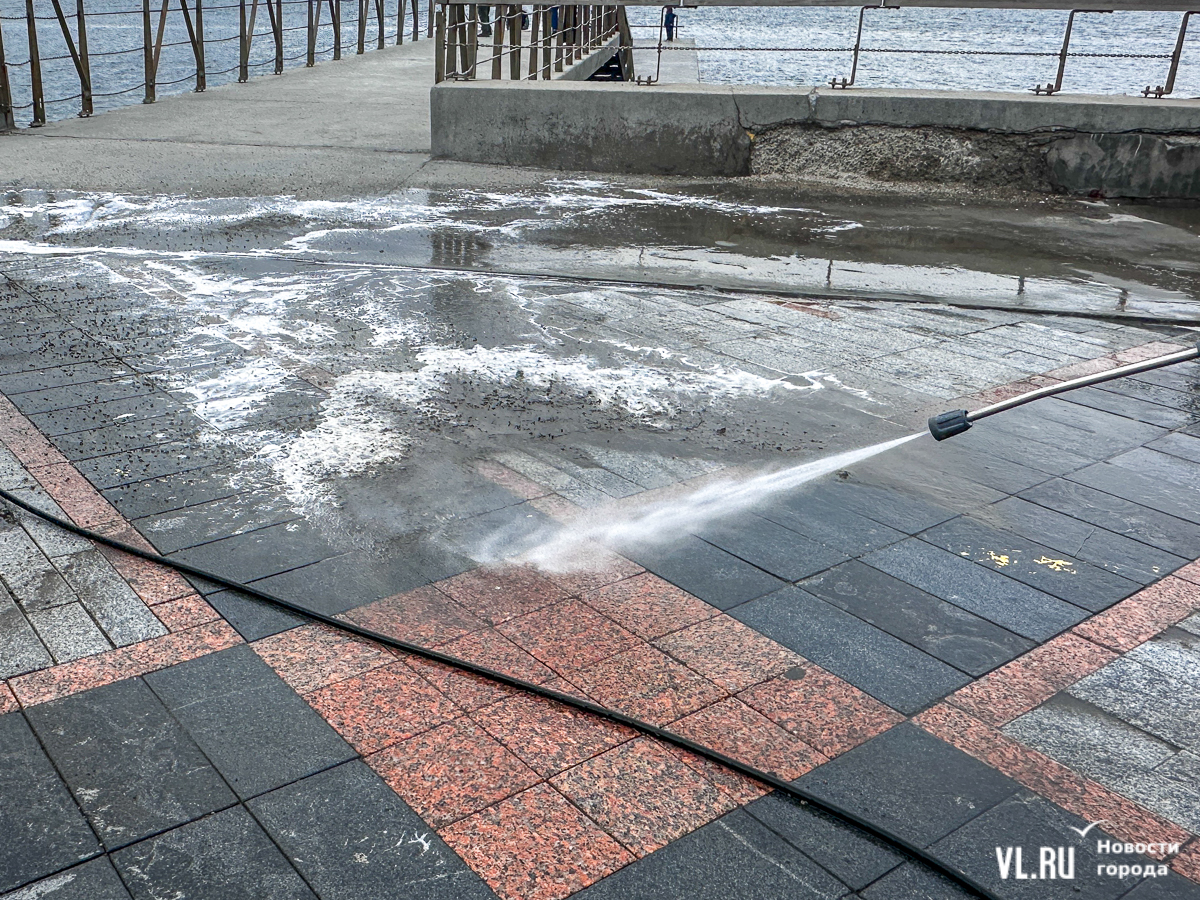 Попробовал отмыть дорогу от песка и корреспондент Новостей VL.ru. Делать не очень сложно, главное – выбрать правильный угол, чтобы «согнать» пену с песком в нужное место и при этом не обрызгать проходящих мимо людей. Осложняет дело покрытие набережной: не вся она идеально гладкая, на ней есть места с провалами и углублениями, где скапливается много воды. Нашему корреспонденту посоветовали стараться делать так, чтобы в ямках либо воды не оставалось совсем, либо она была чистая и без пены.
