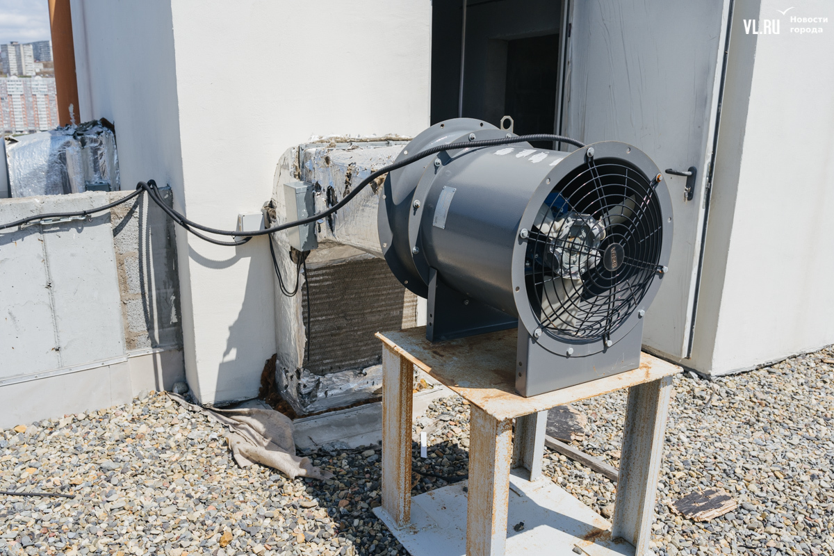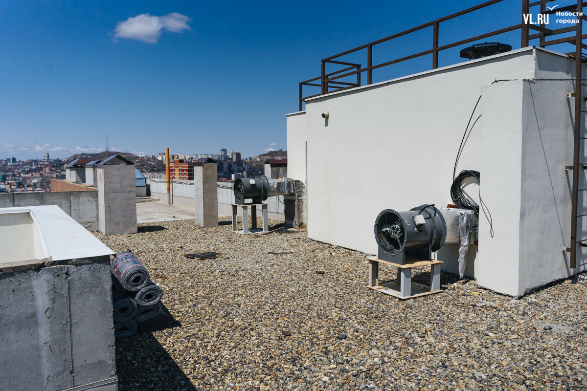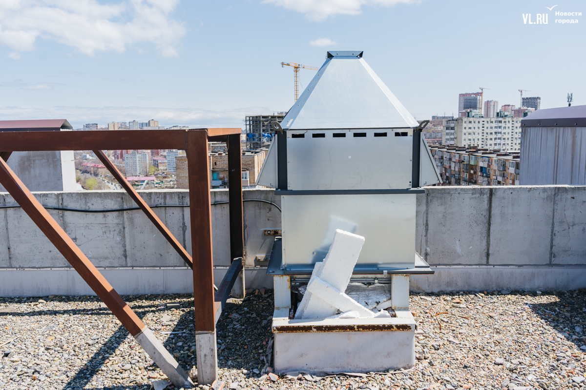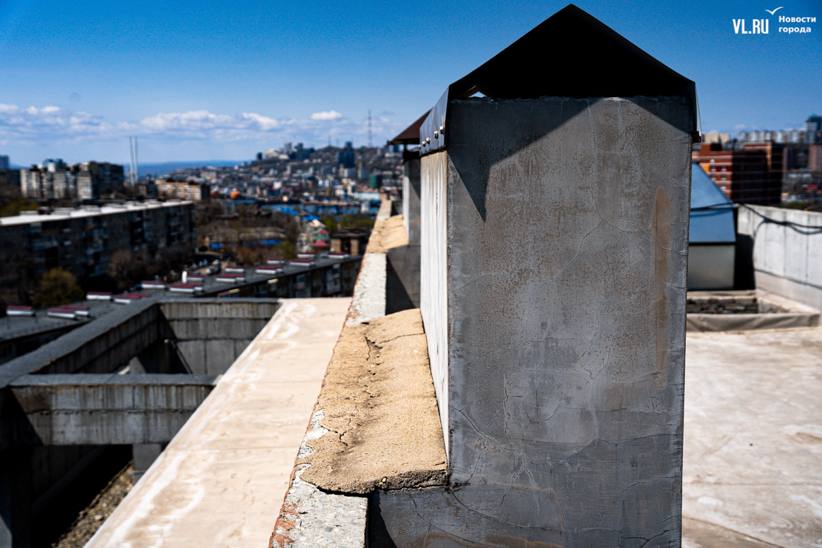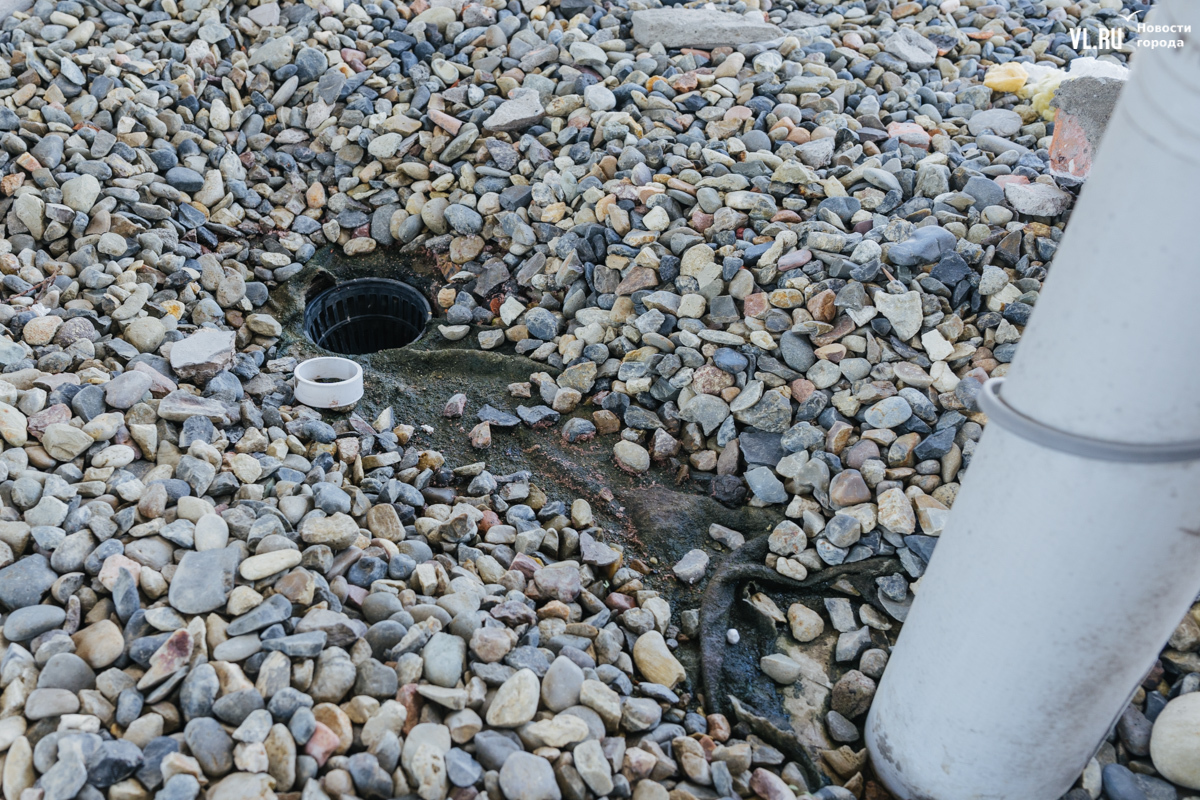Оказываемся на проблемной крыше, к которой нас проводит ещё одна жительница дома. Вид с крыши открывается очень красивый – на недавно благоустроенное озеро. Но вот сама она сделана, мягко говоря, с недочётами, из-за которых протекает и затапливает не только лифт, но и несколько верхних этажей – говорят, вплоть до восьмого.