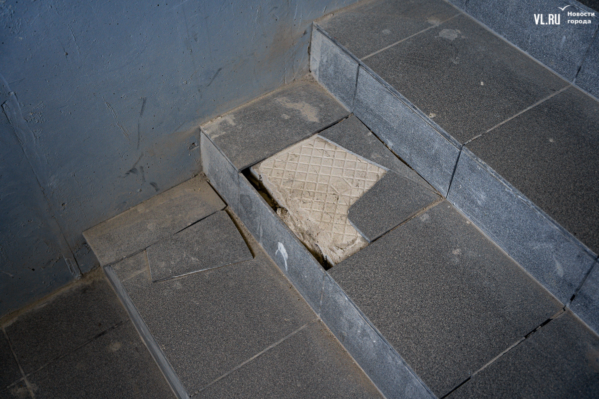Через подъезды снова спускаемся к лифту. Подъезды внутри выглядят так, будто ремонт ещё продолжается. Стены – просто выкрашенный в белый цвет кирпич, где-то торчат коммуникации, где-то разбиты откосы, потолки просто голые, с трубами. Сергей шутит, что подъезды выполнены в «стиле лофт». На лестницах уже обвалилась плитка. Местные жители думают, что стены придётся отделывать, плитку, вероятно, тоже менять – за свои деньги.