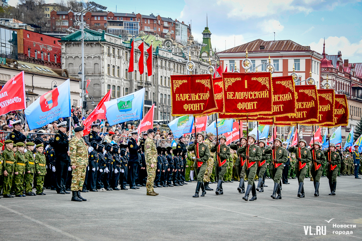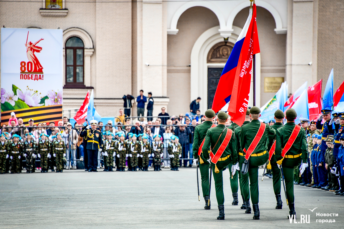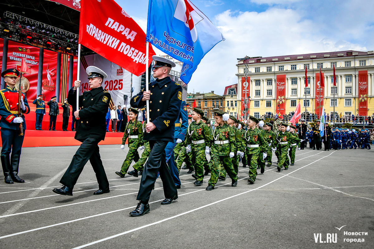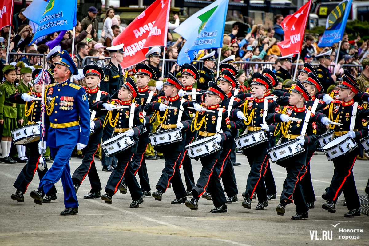 «Равнение направо, шагом марш!» – отряд барабанщиков Уссурийского суворовского военного училища задал темп и ритм всем 50 парадным расчётам. На центральную площадь Владивостока вынесли государственный флаг и знамя Победы, макеты штандартов фронтов Великой Отечественной войны. Парад «Правнуки Победы» открыт.